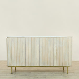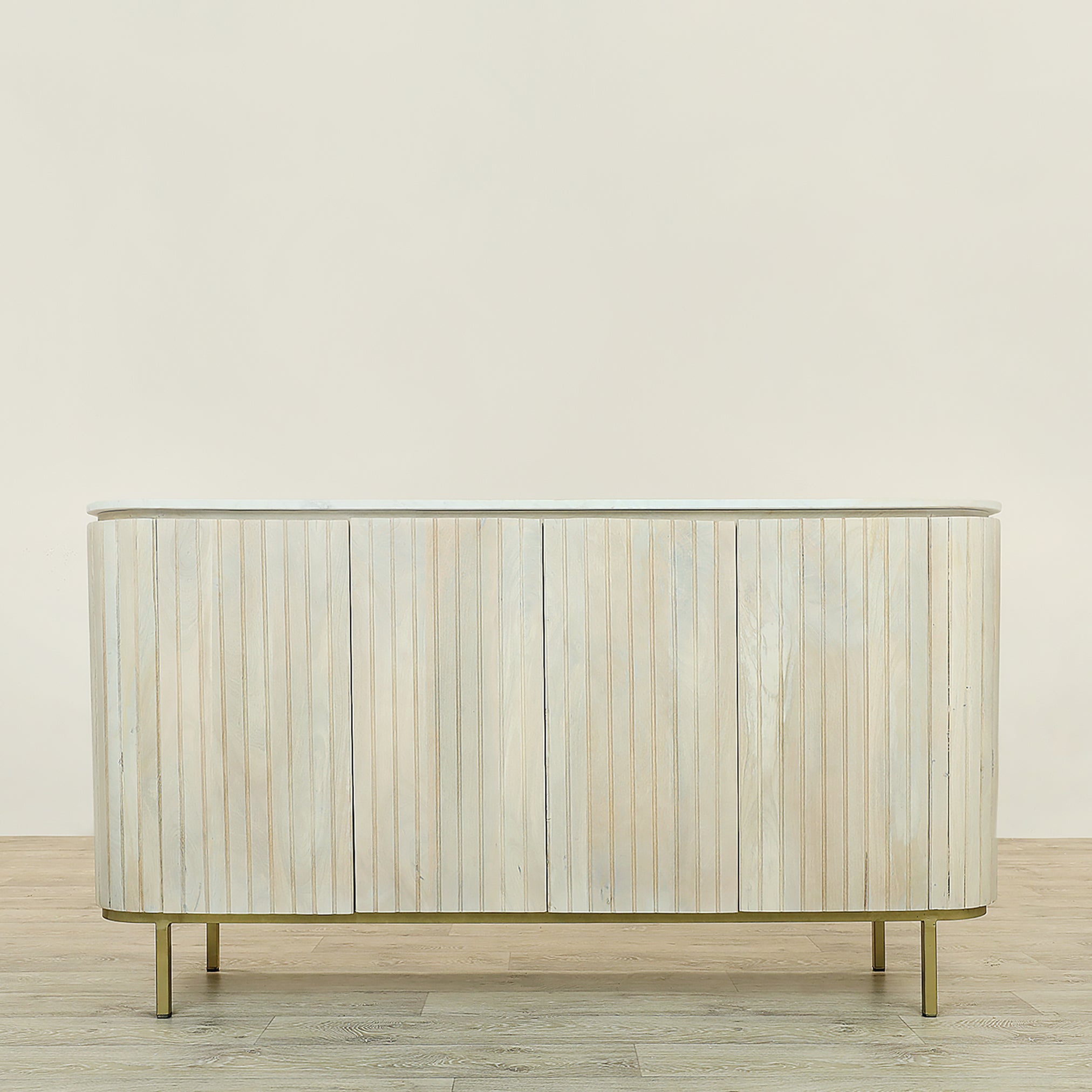 This mid-century-inspired sideboard is a sophisticated blend of classic and contemporary design elements. It features rounded edges that evoke a sense of timeless elegance, while vertical detailing adds visual interest. The top is crafted from pristine white marble, perfectly complemented by the sleek iron accents. The sideboard offers ample storage with four doors that open to reveal an interior shelf, which is ideal for organizing your essentials. Finished in rich white oak, this piece embodies understated luxury and serves as a stunning focal point in any space.