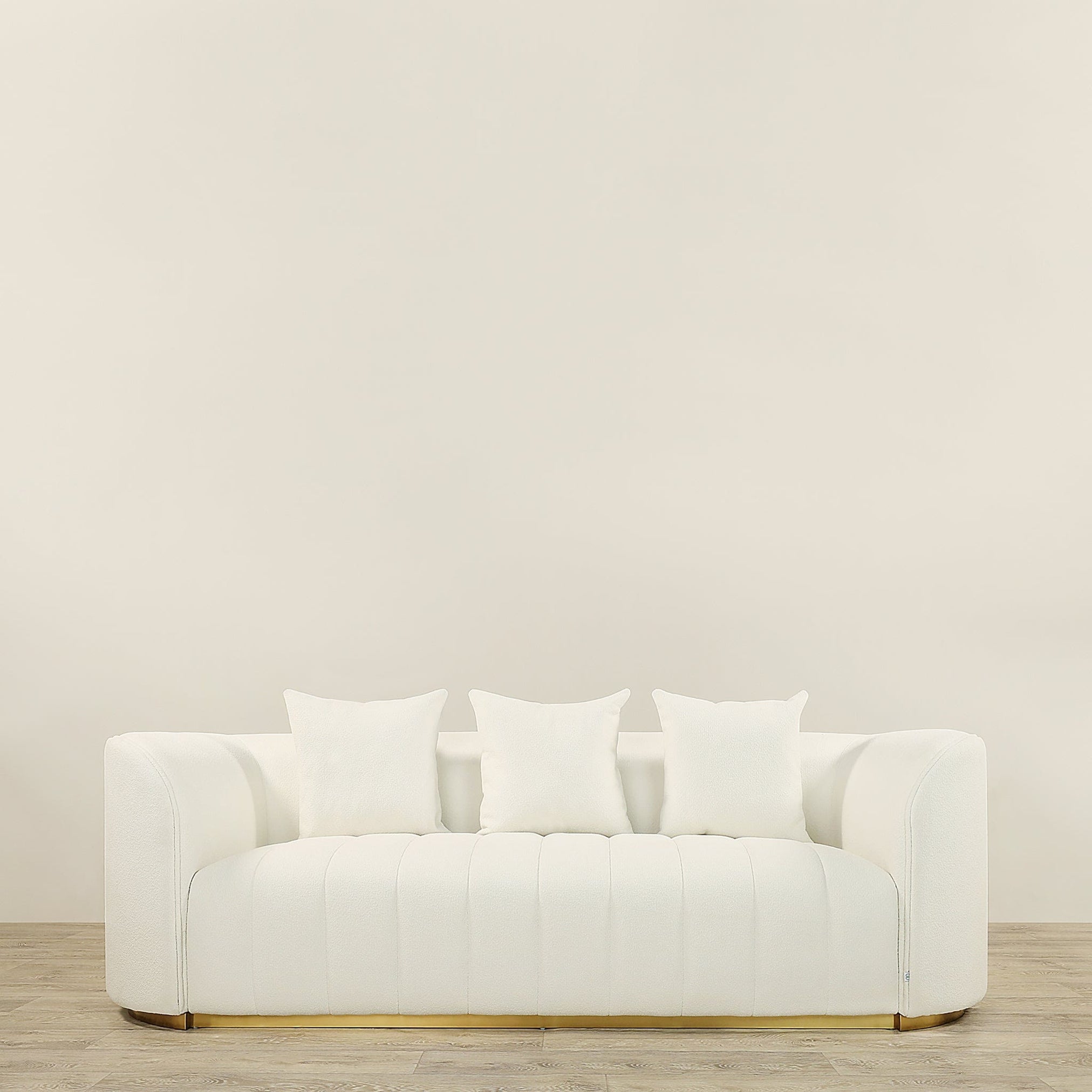 Discover the ultimate in luxury and comfort with the Zane Linen Sofa. This beautiful piece is wrapped in luxurious boucle upholstery that adds a touch of opulence to any room. The sofa features elegantly tapered arms, enhancing its modern, streamlined profile. Beneath the surface, supportive and comfortable cushioning ensures a relaxing seating experience. Complete with 4 accent cushions, the Zane Sofa effortlessly combines comfort and sophistication, making it the perfect centerpiece for an inviting living space.