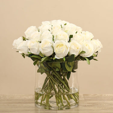 رمز للحب والمودة، تضفي هذه الورود الصناعية الرومانسية لمسة دائمة الجمال. تبرز المزهريّة الزجاجية الطويلة نقاء الأزهار وأوراقها الغنية وسيقانها الخضراء الواقعية.