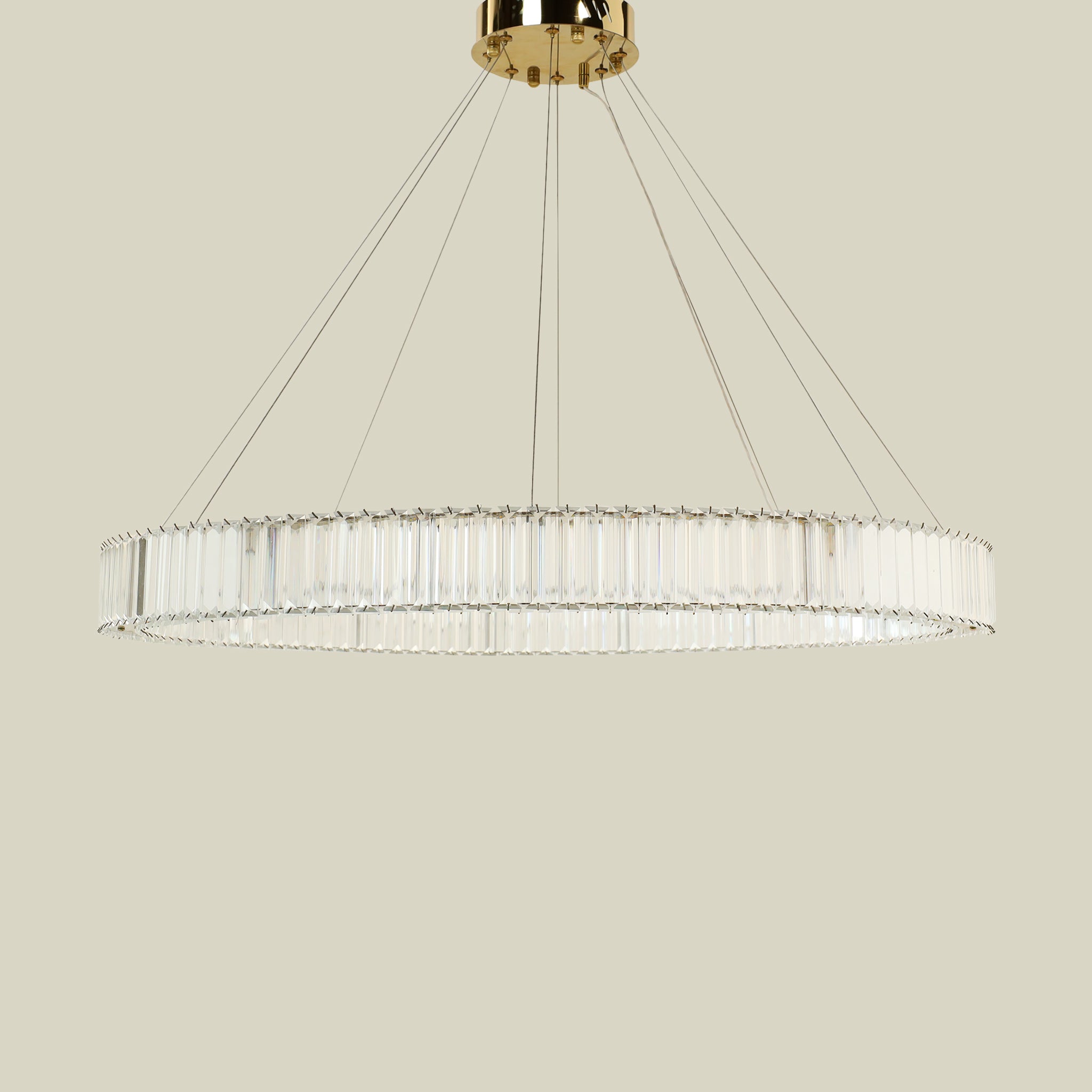 حوّل أجواء منزلك إلى لوحة من الفخامة مع هذه الثريا الذهبية البديعة، المصنوعة من الفولاذ المقاوم للصدأ والمزينة بكريستالات متلألئة تعكس الضوء ببريق ساحر.