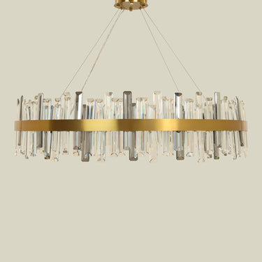 ارتقِ بمساحة معيشتك مع هذه الثريا الذهبية الرائعة، المصنوعة من ستانلس ستيل والمزينة بالكريستالات المتلألئة. صُممت كثريا معلقة للسقف وتجمع بين إضاءة LED عصرية وأناقة خالدة، لتخلق أجواء دافئة ومرحبة. مثالية لتعزيز ديكور منزلك وأثاثك، وتضيف لمسة راقية لأي غرفة.