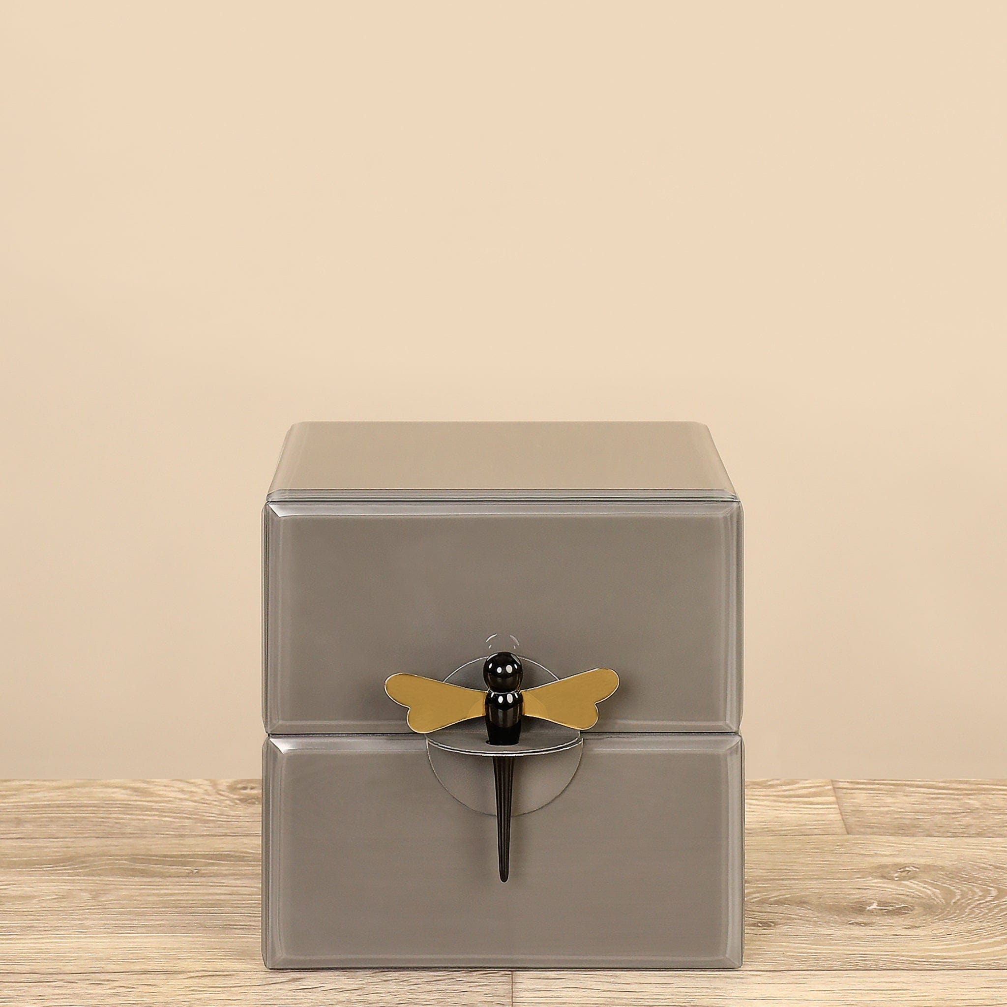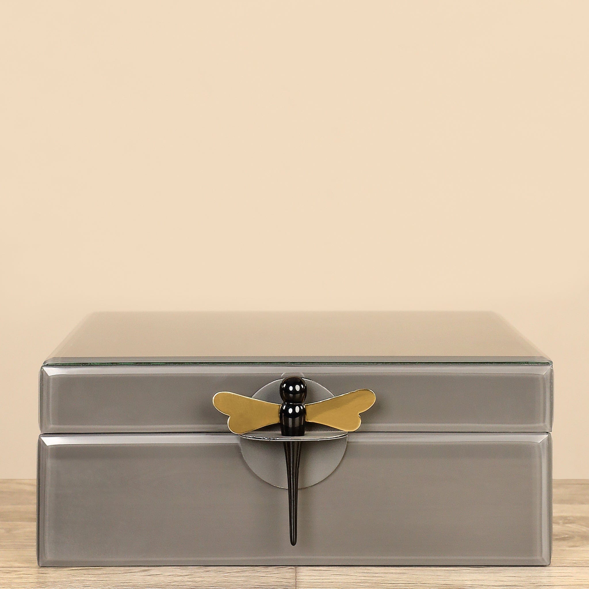 يتميز صندوق المجوهرات الأنيق هذا بلمسة نهائية رمادية لامعة ومريحة، كما يتميز بمشبك على شكل يعسوب مميز يجعله مميزًا. بفضل حجمه المثالي لاستيعاب كل شيء من المجوهرات الثمينة إلى التذكارات العزيزة، يضمن هذا الصندوق الأنيق إضافة جاذبية لأي سطح.