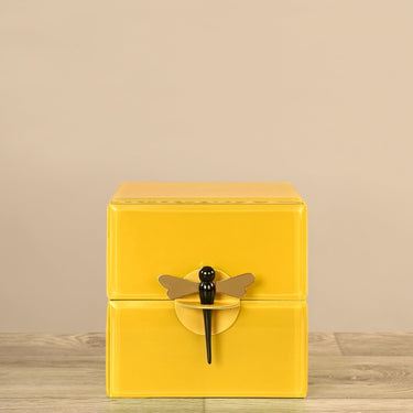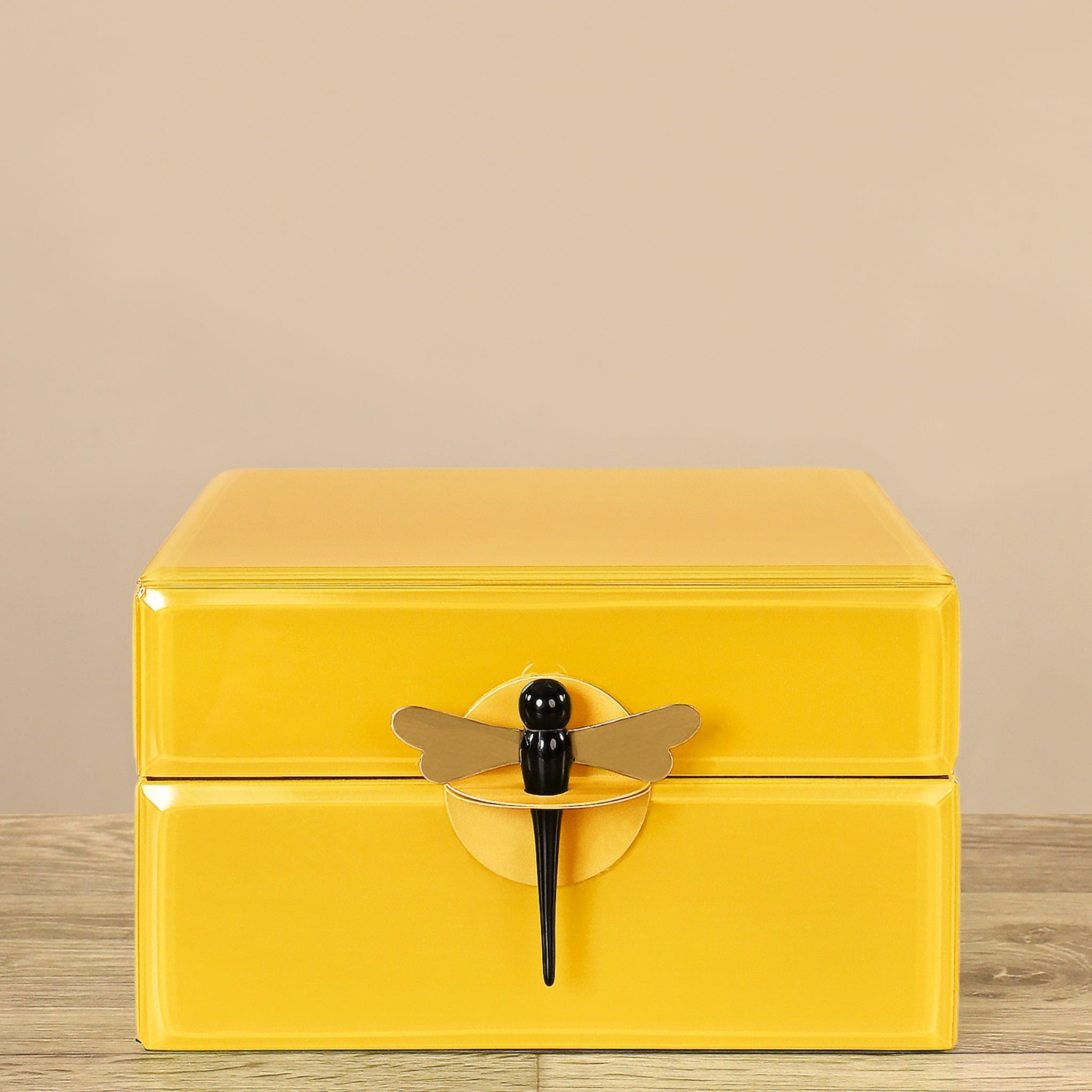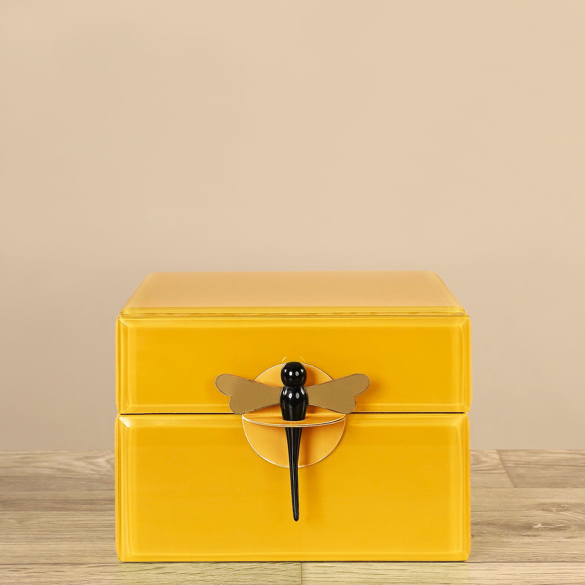 يتميز صندوق المجوهرات الأنيق هذا بلمسة نهائية صفراء خردلية لامعة، ويتميز بمشبك يعسوب مميز يجعله مميزًا. بفضل حجمه المثالي لاستيعاب كل شيء من المجوهرات الثمينة إلى التذكارات العزيزة، من المؤكد أن هذا الصندوق الأنيق سيضيف جاذبية إلى أي سطح.