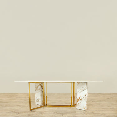 طاولة طعام نافا تتميز بمزيج رائع من المواد. تأتي بأرجل رفيعة من ستانلس ستيل المطلي بالكروم الذهبي مع أرجل أخرى من الرخام الأبيض لدعم سطح مستطيل من الرخام الصناعي ذو زوايا مستديرة بأناقة.