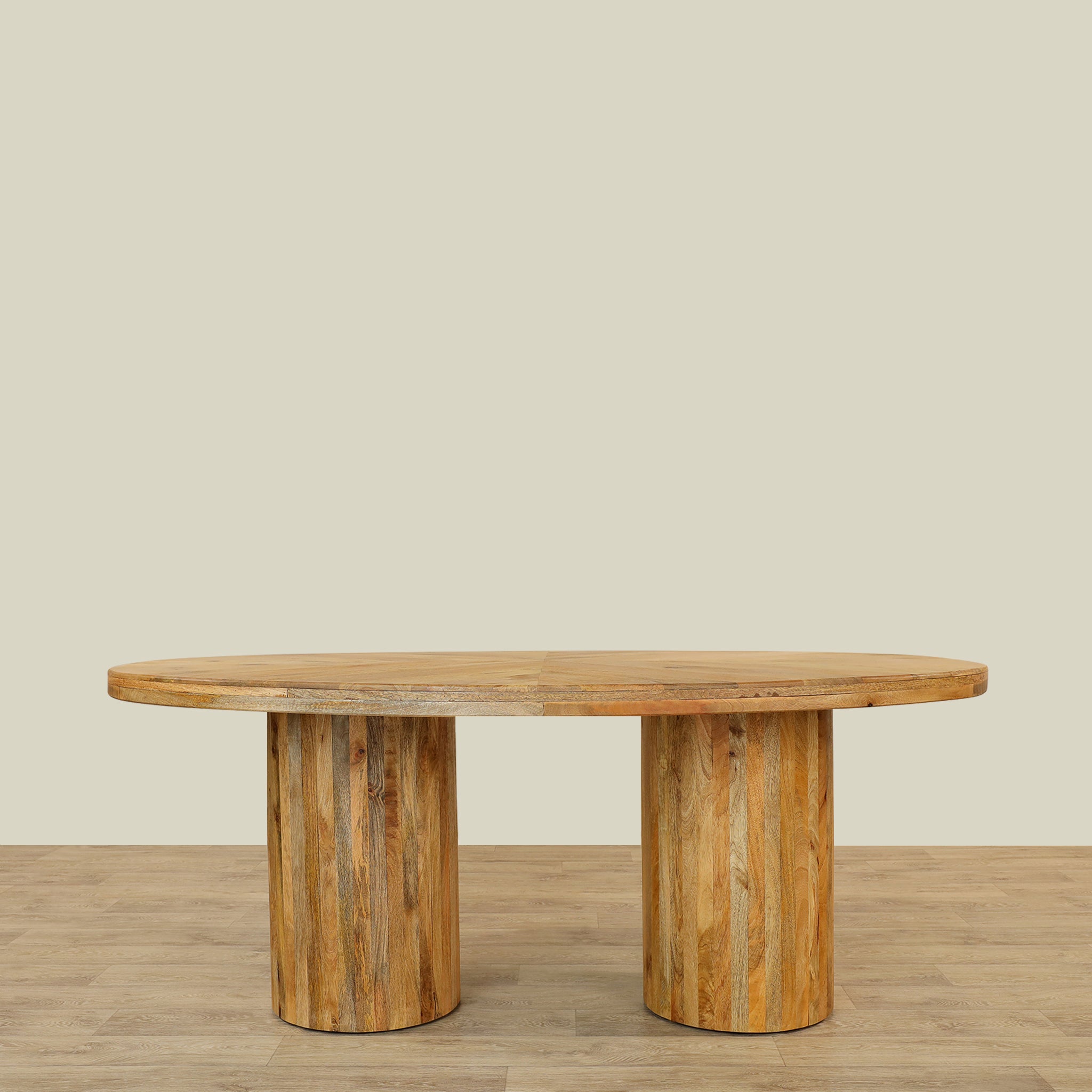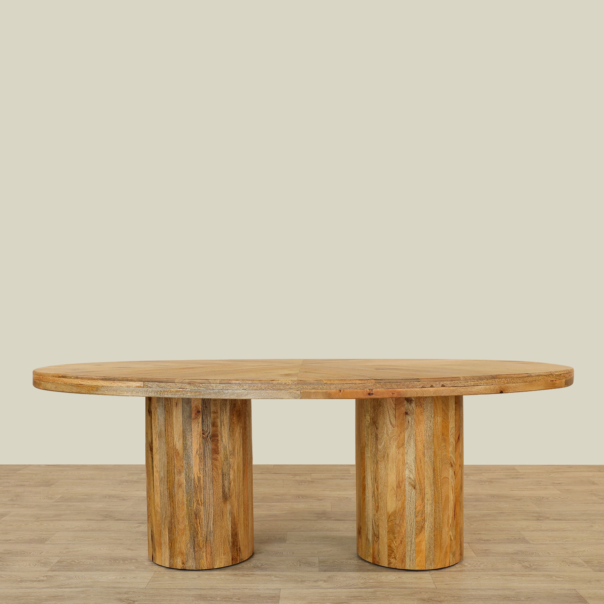Crafted from rich wooden oval sunburst parquetry resting on a sturdy pillar base, this dining table blends timeless elegance with functional design.