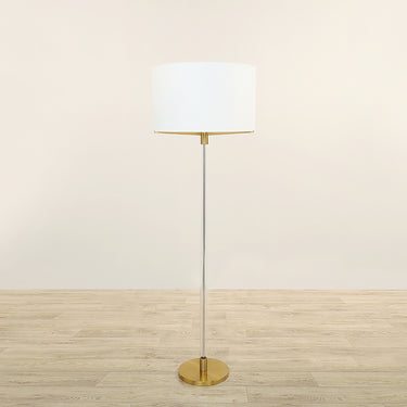 A sturdy base keeps this elegant floor lamp in place for use in any room. Crafted in metal and glass with a modern white fabric drum shade this floor lamp is a versatile fixture for beautiful illumination and chic style.