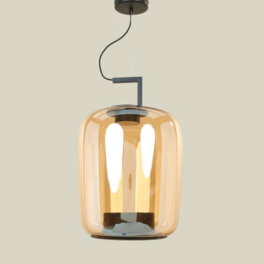 A striking pendant lamp finished in rich emerald green, combining metal and glass construction for timeless elegance.