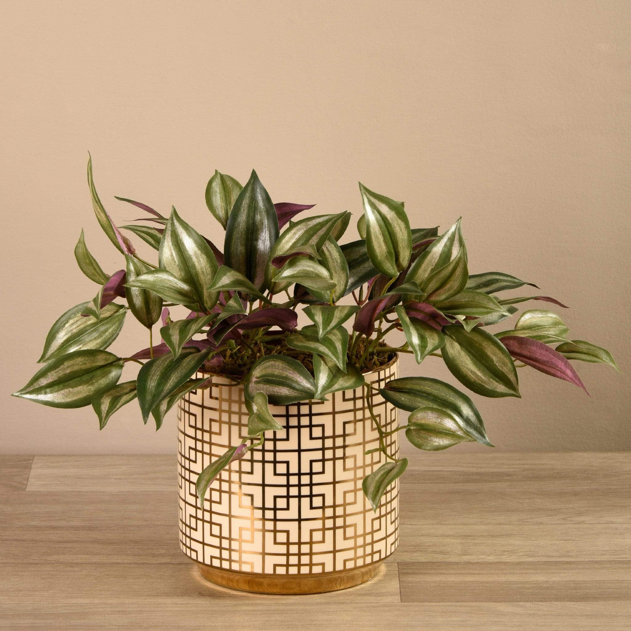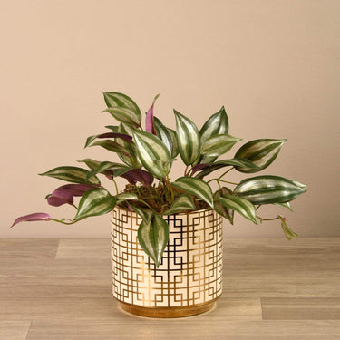 أضف لمسة من الرقة إلى طاولة القهوة أو رف الكتب مع نبتة الفانيليا الصناعية هذه. تبدو أوراقها المخططة باللونين الأخضر والخمري الباهت واقعية للغاية، وتضفي تباينًا جميلاً مع الأصيص المزخرف بنقشة مربعات باللونين الذهبي والكريمي.