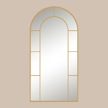 Crafted with a graceful arched shape and windowpane effect our Gold Wall Hanging Mirror is an easy choice for accenting a wall. Ideal in the bedroom over a dresser this contemporary mirror could also be used for lovely sparkle in a living space or entryway. subtle
