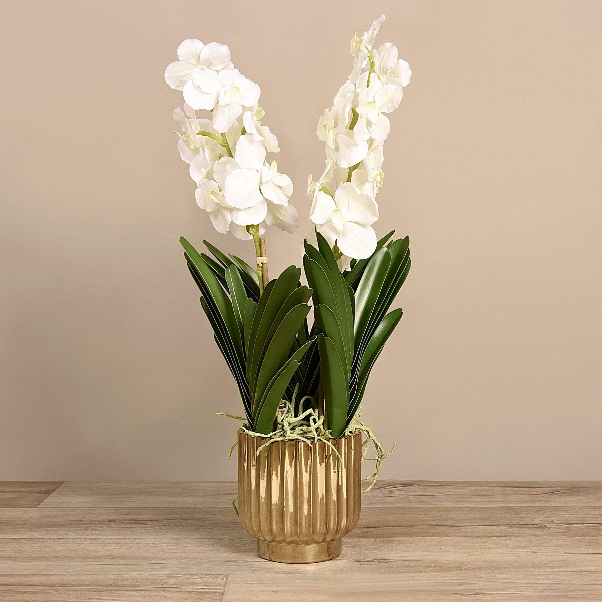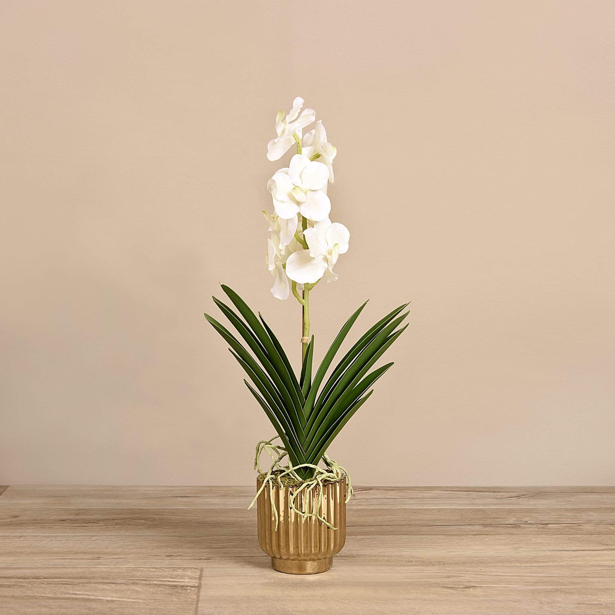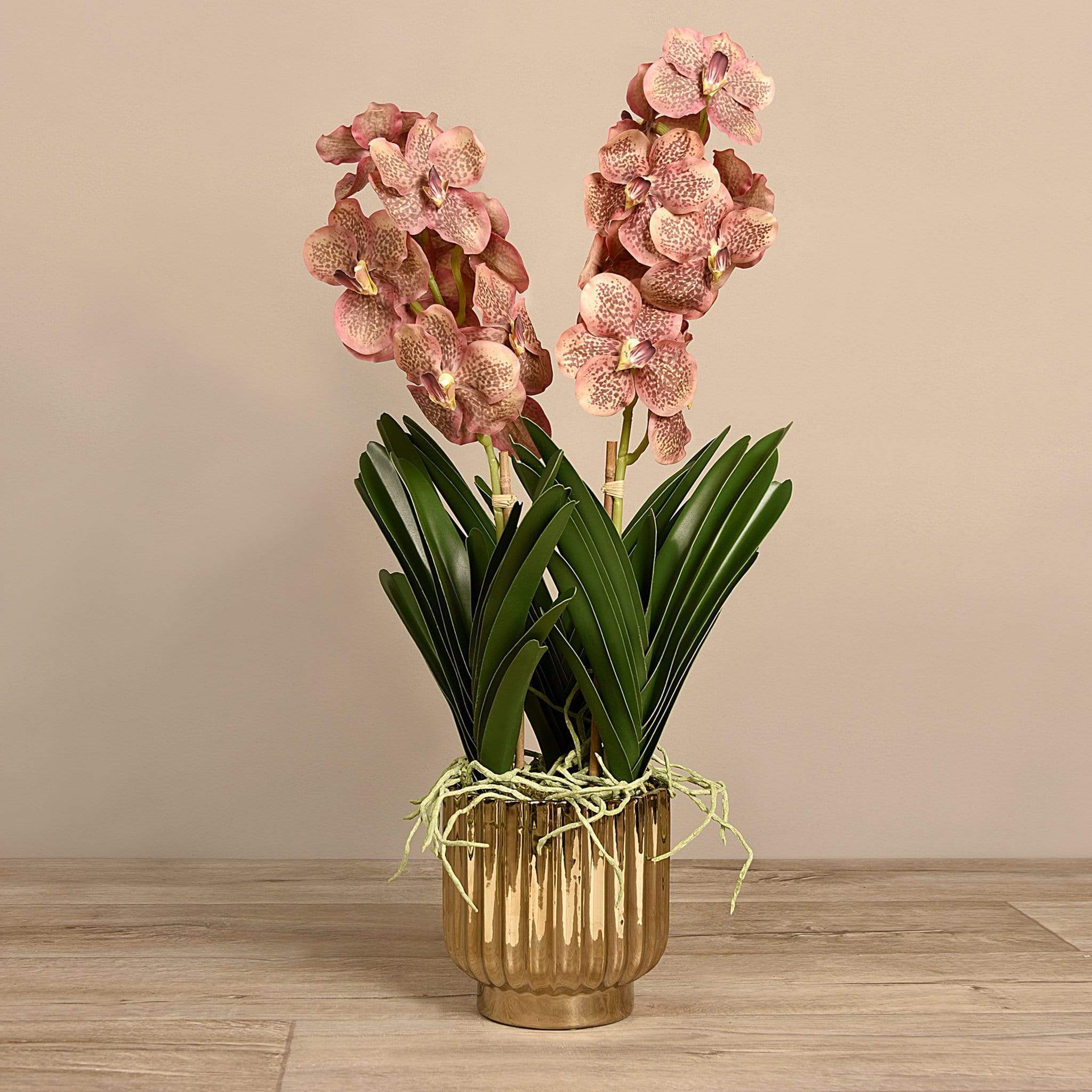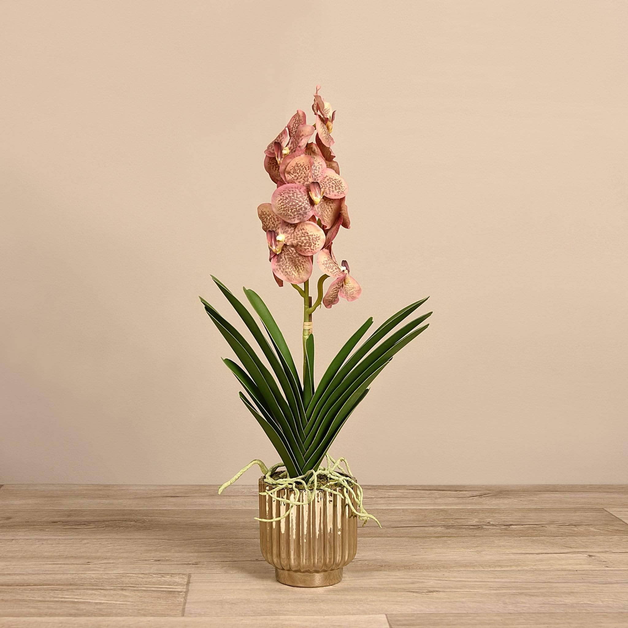 زهور الفاندا رمز الصداقة والإخلاص، لذا فهي تملأ منزلك بمشاعر الراحة والدفء والاطمئنان. تأتيك تشكيلة زهور الفاندا الصناعية البديعة هذه داخل أصيص ذهبي يبرز جمالها، وهي مصنعة ومنسقة بعناية على أيدي منسقي زهورنا المتخصصين لتتمتع بمظهر وملمس طبيعيين تمامًا.