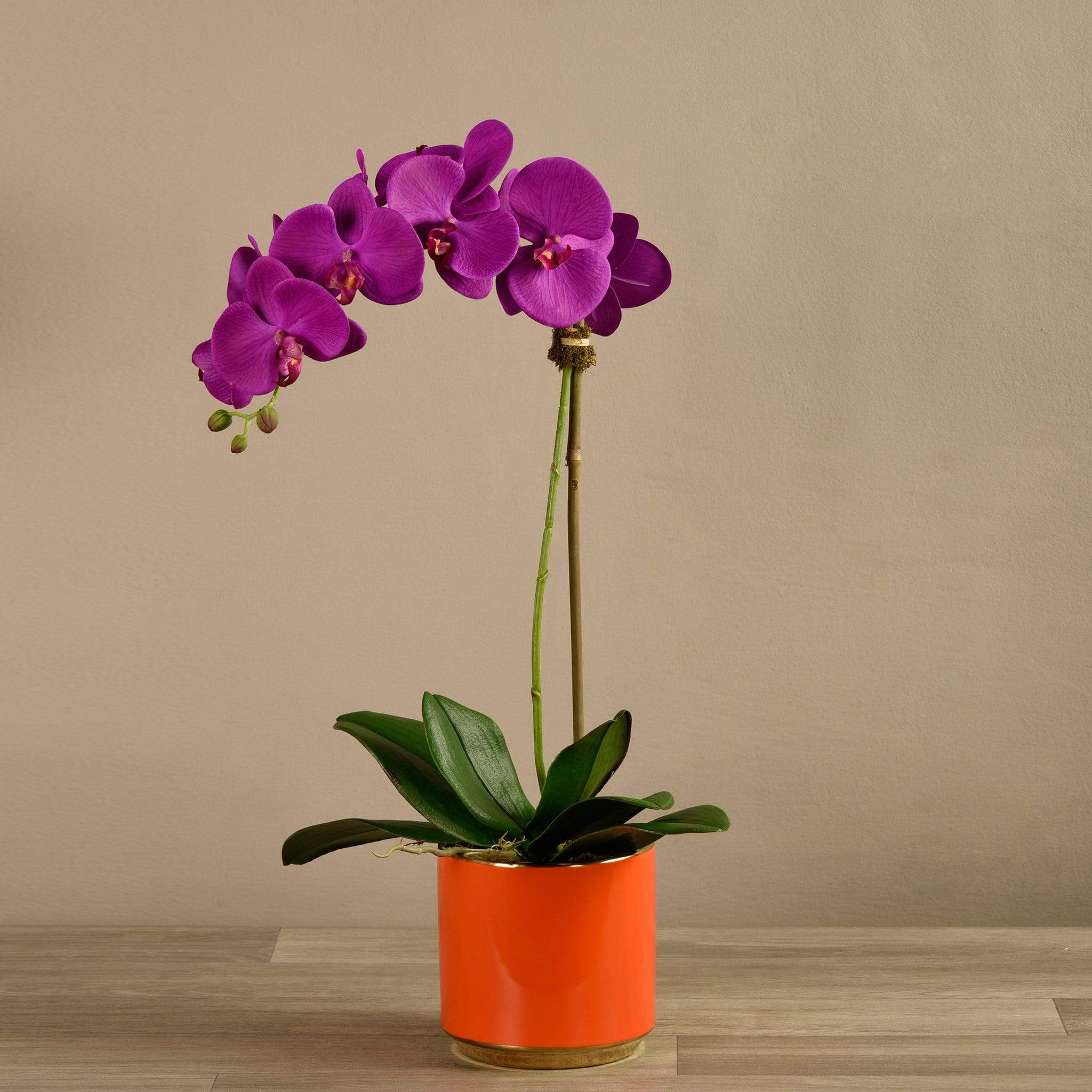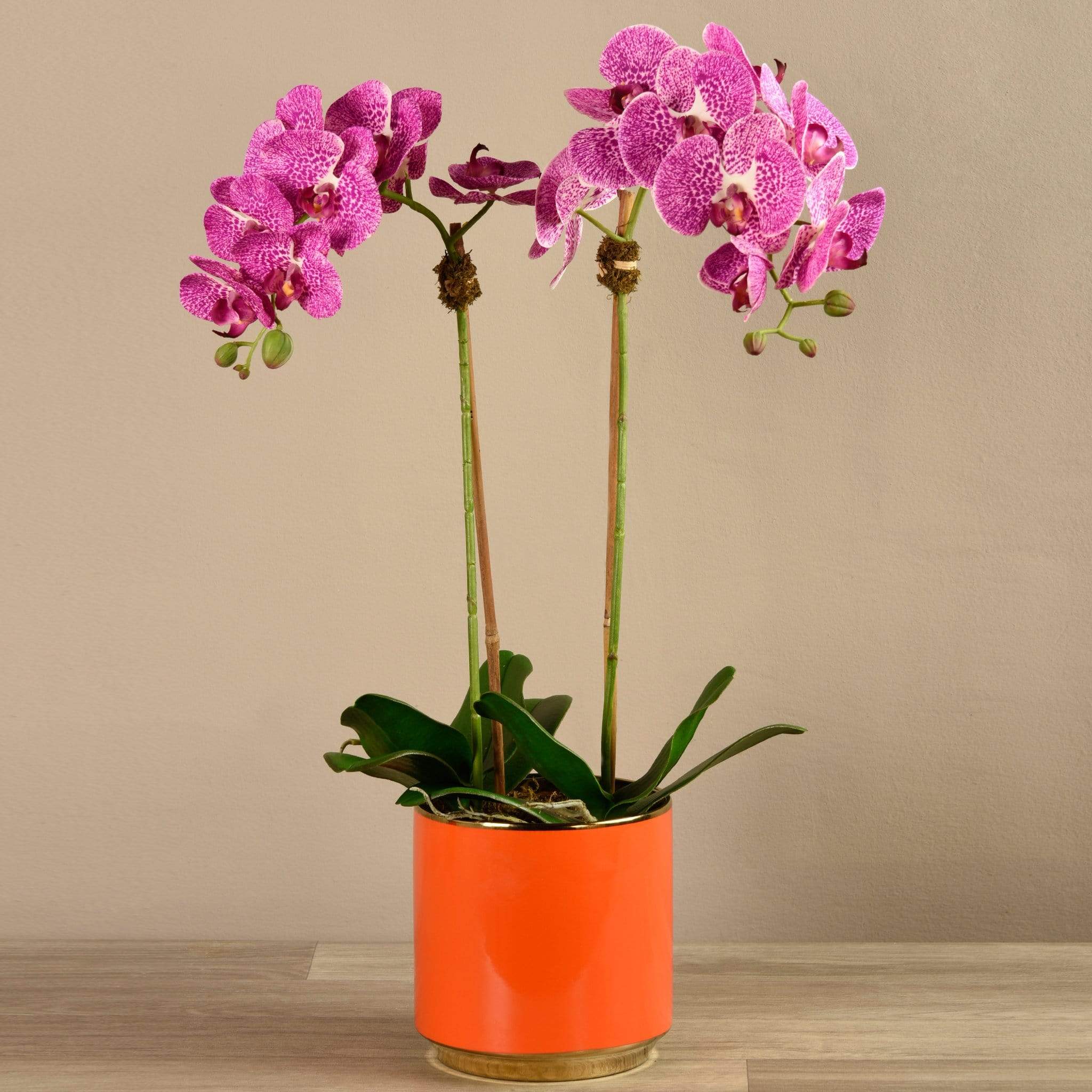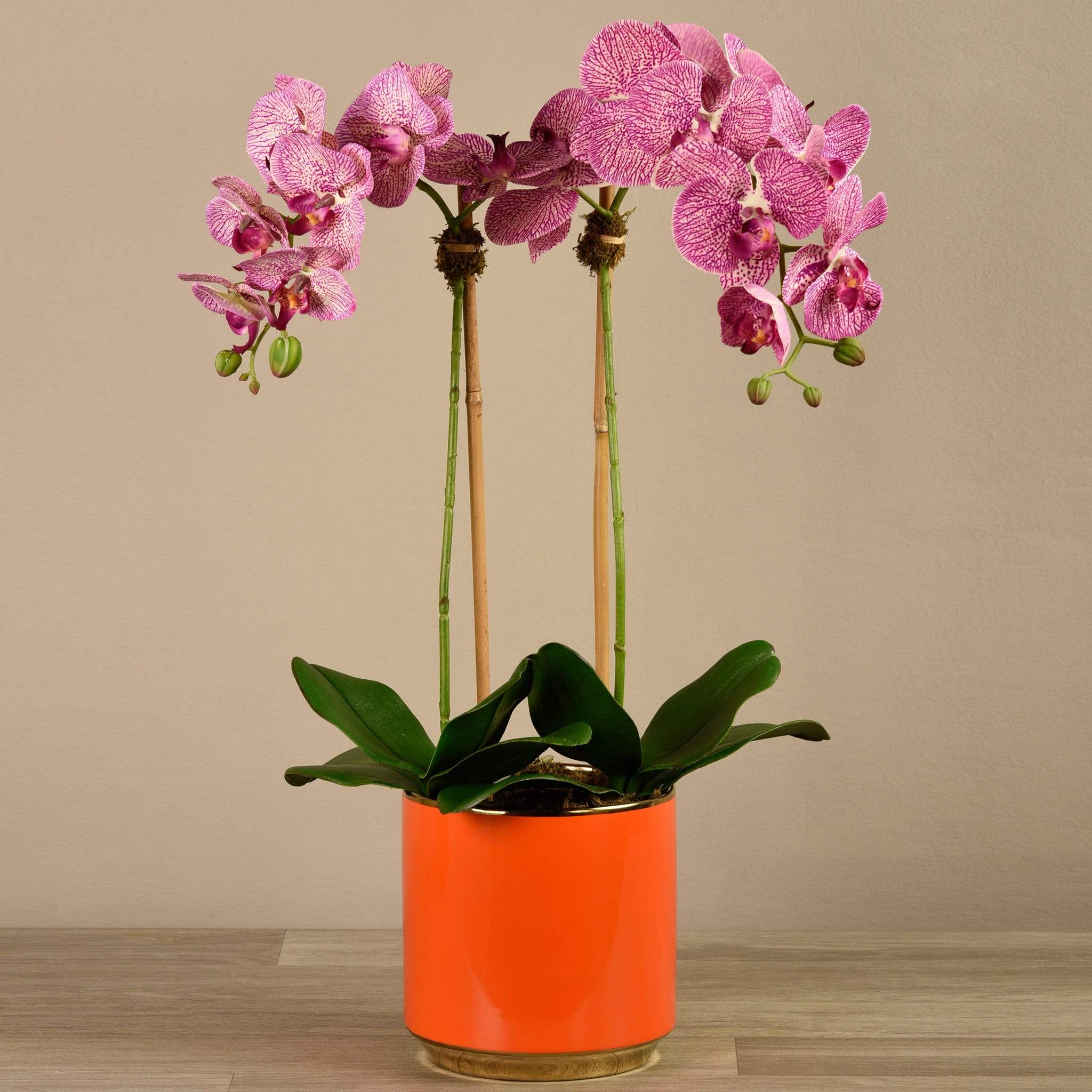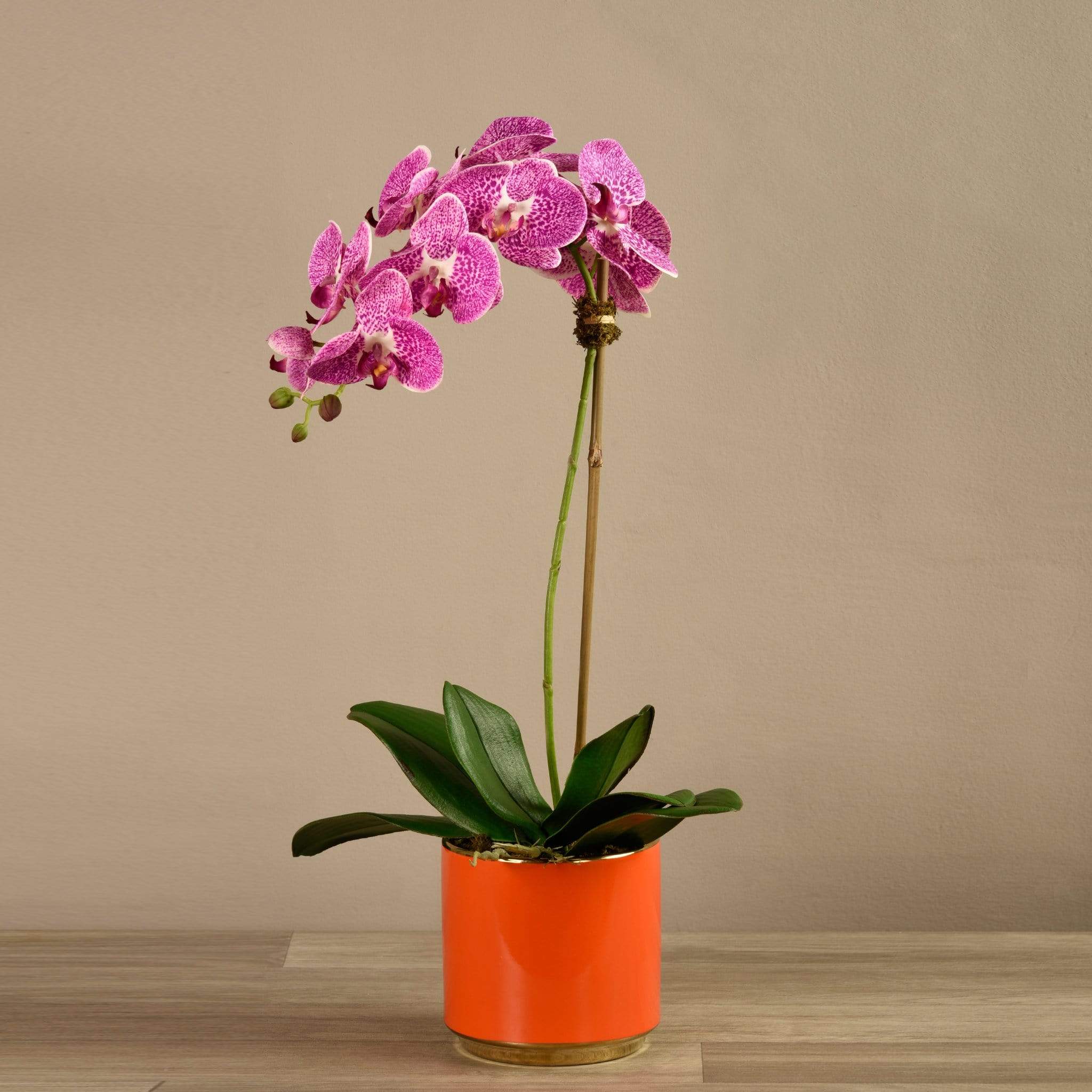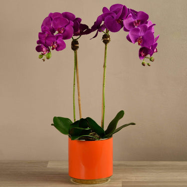 سيبقى هذا التنسيق الرائع من الأوركيد في حالة ازدهار طوال العام – دون الحاجة إلى الري. مصمم يدويًا من قِبل فريقنا الداخلي من خبراء تنسيق الأزهار، يبدو هذا الأوركيد الصناعي وكأنه طبيعي تمامًا في الشكل والملمس. يبرز أصيصه البرتقالي الأحمر الزاهي بشكل لافت أمام الأوراق الخضراء والبتلات الملونة.