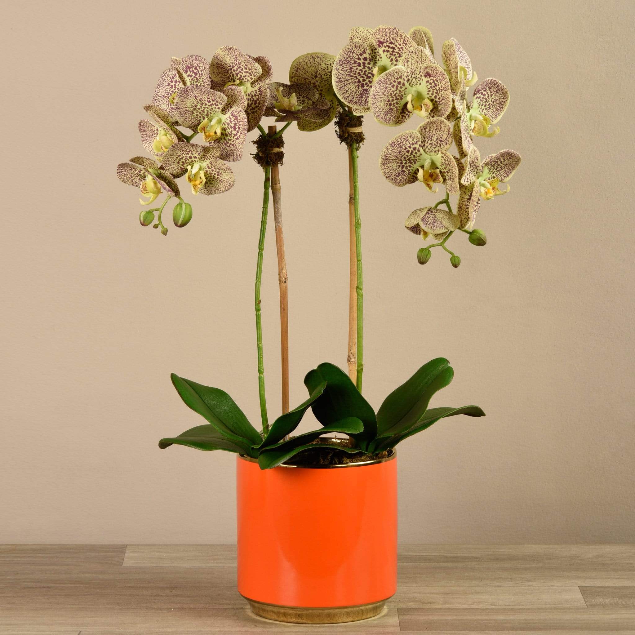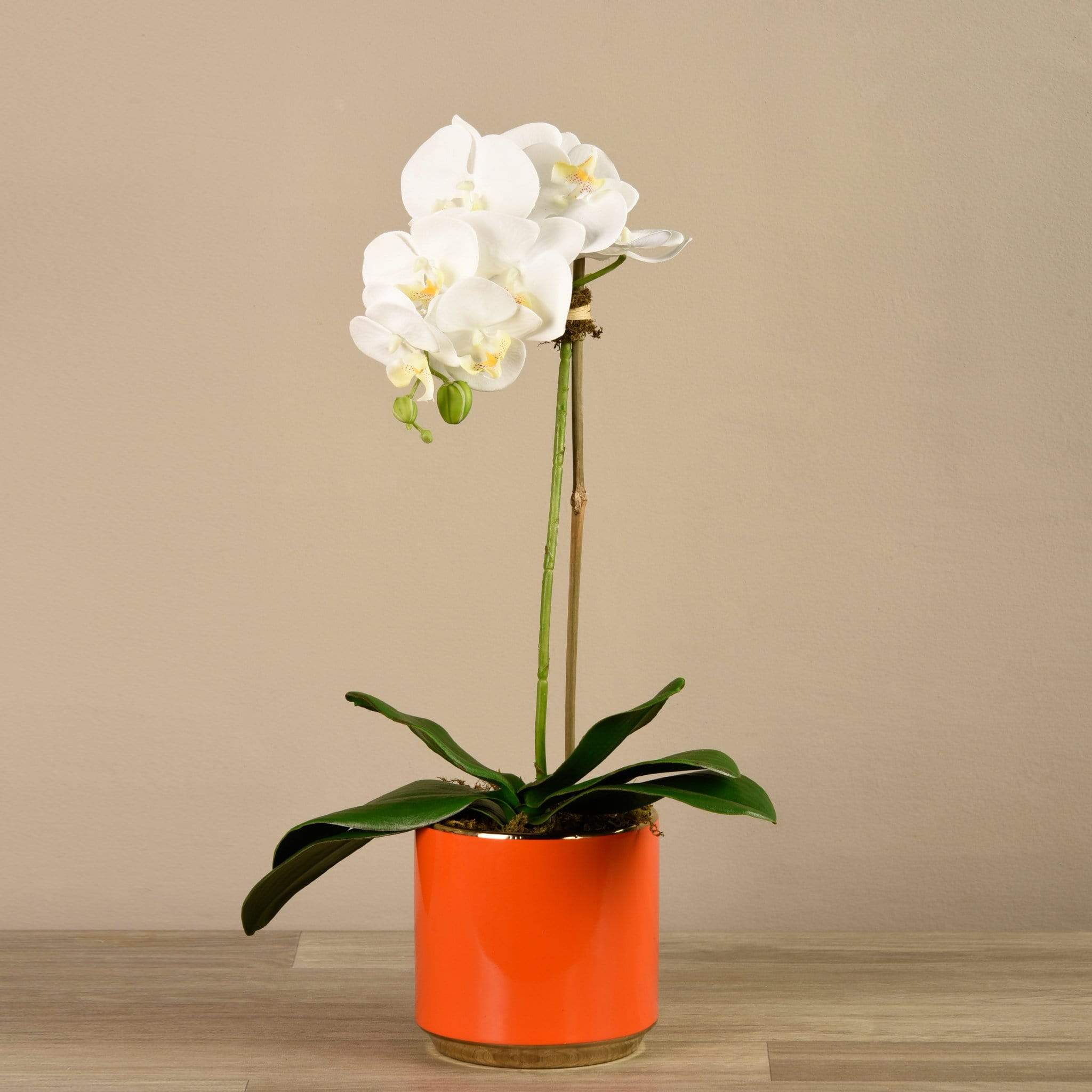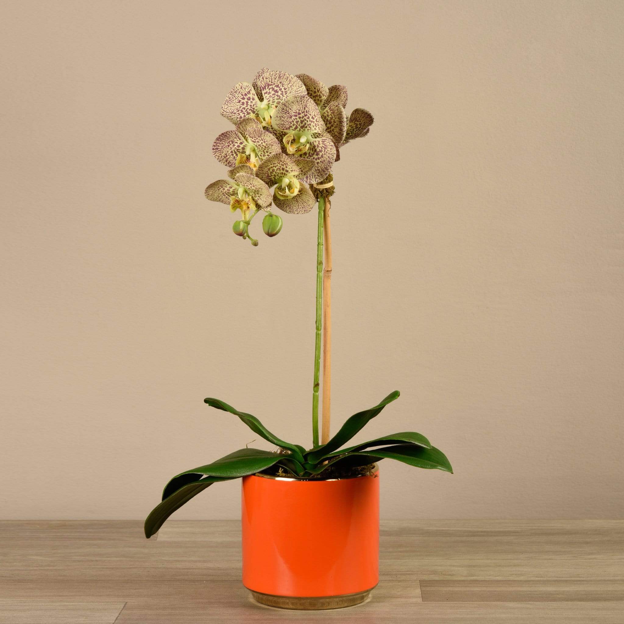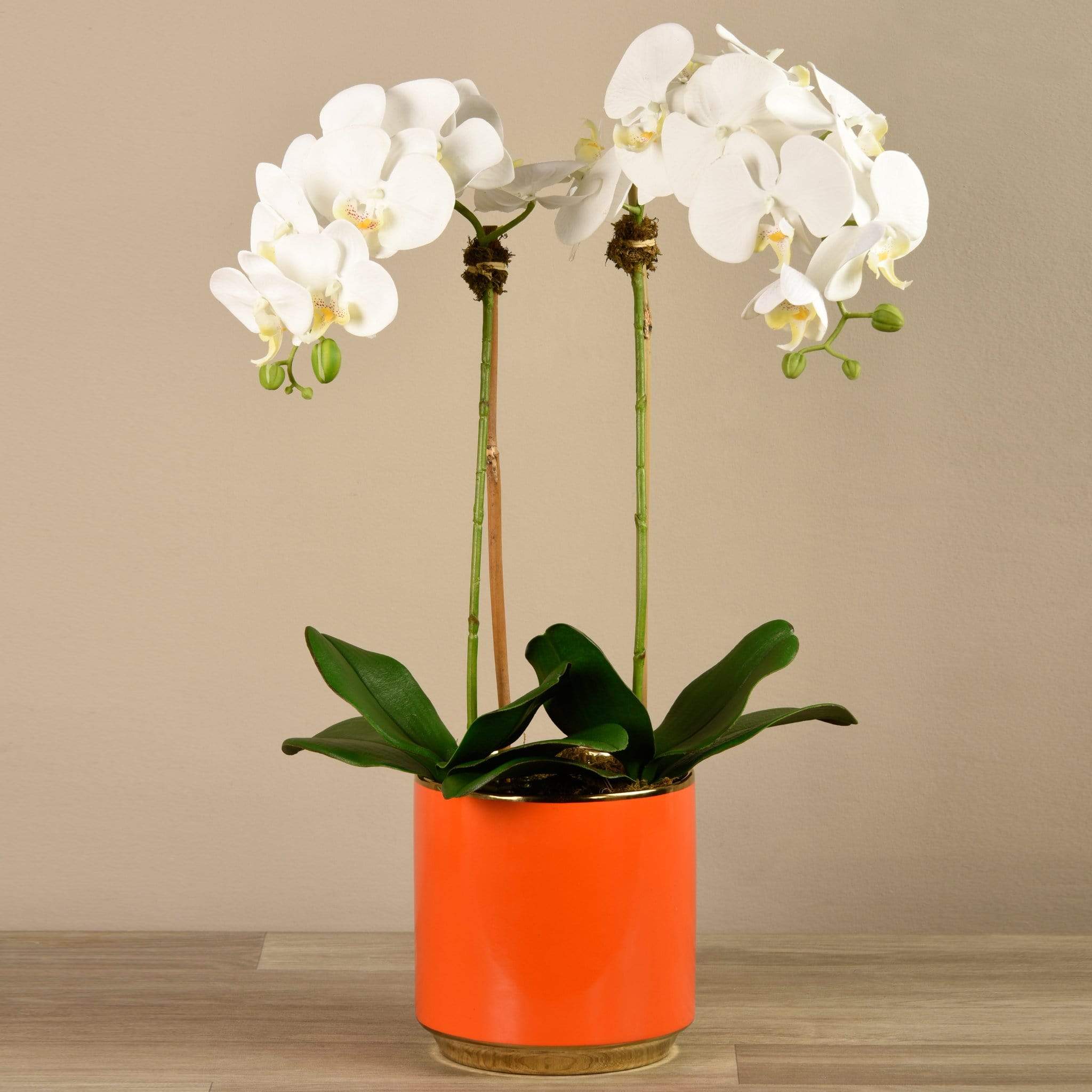 سيبقى هذا التنسيق الرائع من الأوركيد في حالة ازدهار طوال العام – دون الحاجة إلى الري. مصمم يدويًا من قِبل فريقنا الداخلي من خبراء تنسيق الأزهار، يبدو هذا الأوركيد الصناعي وكأنه طبيعي تمامًا في الشكل والملمس. يبرز أصيصه البرتقالي الأحمر الزاهي بشكل لافت أمام الأوراق الخضراء والبتلات الملونة.