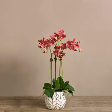 أضف لمسة من الحياة الدائمة إلى منزلك مع هذه الأوركيد الجميلة. مصنوعة يدويًا من قِبل خبراء باستخدام تقنية الملمس الواقعي، تبدو هذه الأزهار وكأنها طبيعية تمامًا. يضفي أصيصها الأبيض الأنيق المزخرف بنقوش الأوراق لمسة عصرية تتناسب مع أي ديكور.