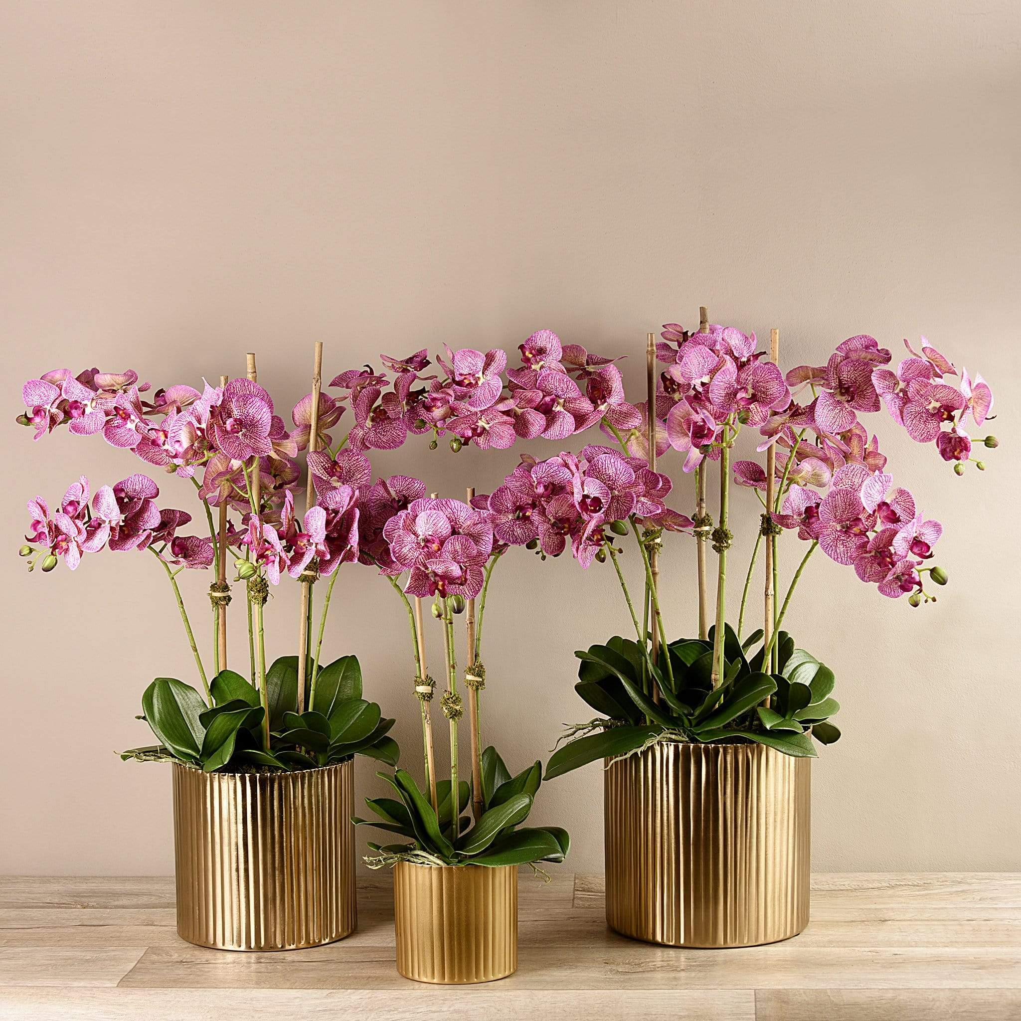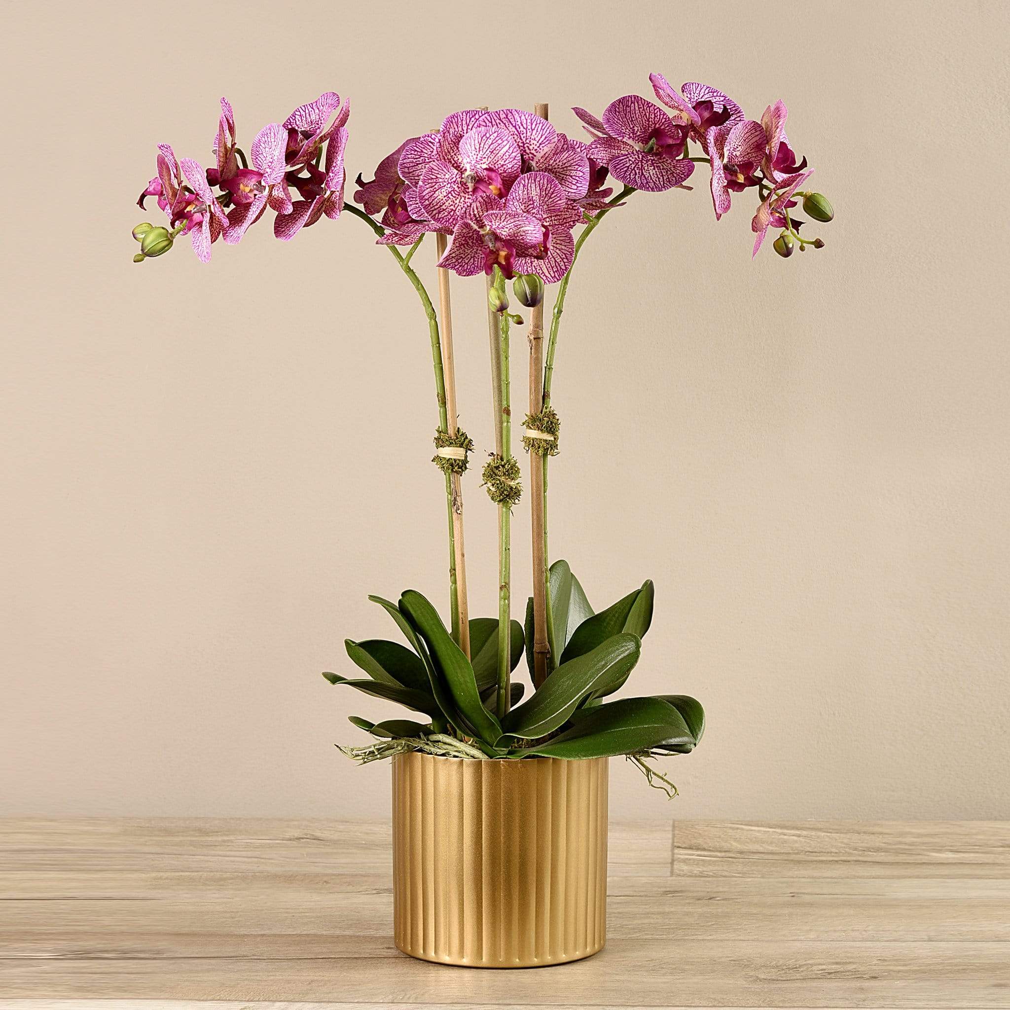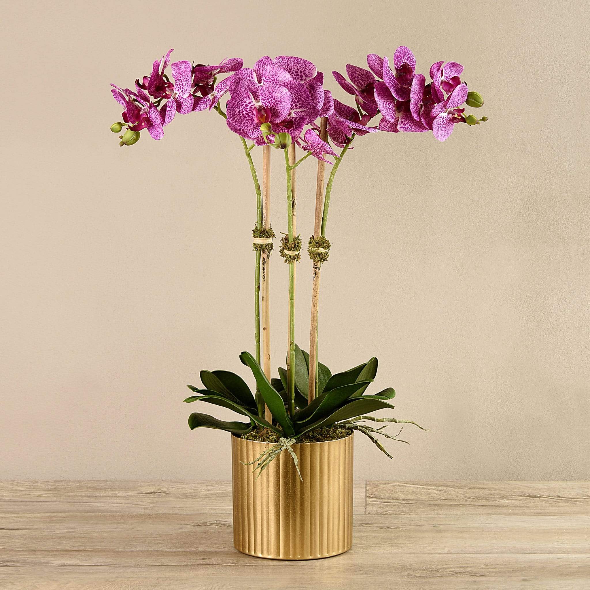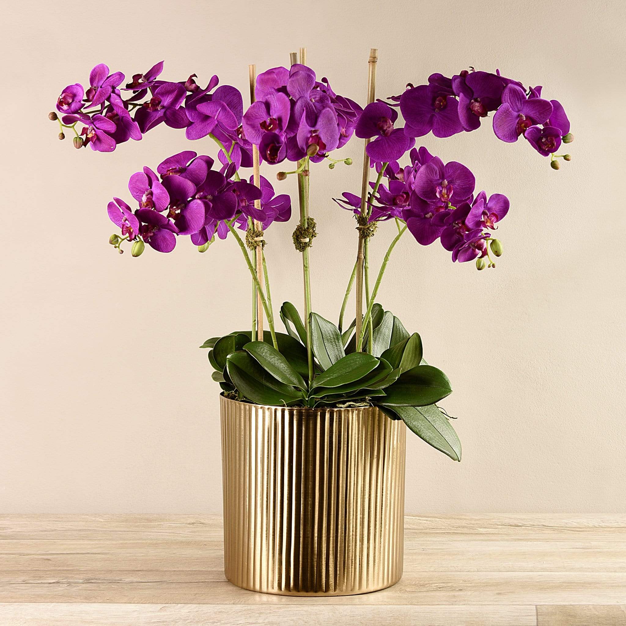 رشيقة واستوائية، تضفي هذه الأوركيد الجميلة حياة على أي مساحة معيشة دون عناء العناية بالنباتات الحقيقية. يبرز الأصيص الذهبي المعدني جمال الأزهار المصنوعة يدويًا والأوراق الخضراء الغنية بشكل لافت.