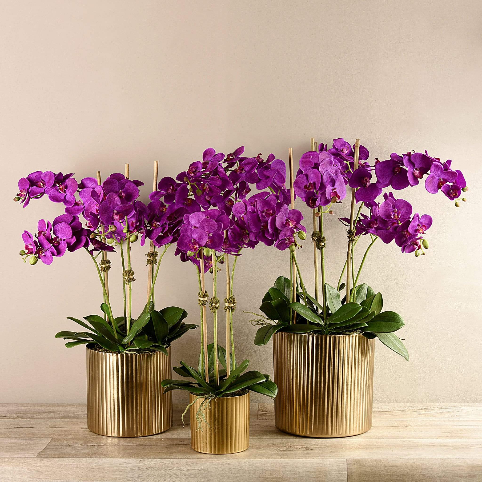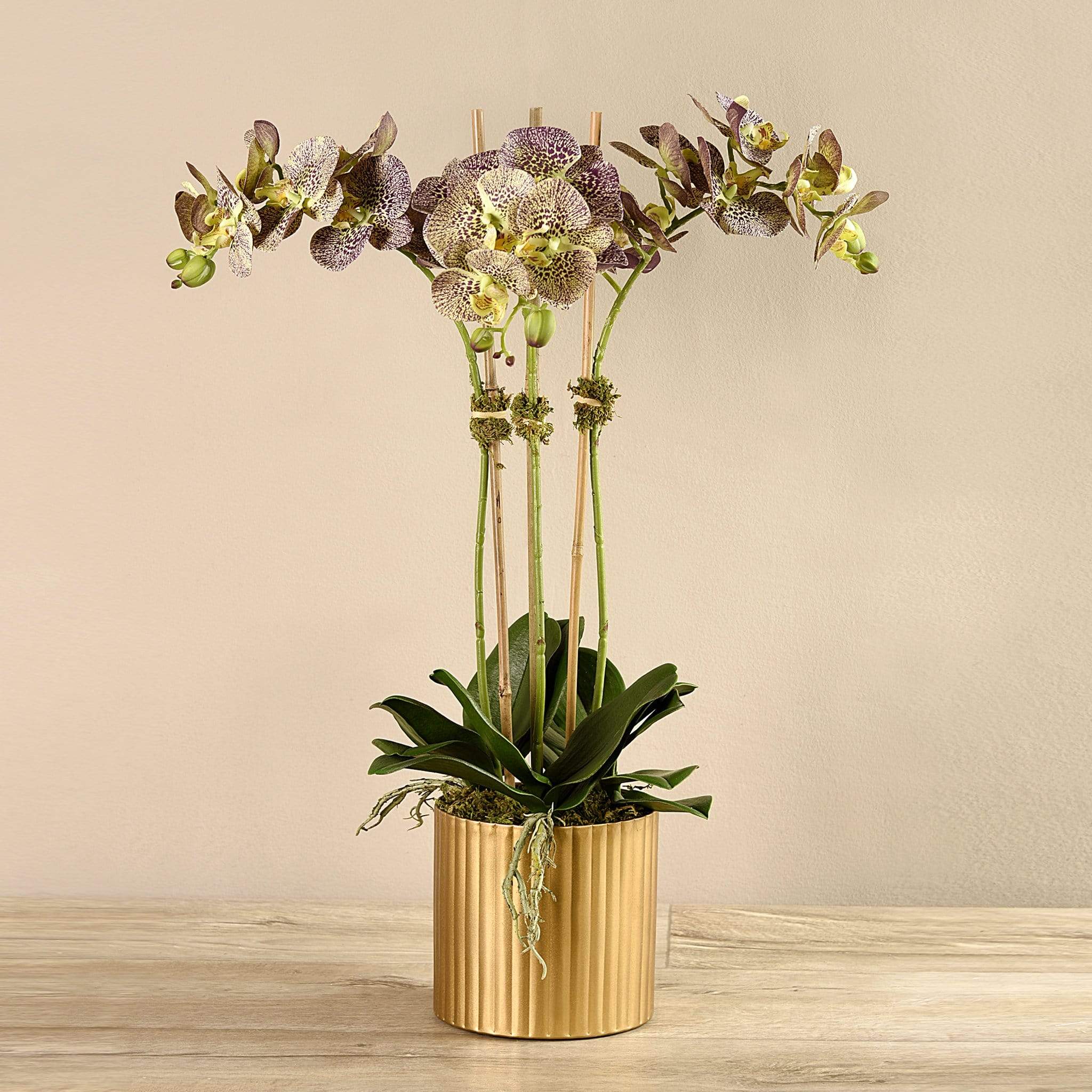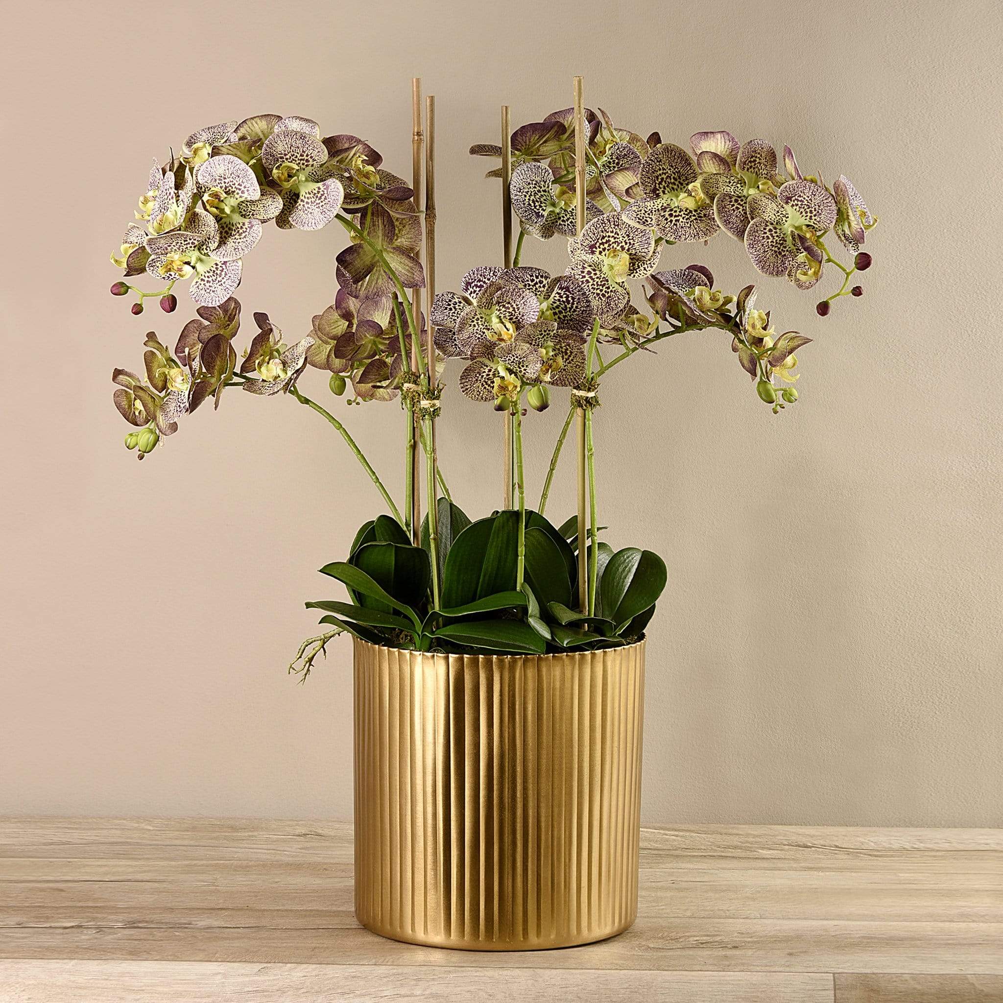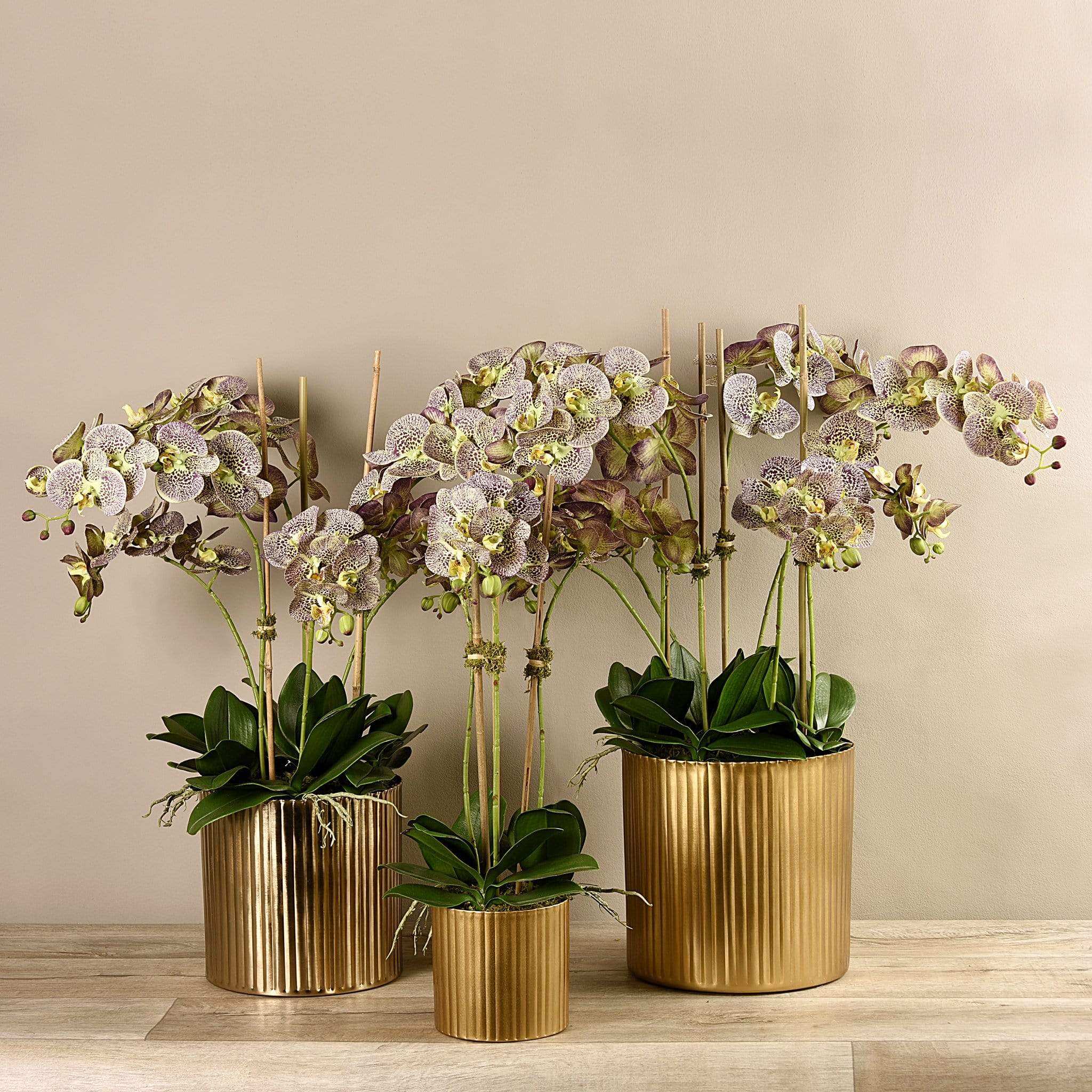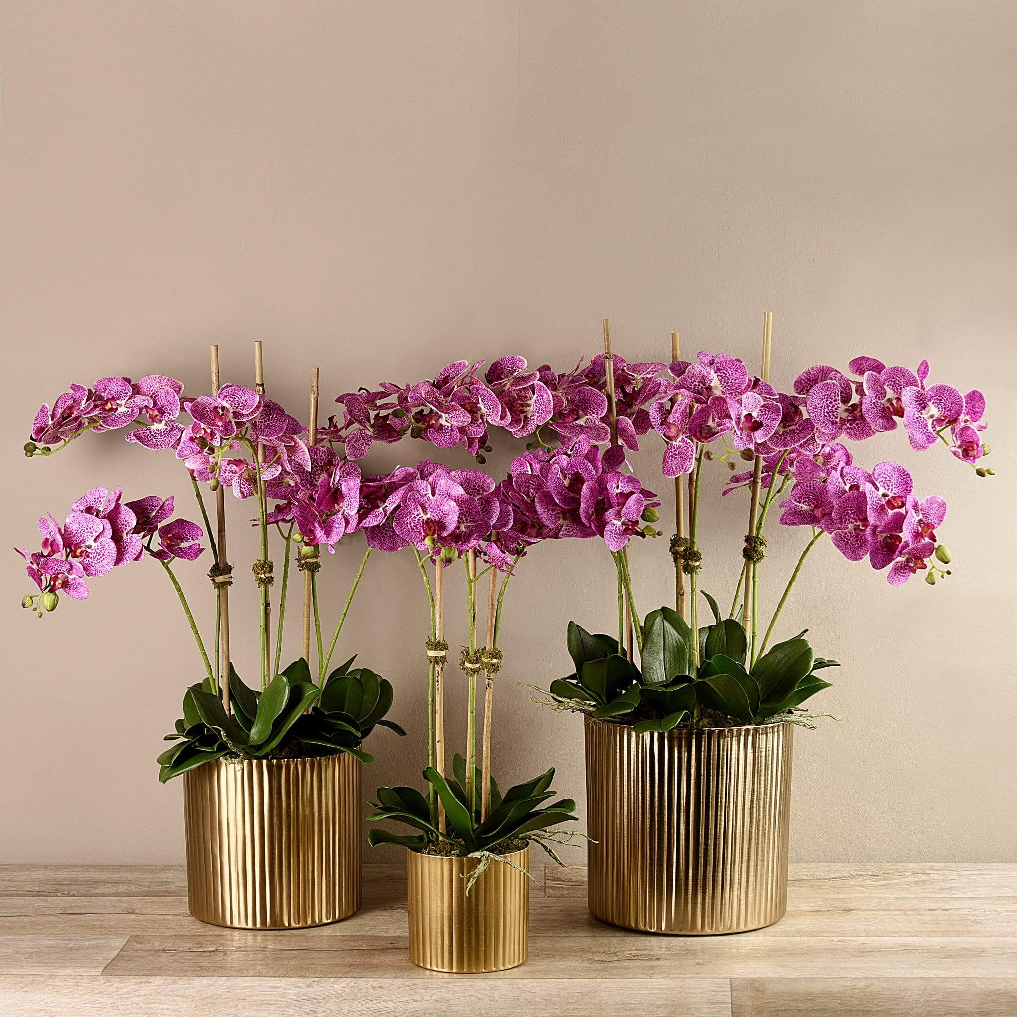 رشيقة واستوائية، تضفي هذه الأوركيد الجميلة حياة على أي مساحة معيشة دون عناء العناية بالنباتات الحقيقية. يبرز الأصيص الذهبي المعدني جمال الأزهار المصنوعة يدويًا والأوراق الخضراء الغنية بشكل لافت.