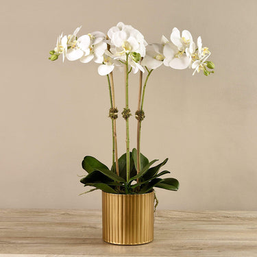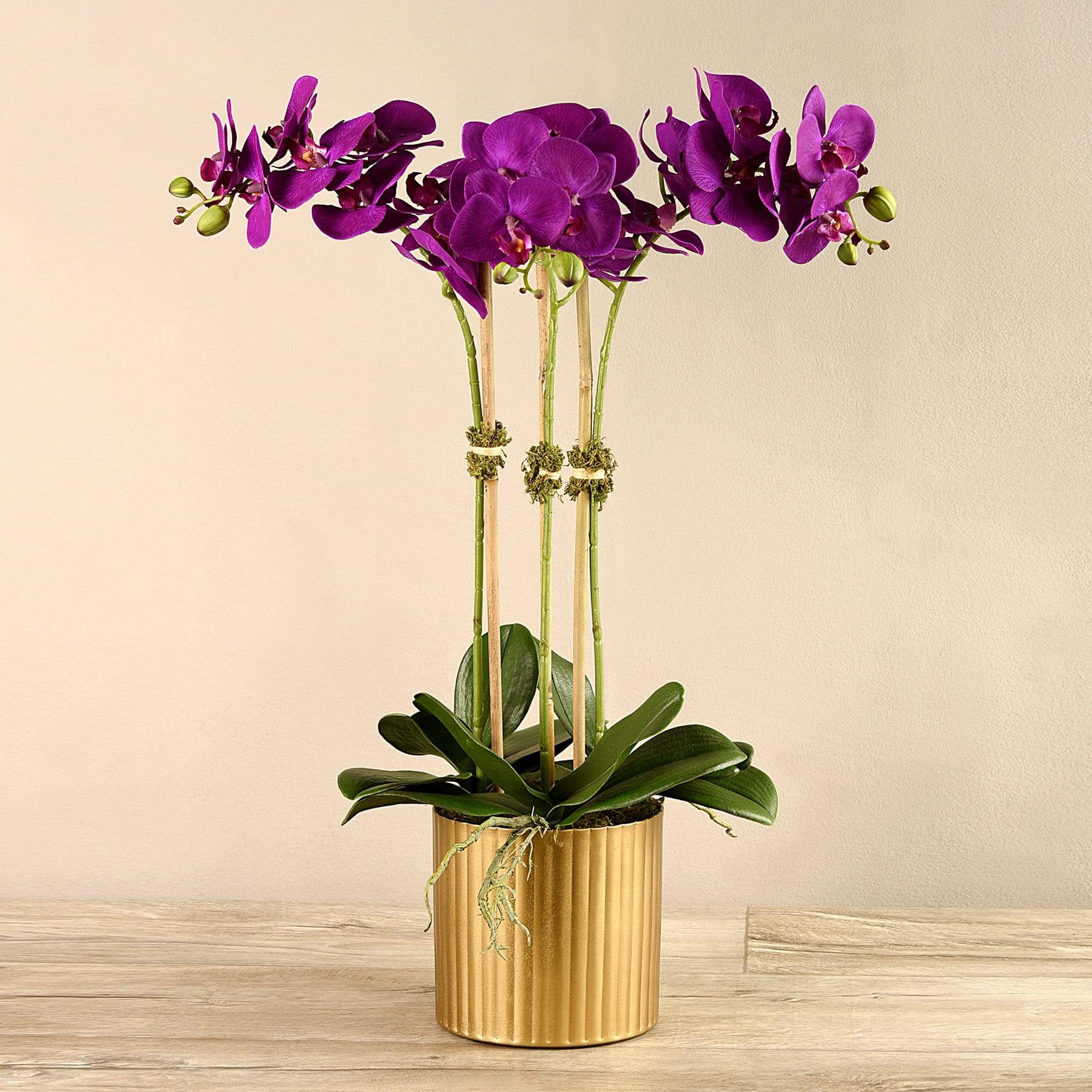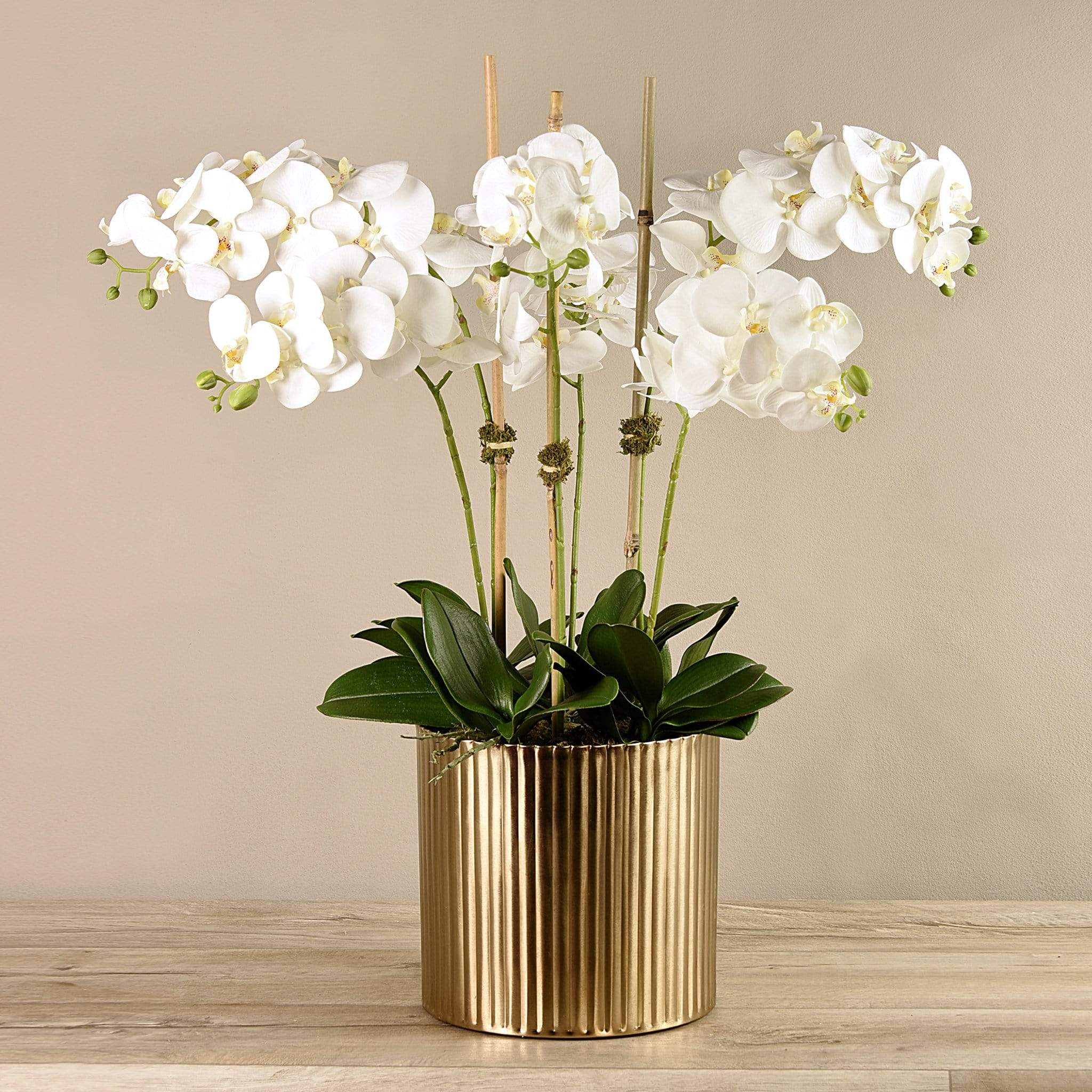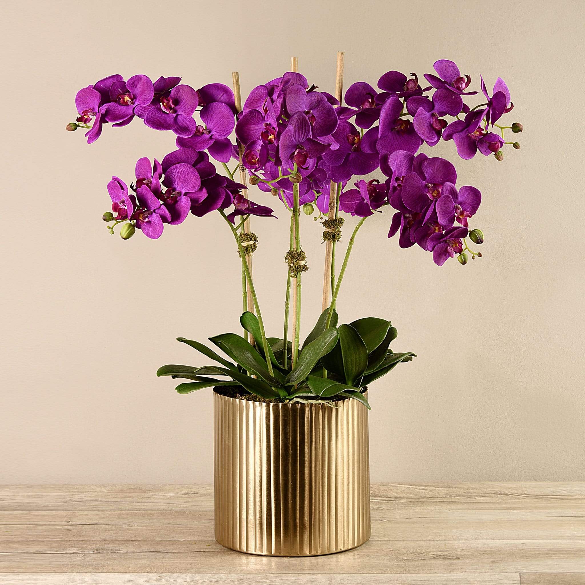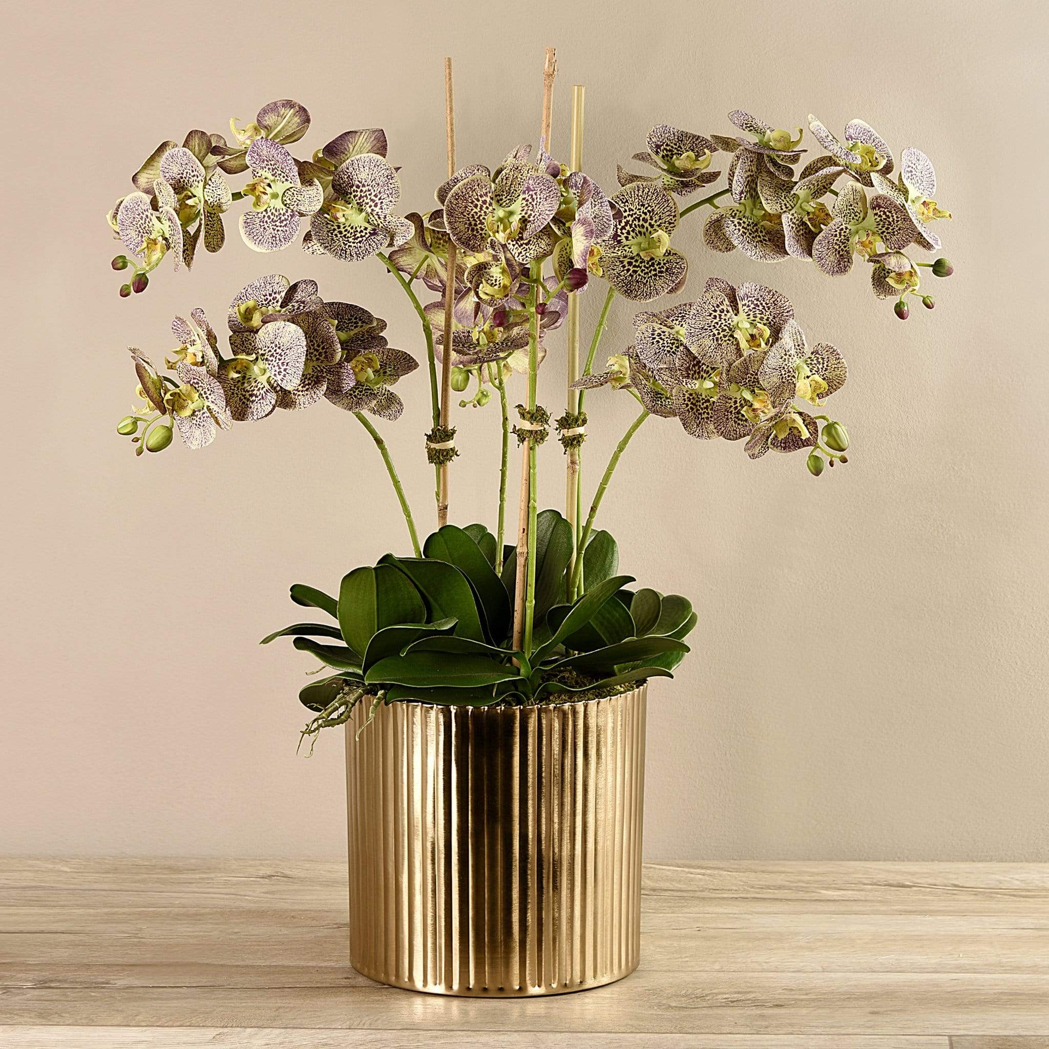 رشيقة واستوائية، تضفي هذه الأوركيد الجميلة حياة على أي مساحة معيشة دون عناء العناية بالنباتات الحقيقية. يبرز الأصيص الذهبي المعدني جمال الأزهار المصنوعة يدويًا والأوراق الخضراء الغنية بشكل لافت.