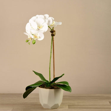 هذا التنسيق من الأوركيد هو تجسيد للأناقة العصرية. تجمع أزهار الأوركيد الحريرية الواقعية المذهلة مع أصيص بيج أنيق بتصميم هندسي، مما يضفي لمسة مميزة على أي غرفة معيشة أو منطقة انتظار.