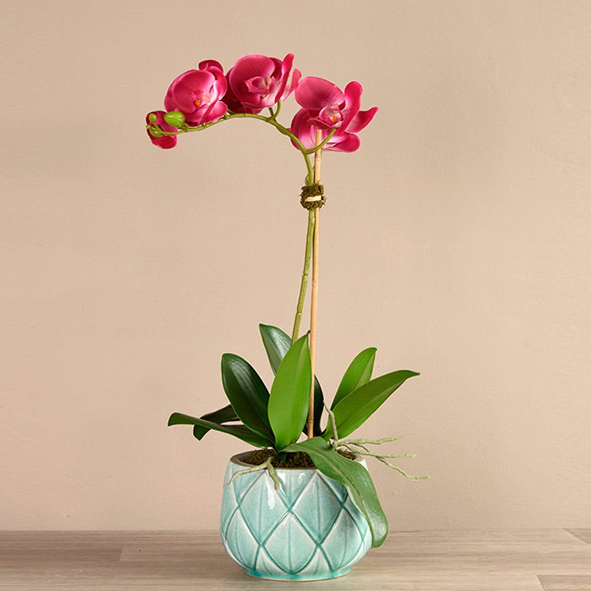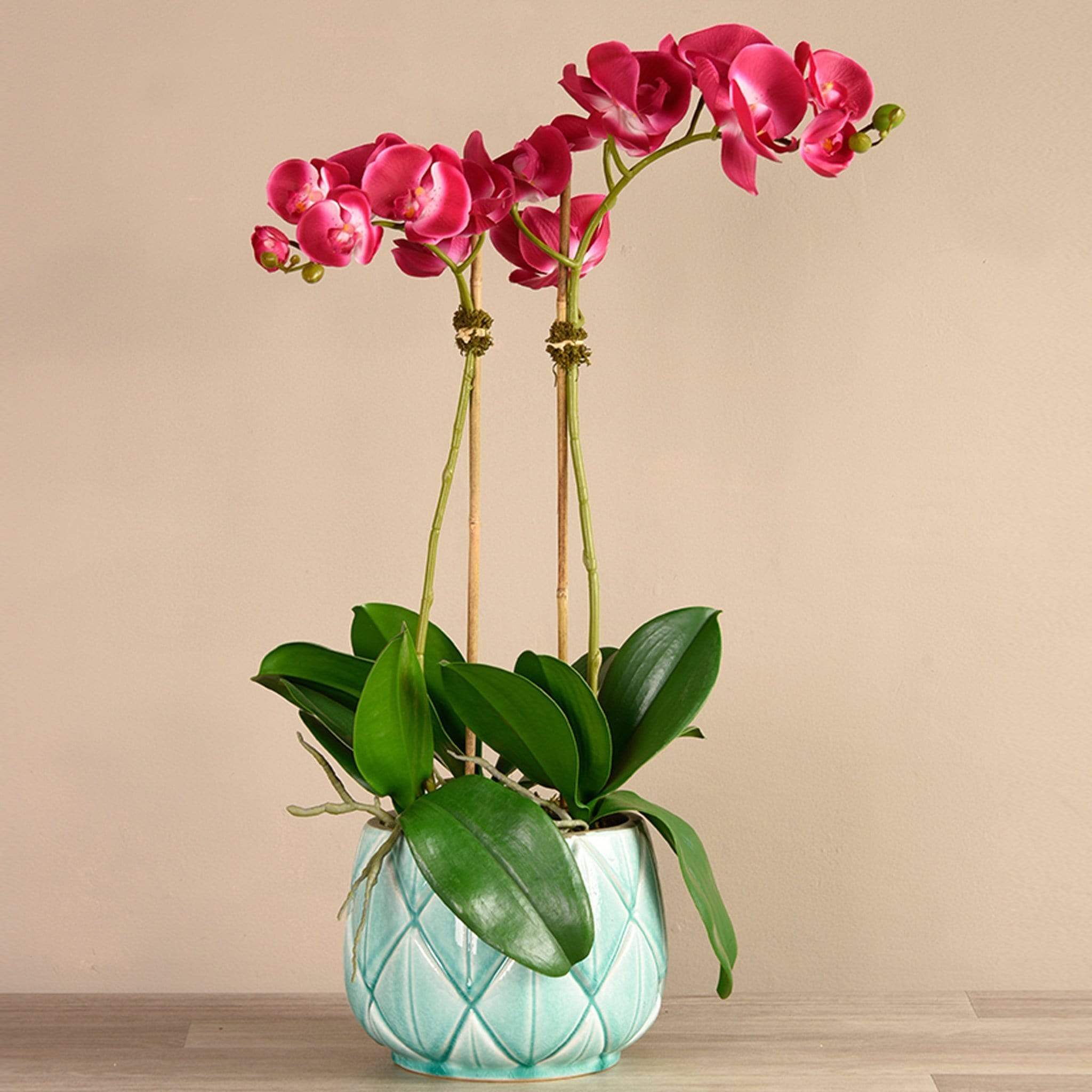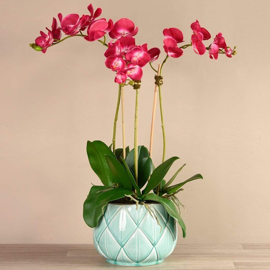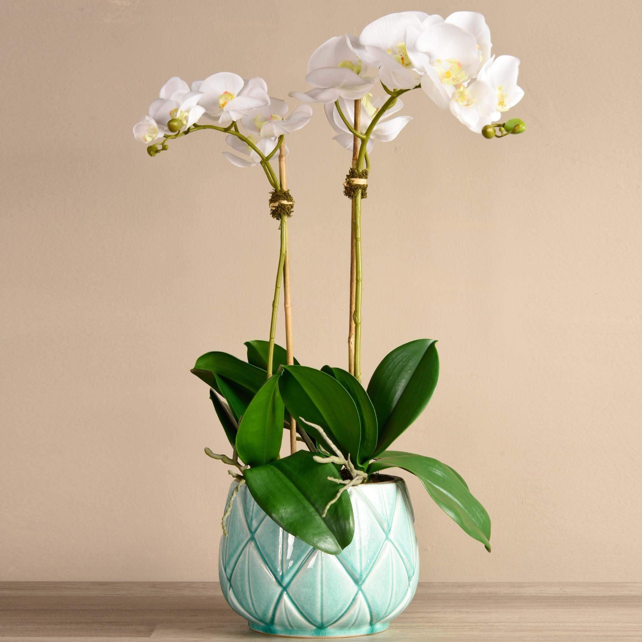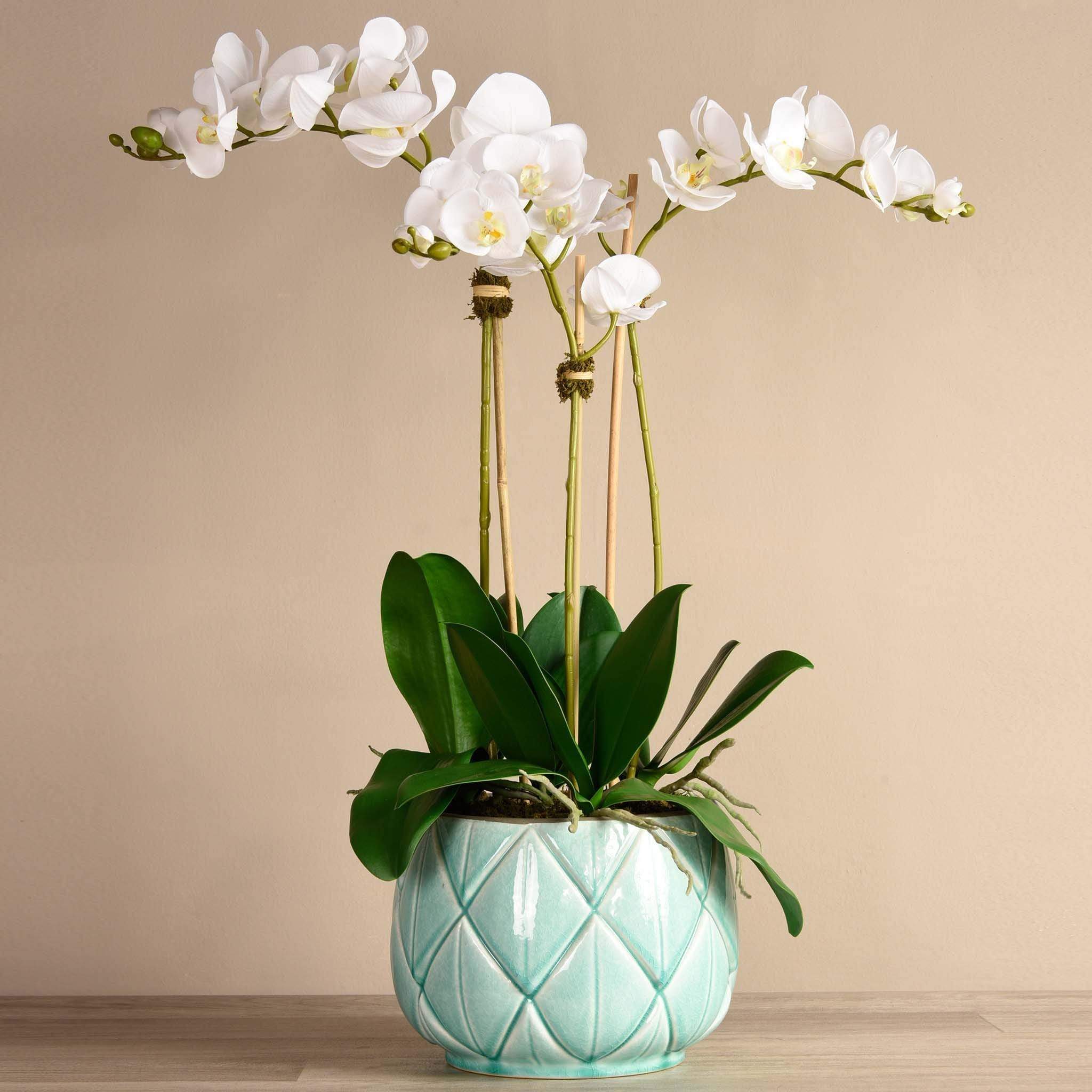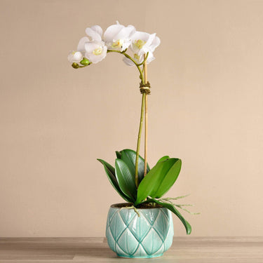 تشكيلة أوركيد ستيلا من بلومر، مع زهور الاوركيد باللون الأبيض الهادئ المنسقة داخل مزهرية سيراميكية رقيقة، لتخلق جو من البهجة والانتعاش داخل منزلك، بينما تبعث أوراقها الخضراء بالدفء والراحة. تناسب هذه التشكيلة البديعة جميع التصميمات والديكورات، وتزيد من أناقة أي غرفة توضع بها. زهور الأوركيد تصنع من أجود الخامات على أيدي منسقي زهور متخصصين بحسب الطلب، وتتميز بمظهر وملمس مماثلين للزهور الطبيعية.
