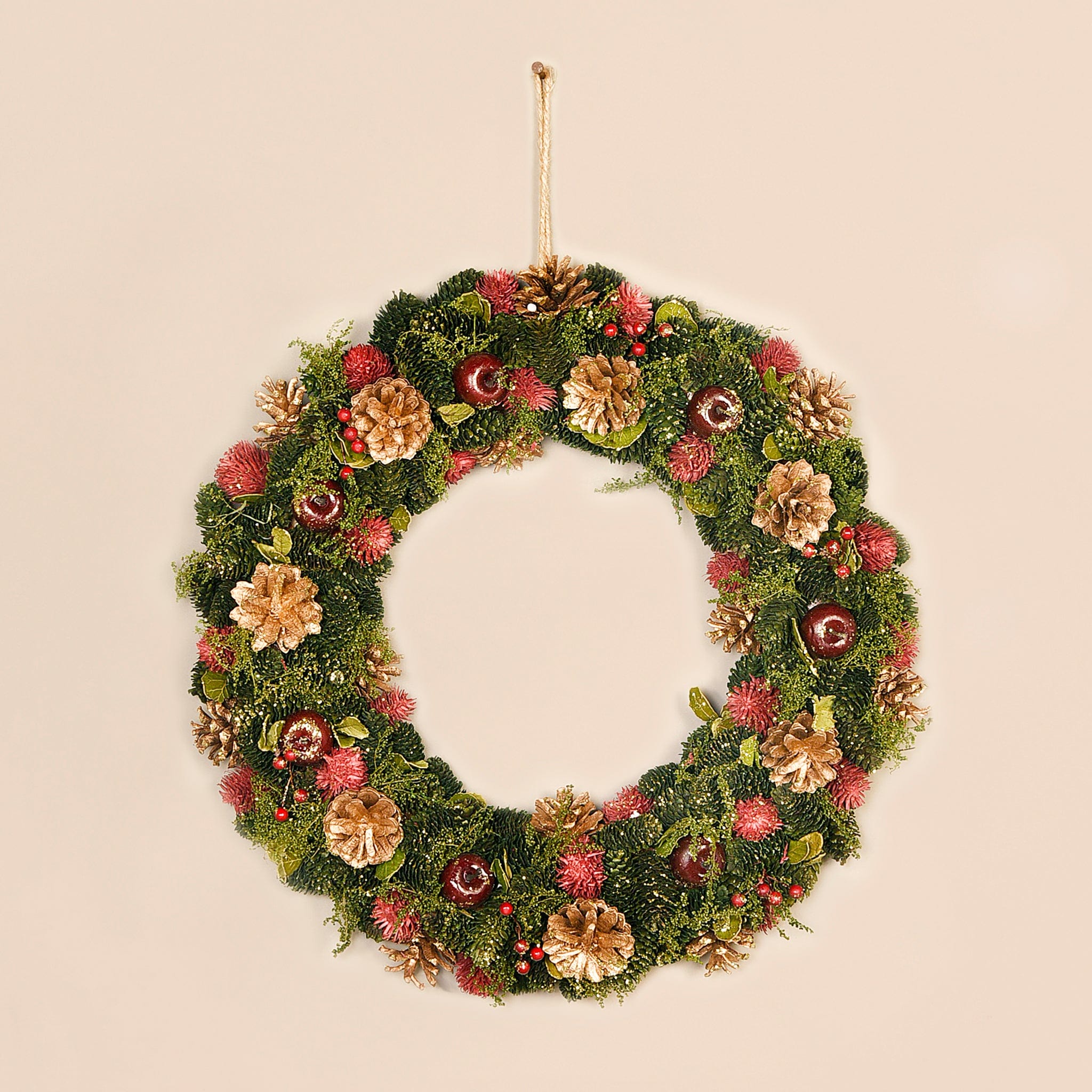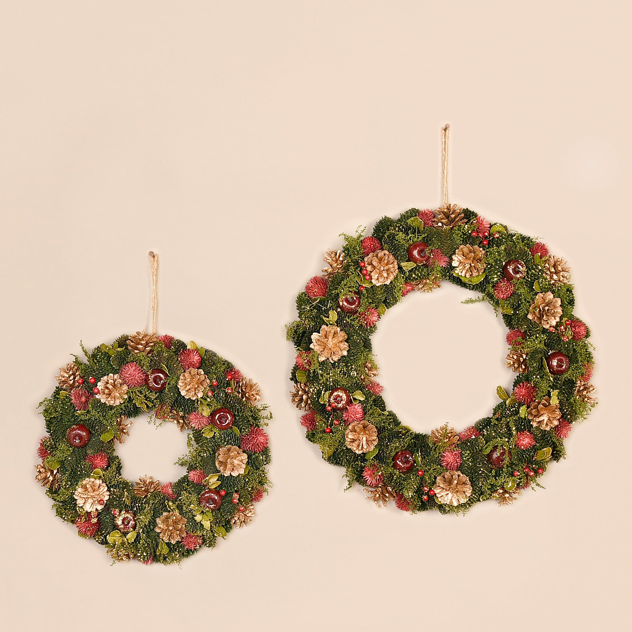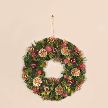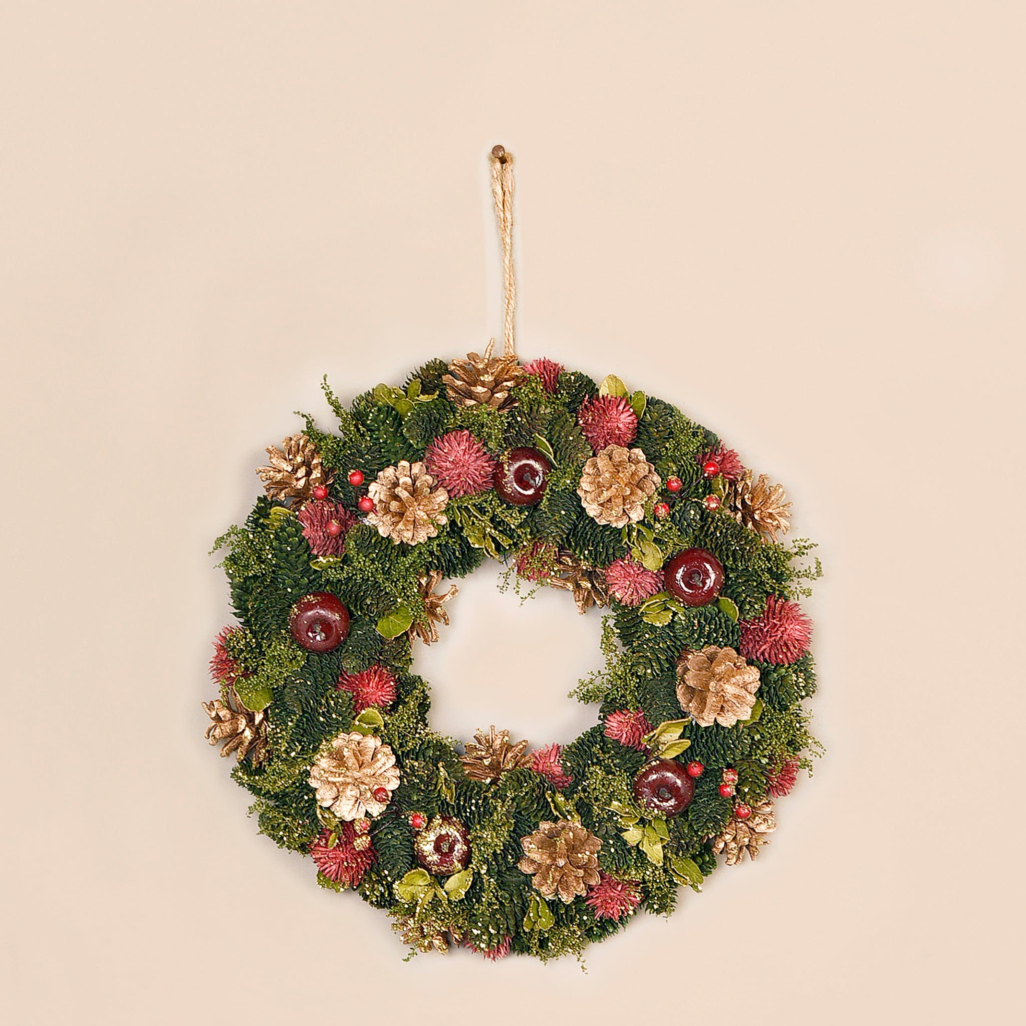 حلّ موسم الأعياد، وهو الوقت المثالي لتزيين باب منزلك بإكليل احتفالي جميل مثل هذا. يتميز بتصميم من أكواز الصنوبر الصناعية، التفاح، وإبر الصنوبر، مع لمسات براقة باللونين الأحمر والأخضر، مما يجعله تجسيدًا لكل ما هو رائع في موسم الأعياد.