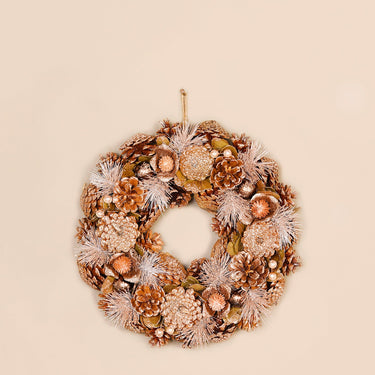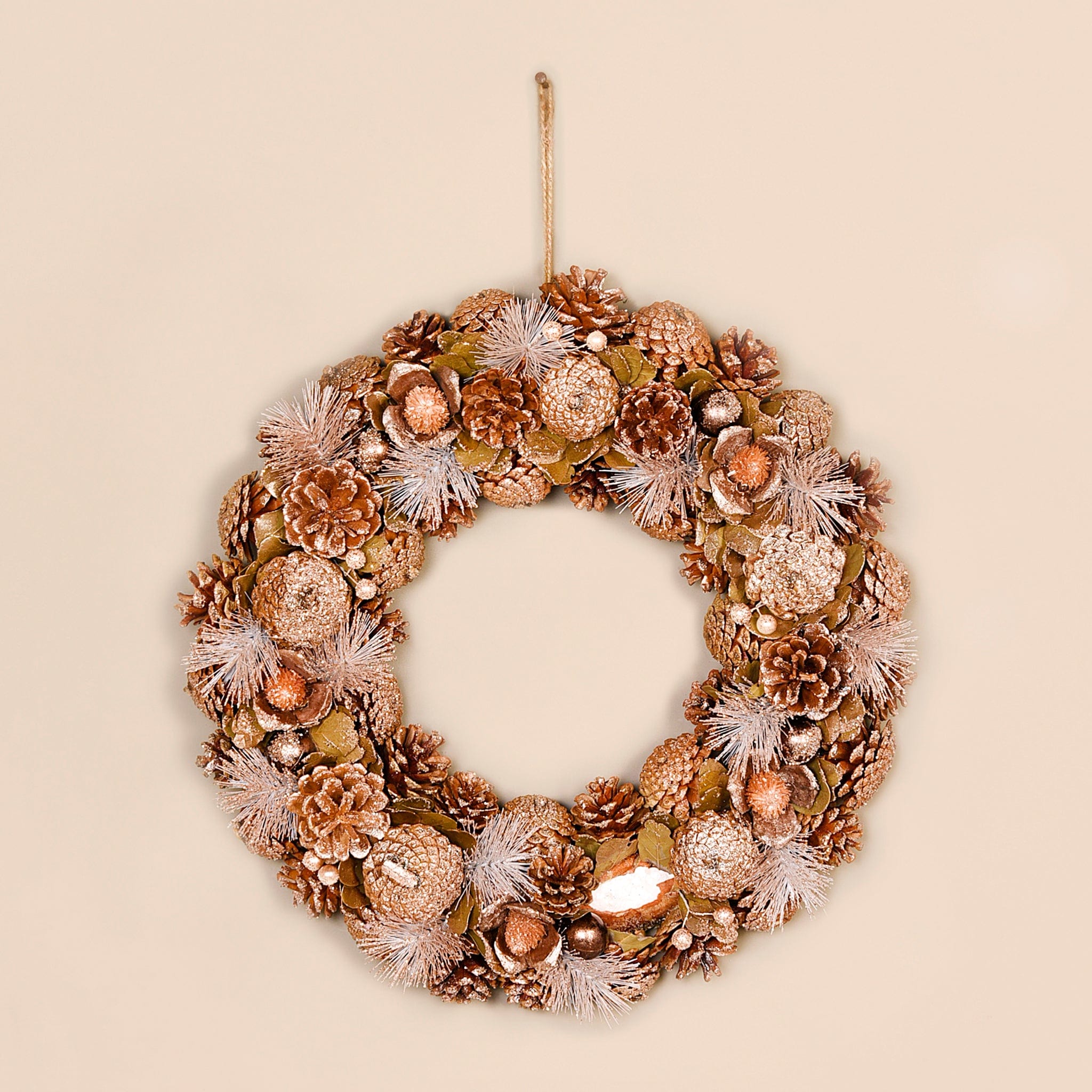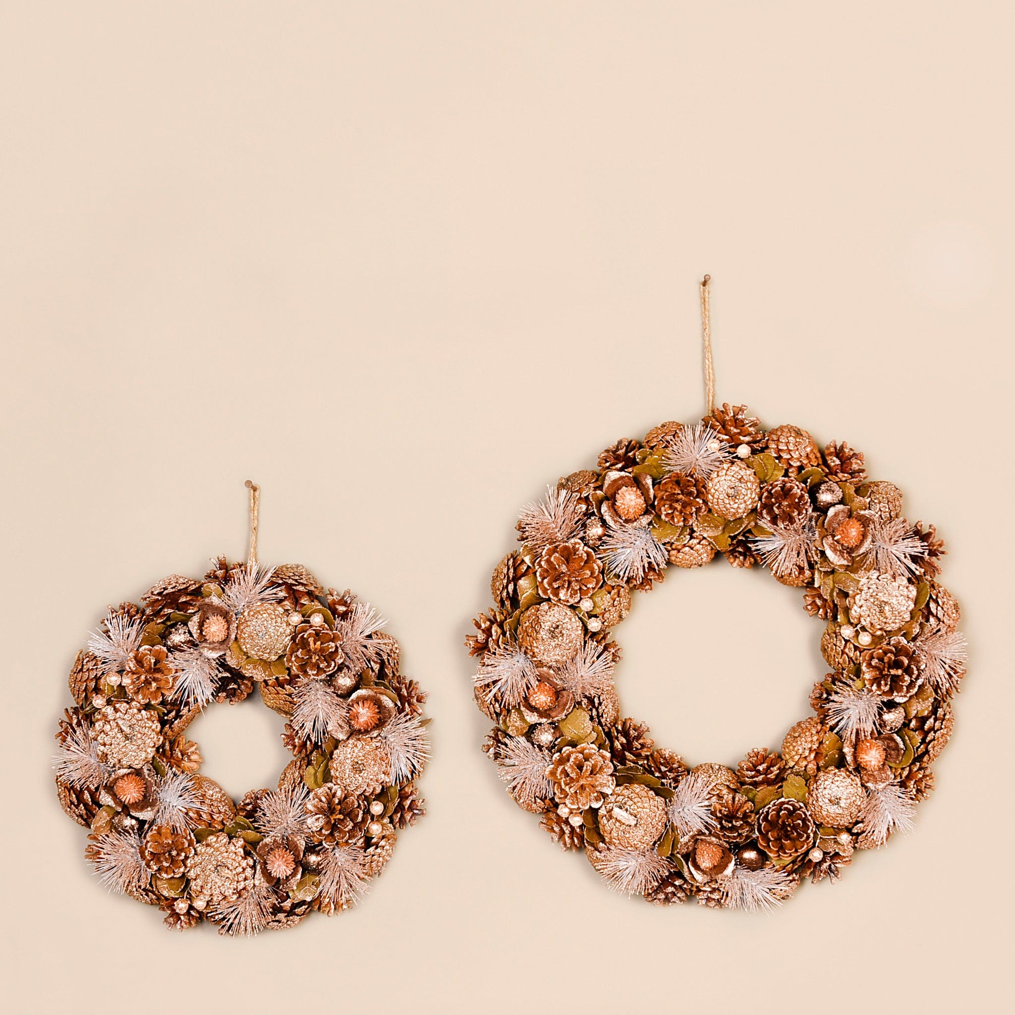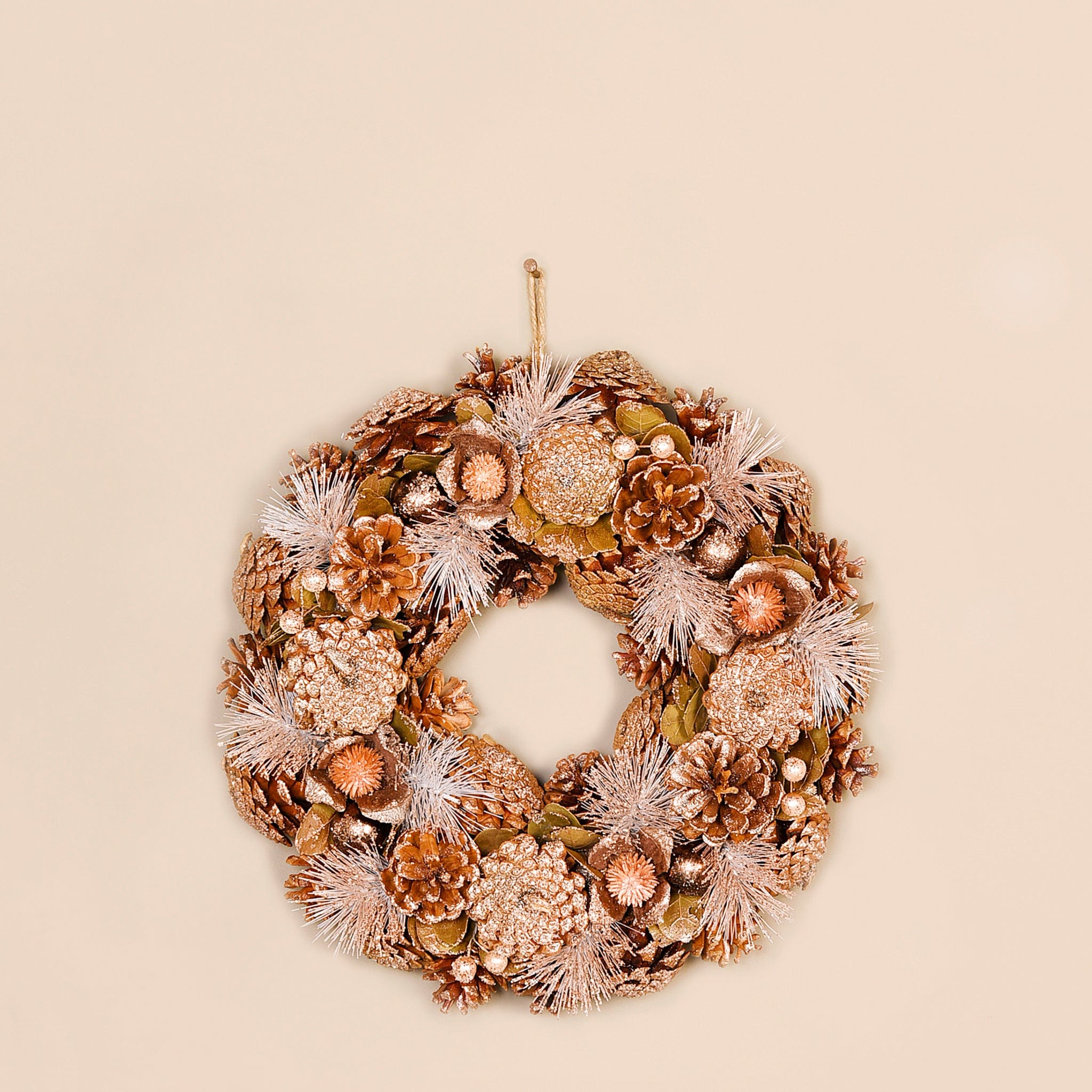 حلّ موسم الأعياد، وهو الوقت المثالي لتزيين باب منزلك بإكليل احتفالي جميل مثل هذا. يتميز بتصميم من أكواز الصنوبر الصناعية، إبر الصنوبر، والزينة مع لمسات لامعة بلون الوردي الذهبي، مما يجعله خيارًا مثاليًا لإضفاء أجواء العيد.