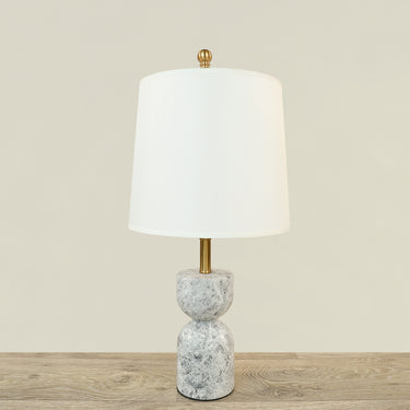 أرفع من طاولةأو منضدة مع هذه الاباجورة الفريدة من نوعها. تتميز هذا الاباجورة الرخامية بلمسات برونزية وظل كريمي فاتح ( اوف وايت) كلاسيكس وقاعدة على شكل ساعة رملية متينة مصنوعة من الرخام الطبيعي بلون الرمادي.
