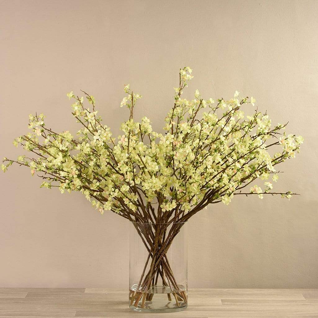 فروع الأشجار المزهرة الصناعية في مزهرية زجاجية