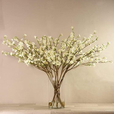 باقة بديعة من فروع الأشجار المزهرة الصناعية تملأ منزلك بعبق الربيع وسحره، وهي تأتيك منسقة داخل مزهرية زجاجية بتصميم كلاسيكي يبرز جمال الفروع الطويلة وبراعم الزهور.