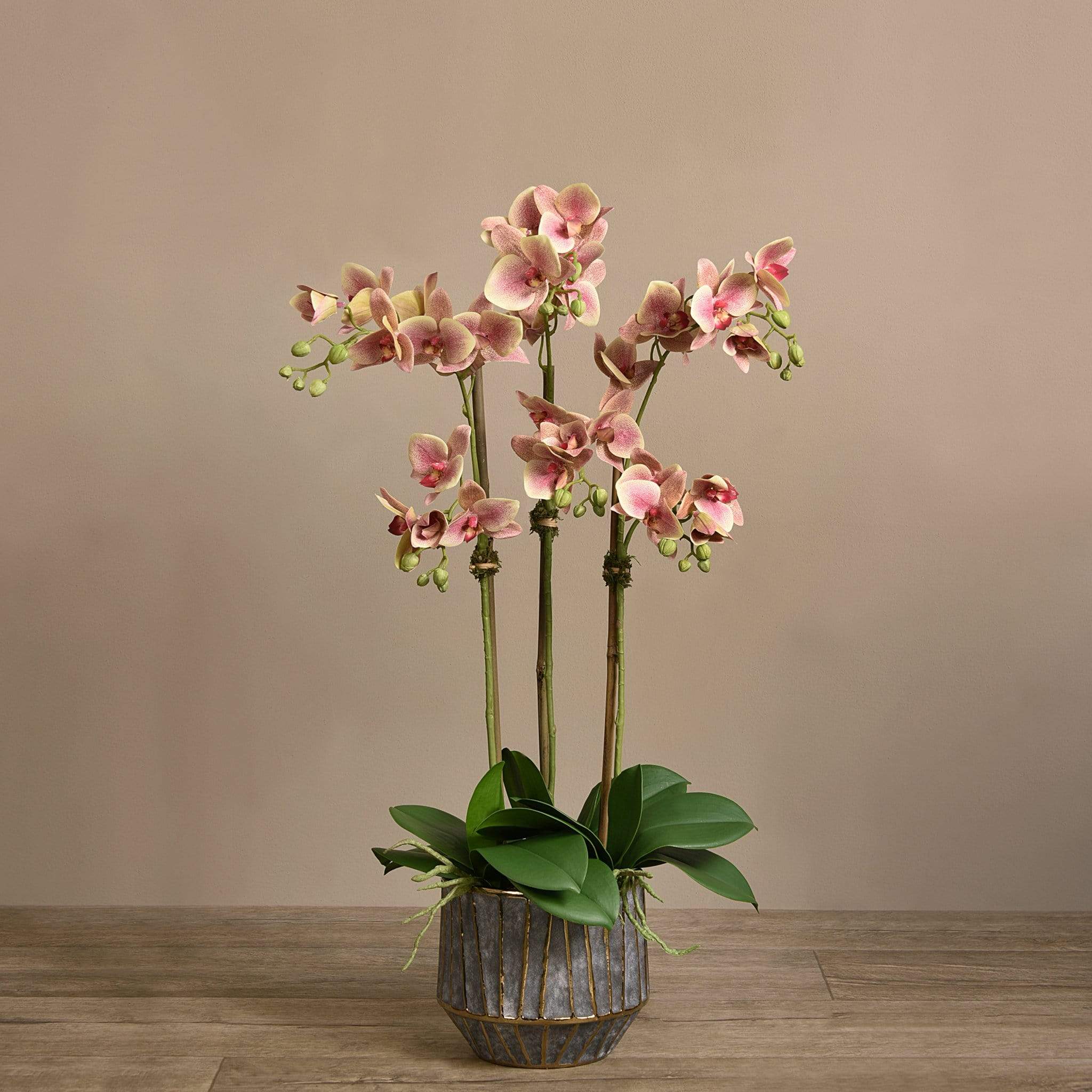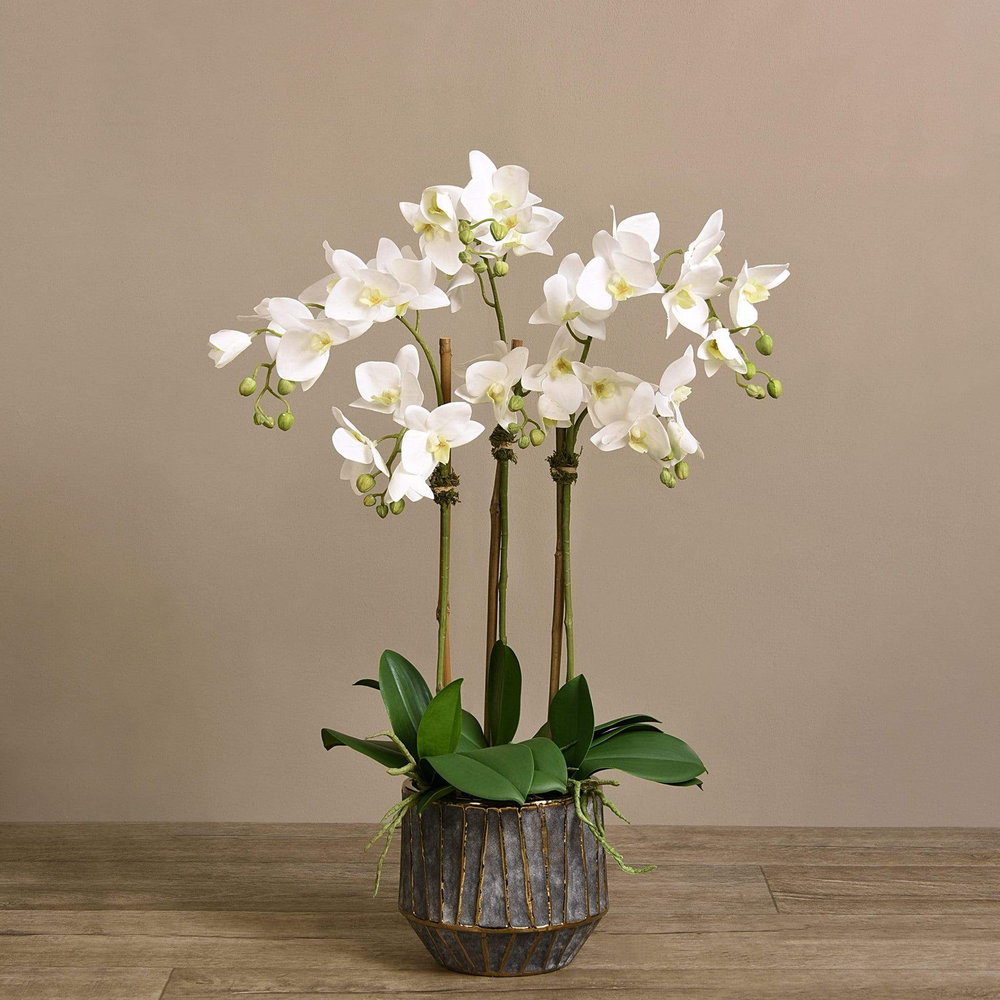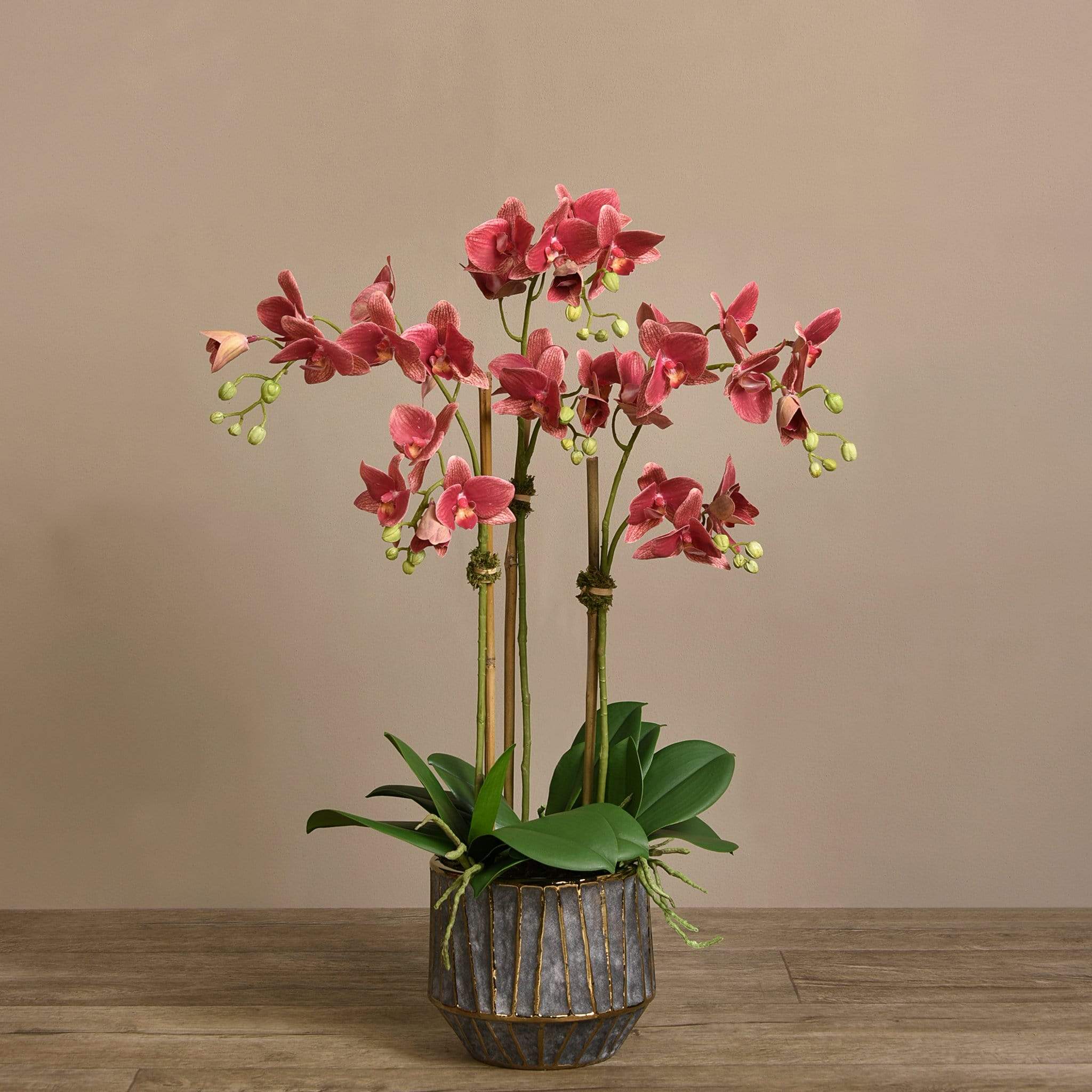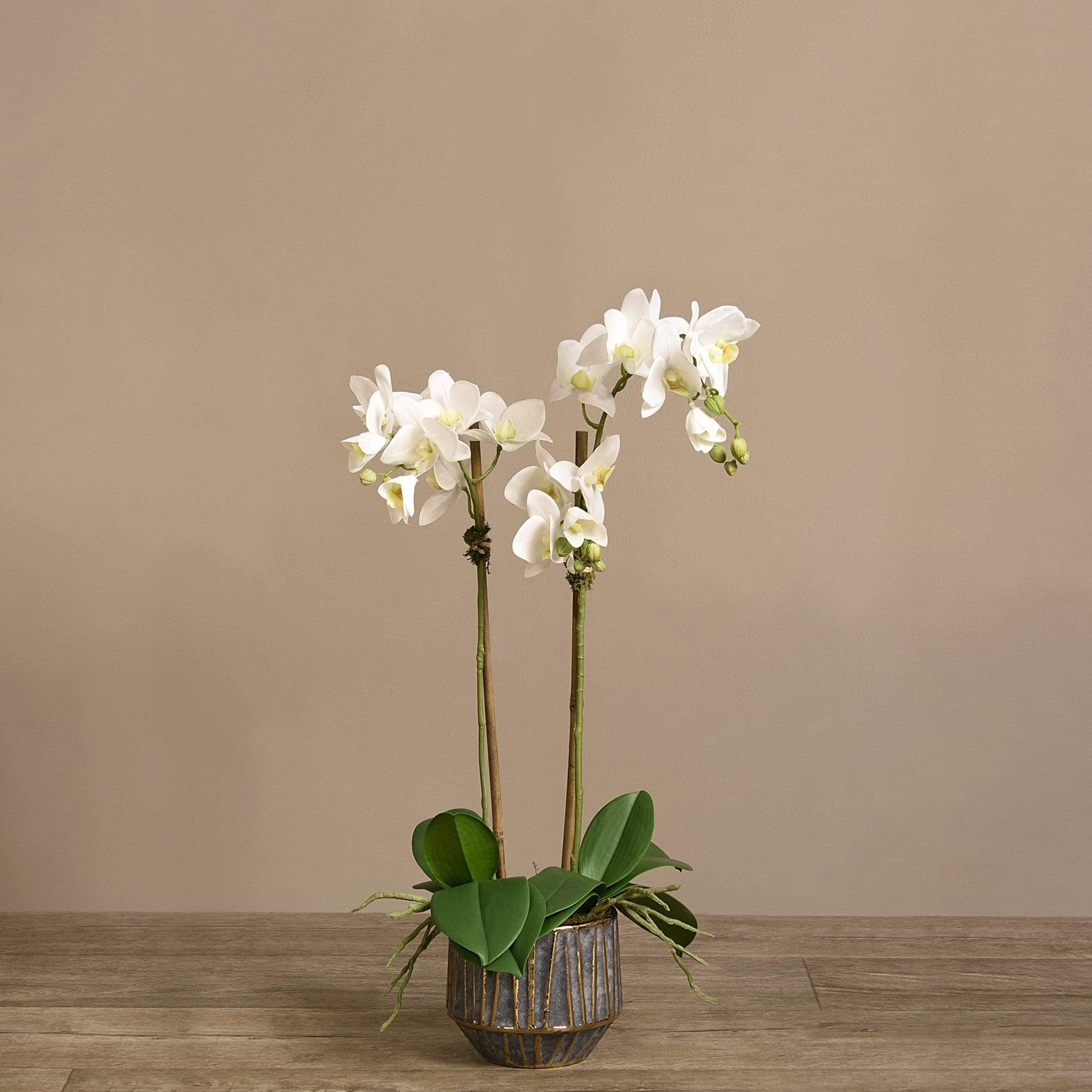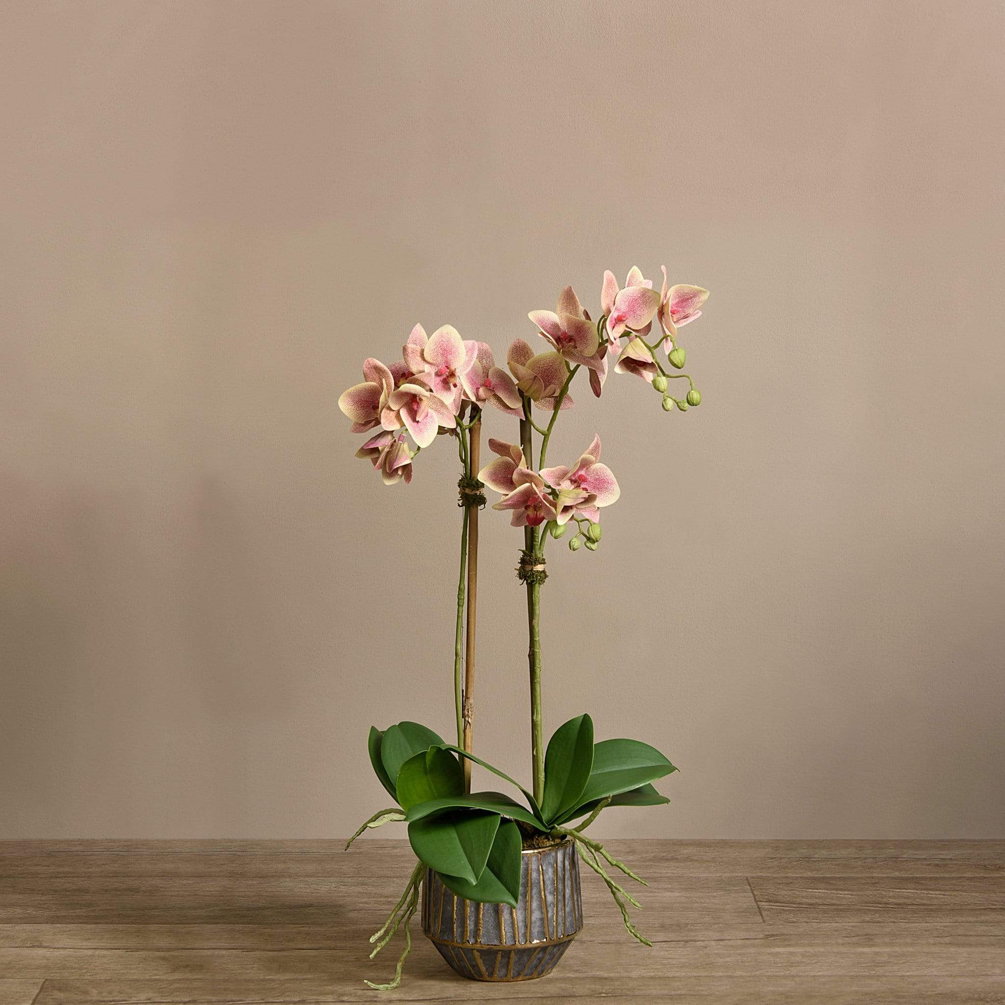 تضيف هذه الأوركيد الاصطناعية جواً من الأناقة إلى أي ديكور داخلي. مصنوعة يدويًا من قبل بائعي الزهور باستخدام تقنية اللمس الحقيقي ، تبدو هذه الأوركيد الاصطناعية وكأنها نابضة بالحياة بشكل مدهش. يتناقض وعاءهم الرمادي المخطّط بشكل جميل مع الأوراق الخضراء المورقة.