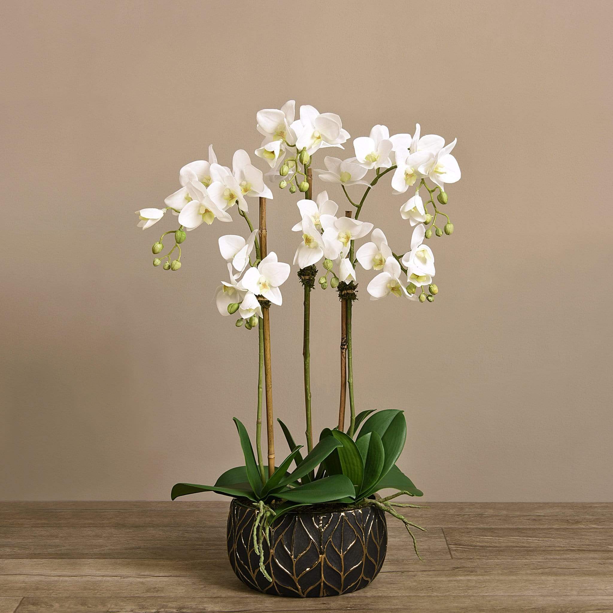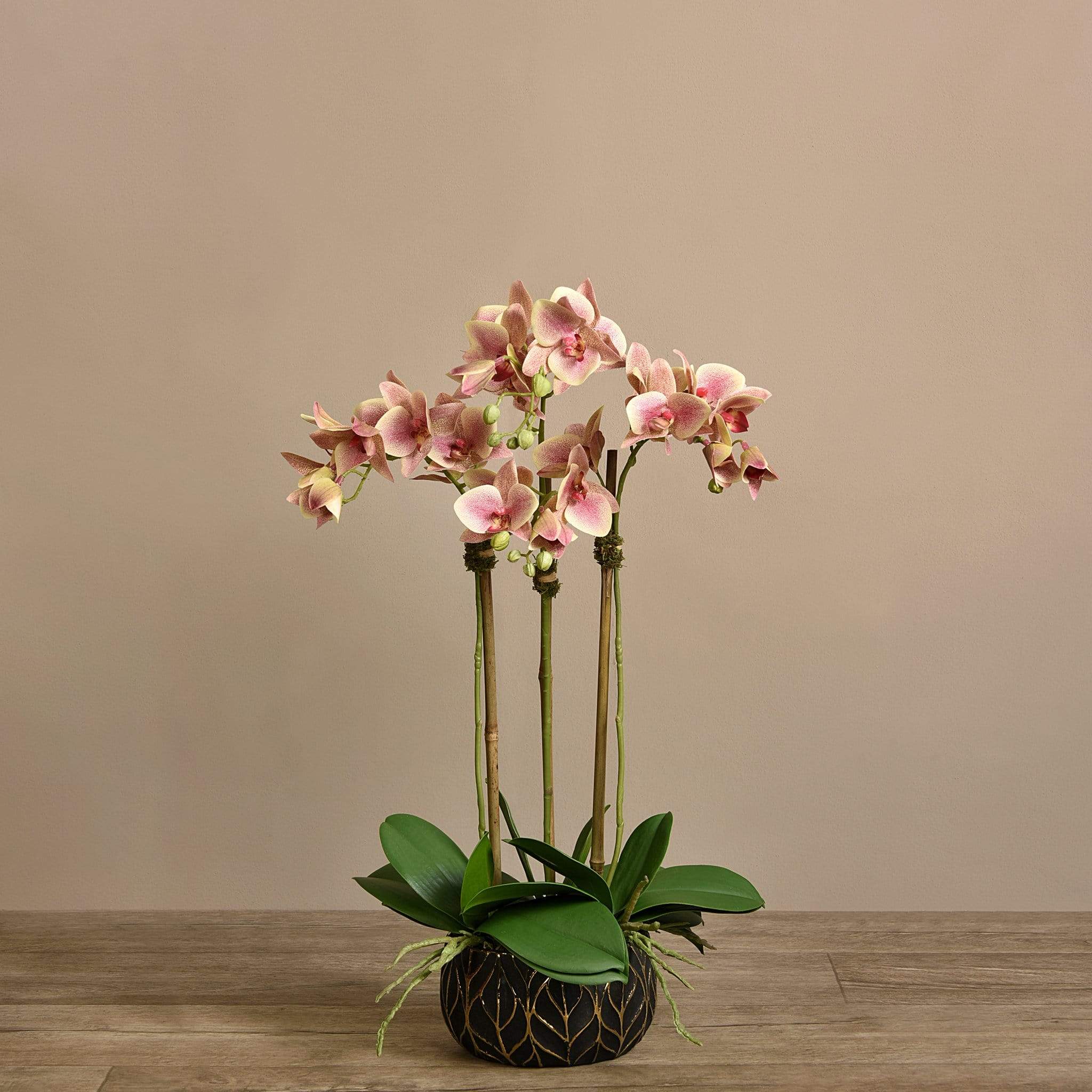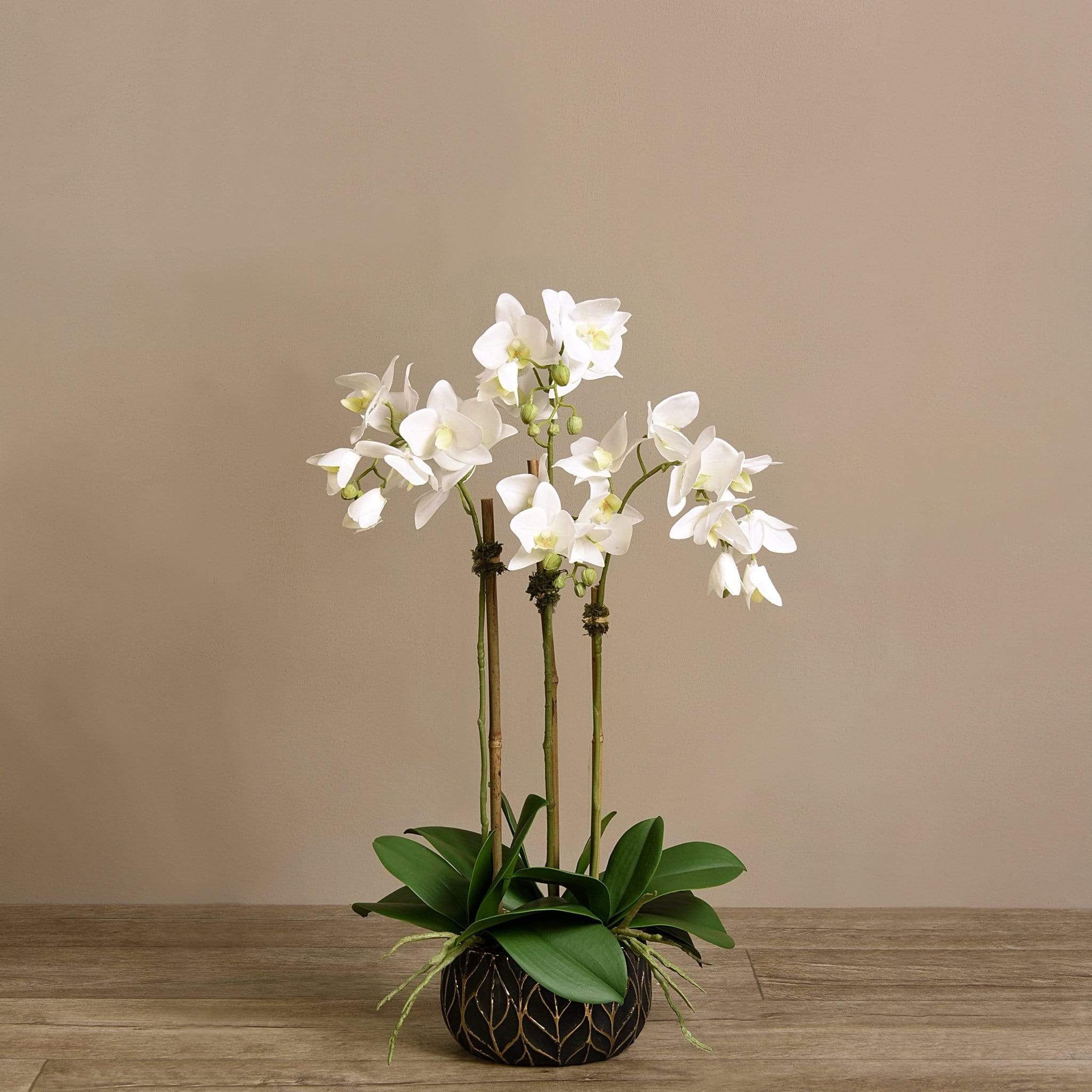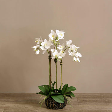 أضف حياة طويلة الأمد إلى منزلك مع هذه الأوركيد الجميلة. مصنوعة يدويًا من قبل بائعي الزهور الخبراء بتقنية اللمس الحقيقي ، تبدو هذه الأوركيد وكأنها نابضة بالحياة تمامًا. يتناسب وعاءهم الأسود والذهبي الأنيق المزين بأوراق الشجر مع أي ديكور.