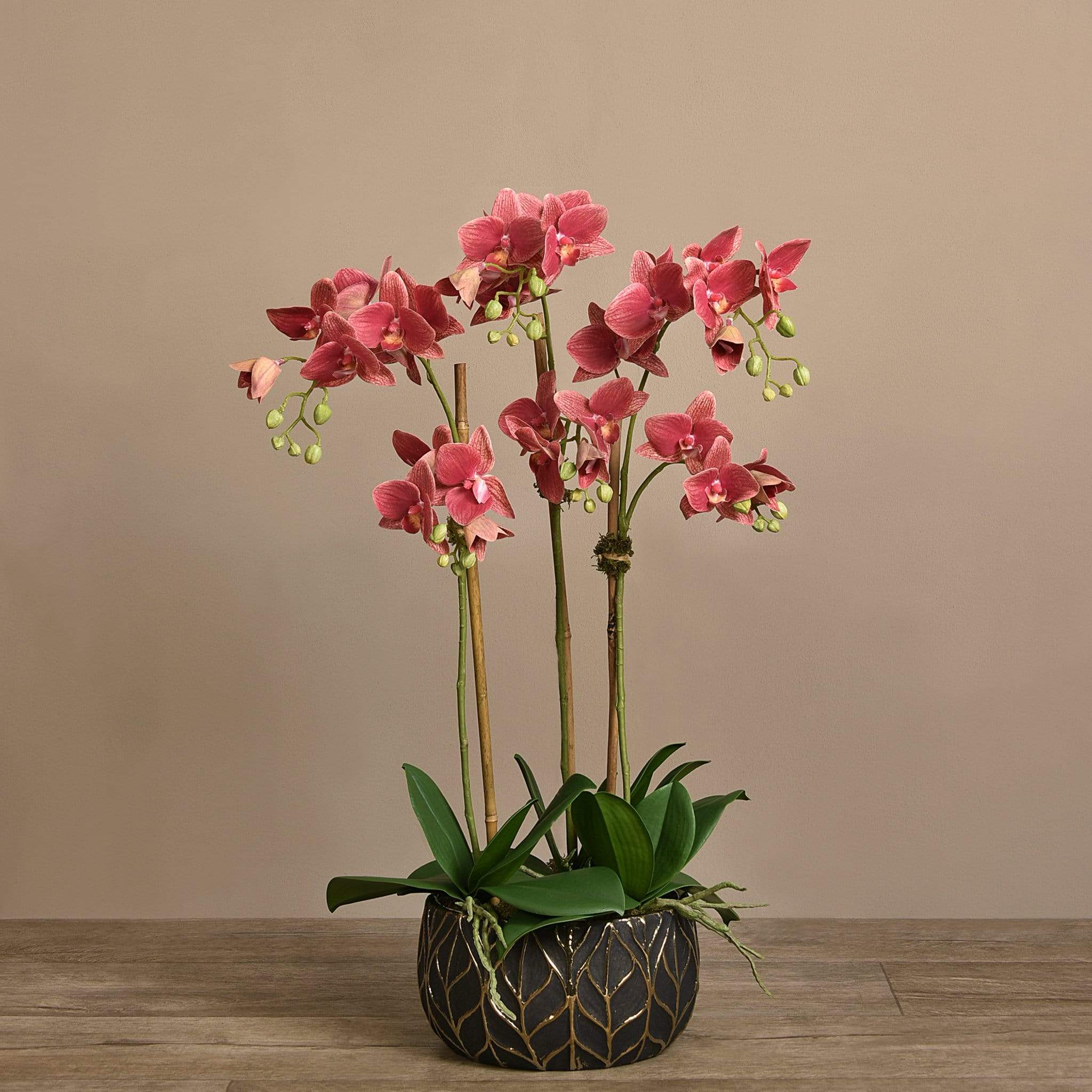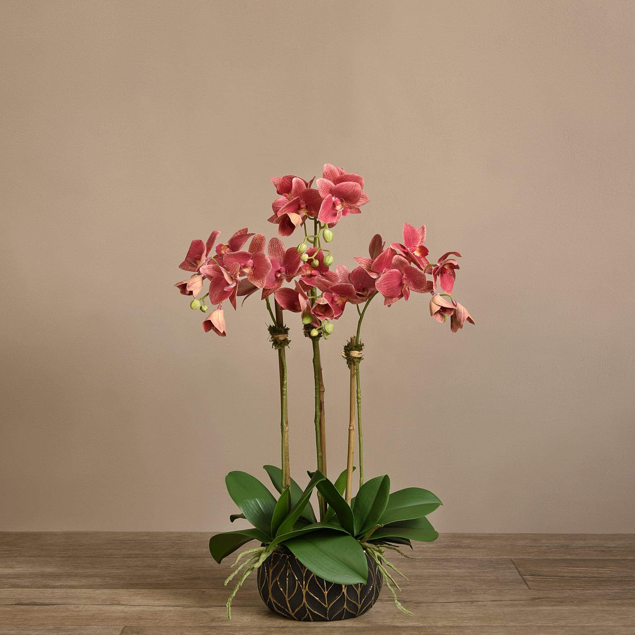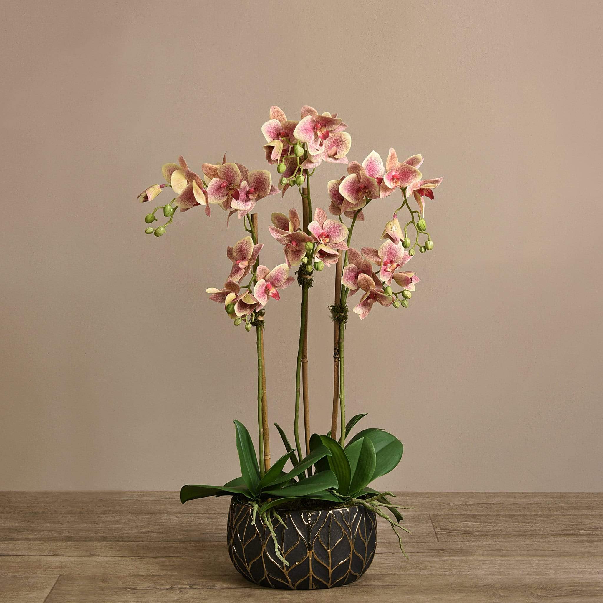 أضف حياة طويلة الأمد إلى منزلك مع هذه الأوركيد الجميلة. مصنوعة يدويًا من قبل بائعي الزهور الخبراء بتقنية اللمس الحقيقي ، تبدو هذه الأوركيد وكأنها نابضة بالحياة تمامًا. يتناسب وعاءهم الأسود والذهبي الأنيق المزين بأوراق الشجر مع أي ديكور.