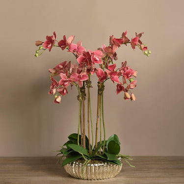 حوّل أي مساحة معيشة إلى ملاذ هادئ مع تنسيق الأوركيد الجميل هذا. مصنوعة من أزهار الأوركيد الحريرية بملمس واقعي، تبدو الأزهار طبيعية بشكل مذهل من البتلات إلى الجذور. يكمّل الأصيص الذهبي المعدني ذو الملمس الغني الأوراق الخضراء والأزهار البيضاء أو الوردية بشكل رائع.