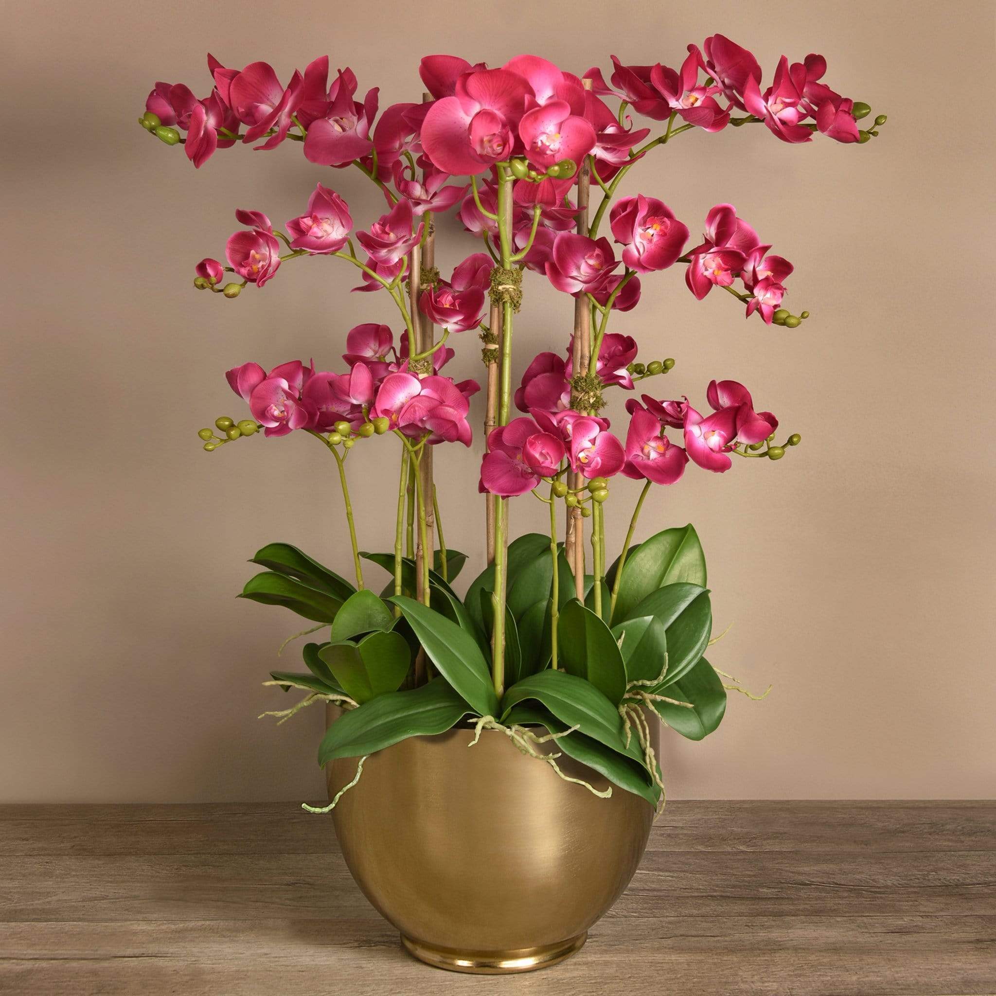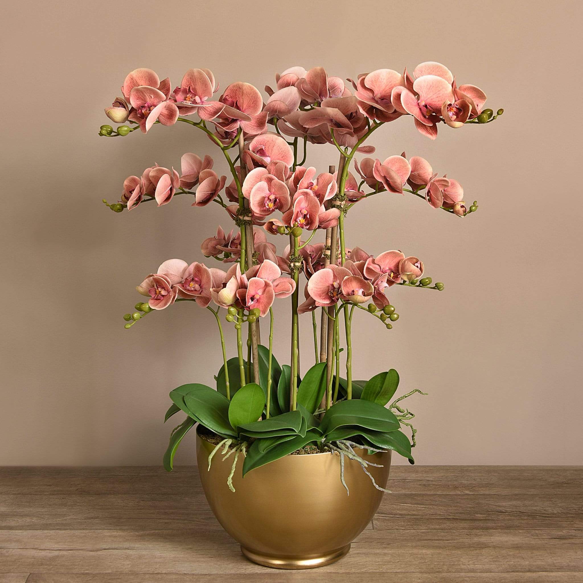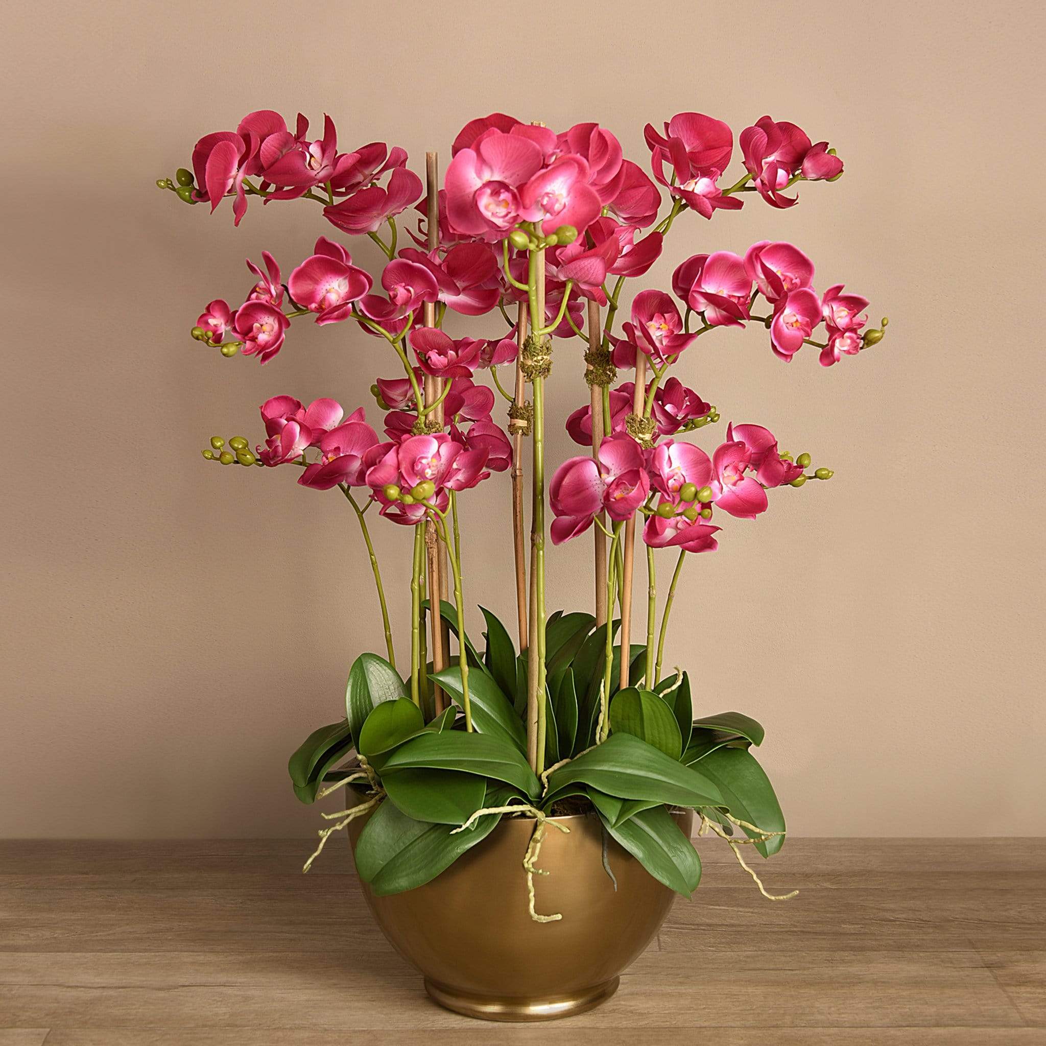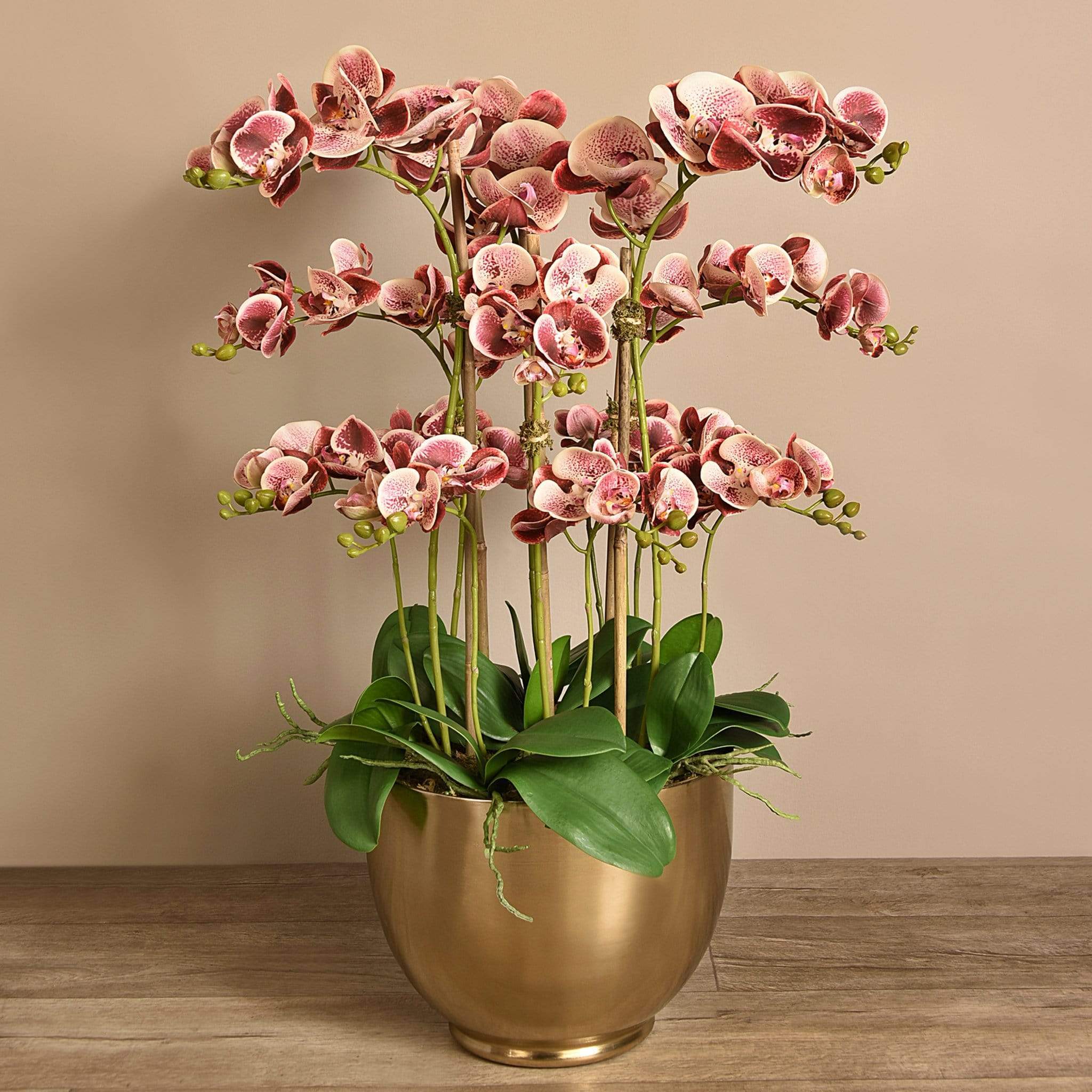 حوّل منزلك إلى واحة استوائية مع ترتيب الأوركيد الجميل هذا. مصنوعة يدويًا من قبل بائعي الزهور الخبراء باستخدام الحرير الفاخر ، تبدو هذه الأوركيد الاصطناعية وكأنها حقيقية بشكل مذهل. وعاءها الذهبي الكبير يجعلها القطعة المميزة المثالية.