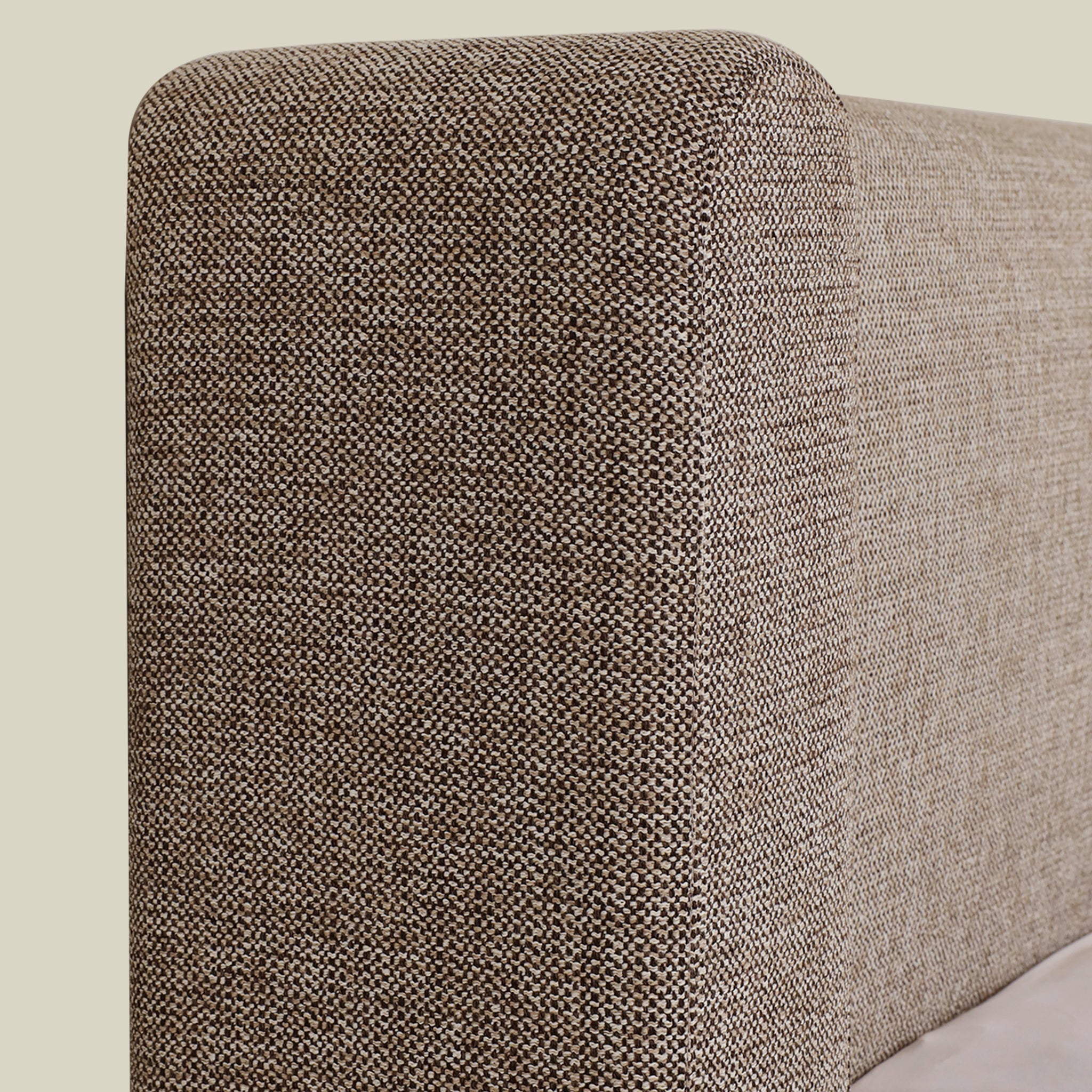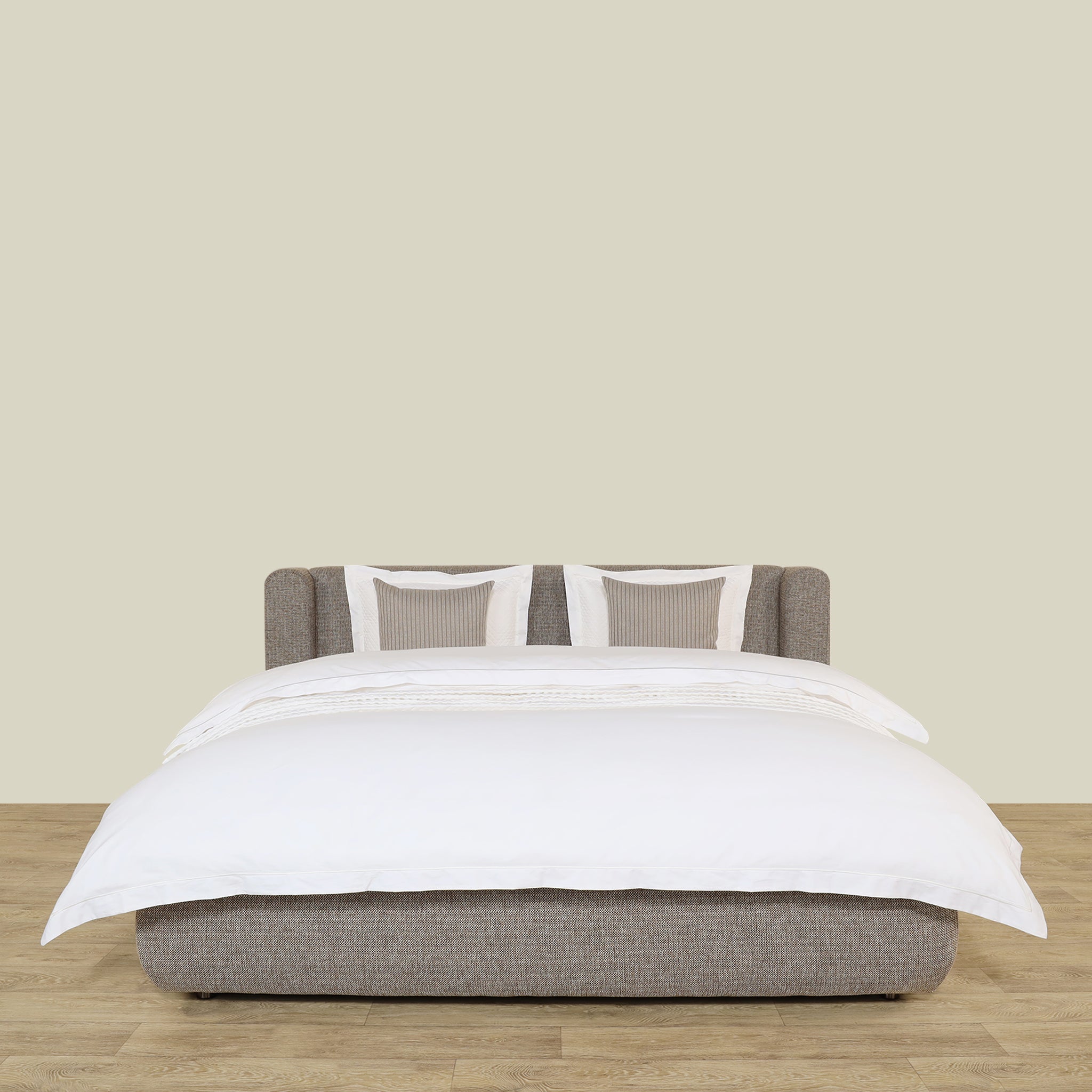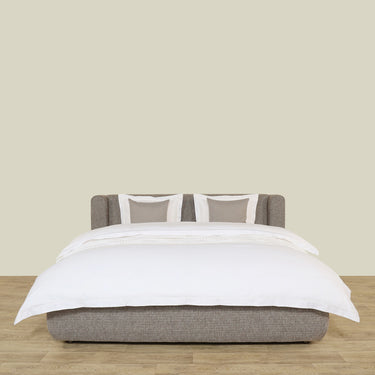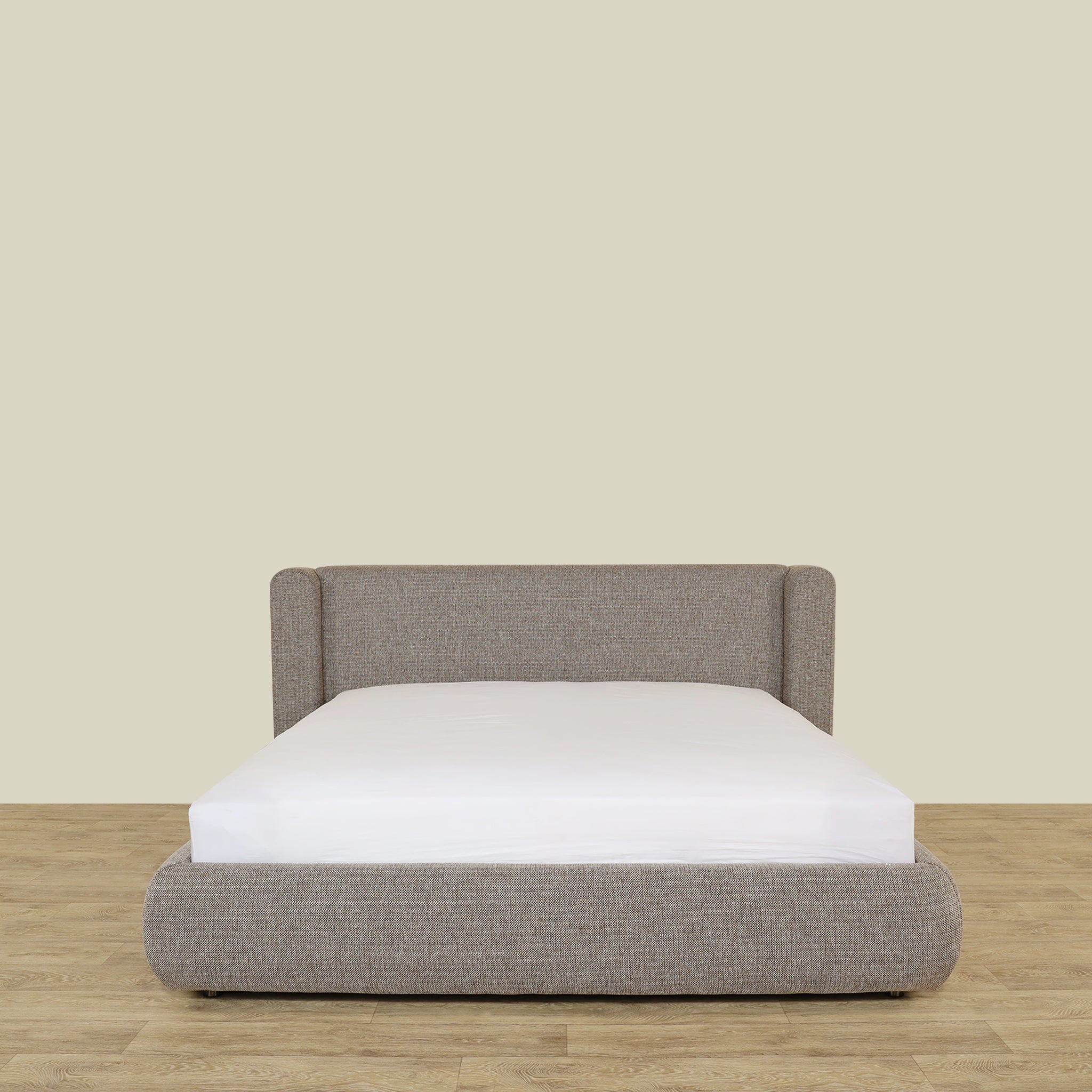 The Bed Snug features a solid wood frame complemented by elegant gray fabric, blending durability with a refined aesthetic.