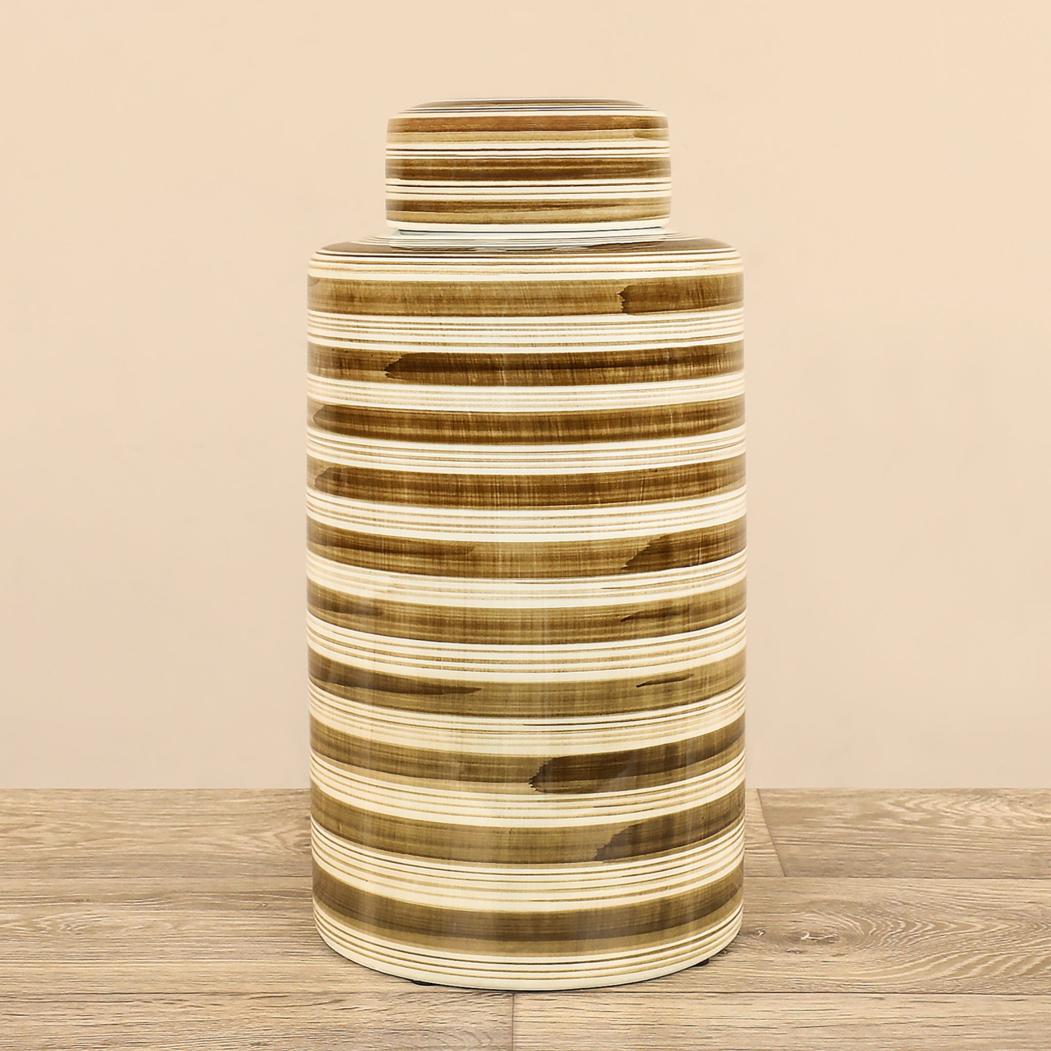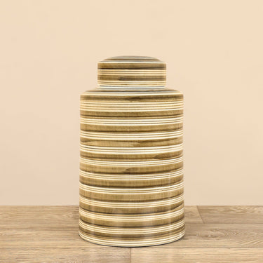 مثالية لأسلوب الديكور المعاصر، تتميز هذه الجرة الخزفية الجذابة بخطوط أفقية جريئة وشكل أنيق. تتميز هذه الجرة الخزفية بغطاء، وهي اختيار أنيق للعرض بمفردها أو مع أشياء مماثلة لخلق مشهد فريد.