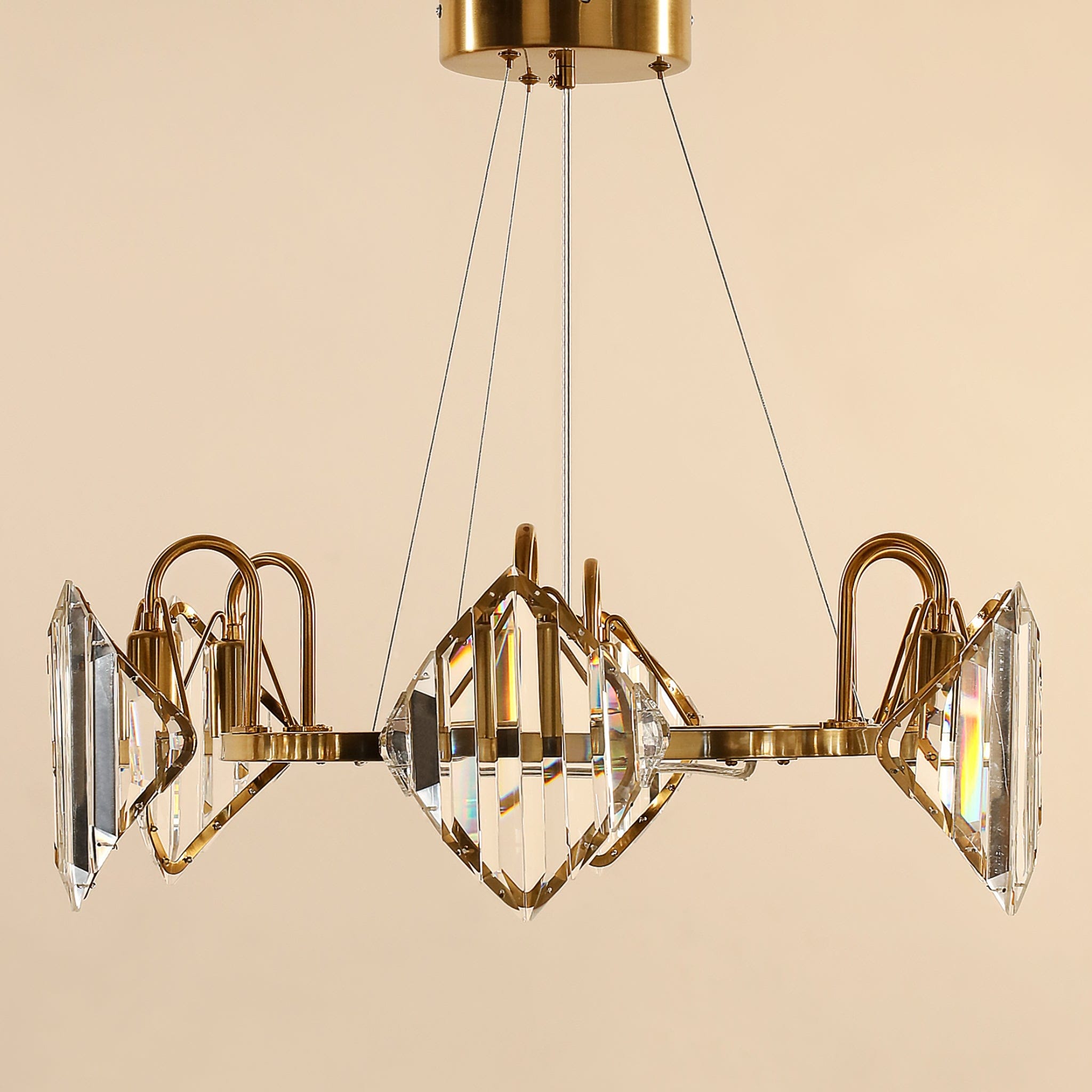 بتصميمه الأنيق والبسيط، تتميز هذه الثريا بقطع زجاجية متعددة الأوجه تنبثق منها إضاءة ساحرة ومتألقة.