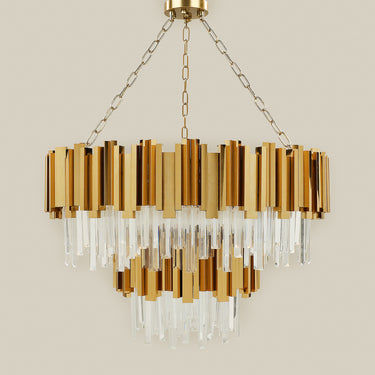 أضف لمسة مشرقة بتحديث جريء. ترتقي هذه الثريا الأنيقة بالشكل الكلاسيكي من خلال مكونات كريستالية متألقة وتشطيب ذهبي لامع، مما يضفي لمسة من الفخامة والتألق على أي مساحة.