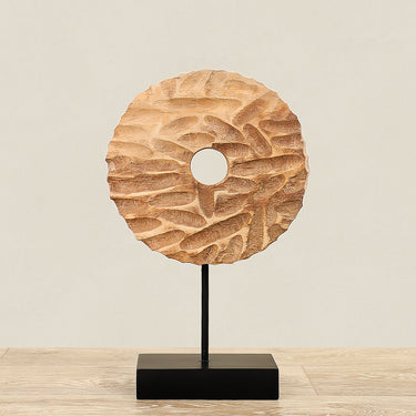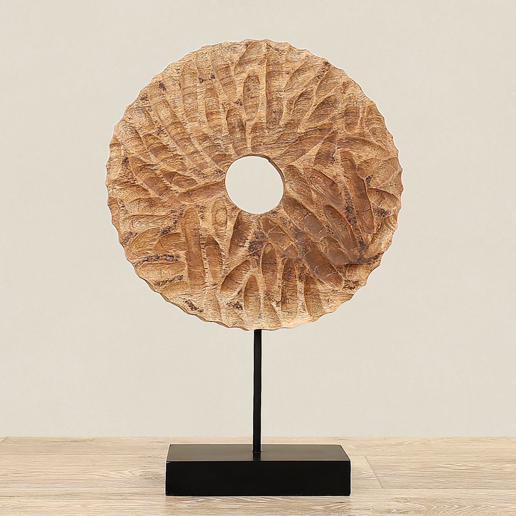 تمثال العجلة المحفورة على القاعدة هو قطعة ديكور رائعة تجمع بين الجمال الطبيعي لخشب المانجو وأناقة القاعدة الحديدية السوداء. يتميز التمثال بشكل دائري تم نحته بعناية لعرض الجوهر العضوي الخام للخشب، مع إبراز النقوش والأنماط الطبيعية التي تميز خشب المانجو، مما يضمن أن كل قطعة فريدة من نوعها.