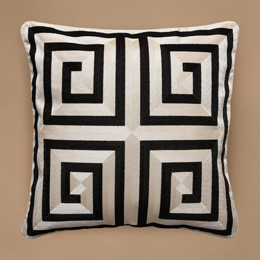 أضف لمسة أنيقة إلى غرفة الجلوس مع هذه الوسادة ذات اللمسات المربعة. إنها باللون الكريمي ونمط أسود مستوحى من اليونان ، وسحاب مغطى قوي ، ولمعان خفيف يجعلها إضافة مثالية إلى مقعدك الأسود.