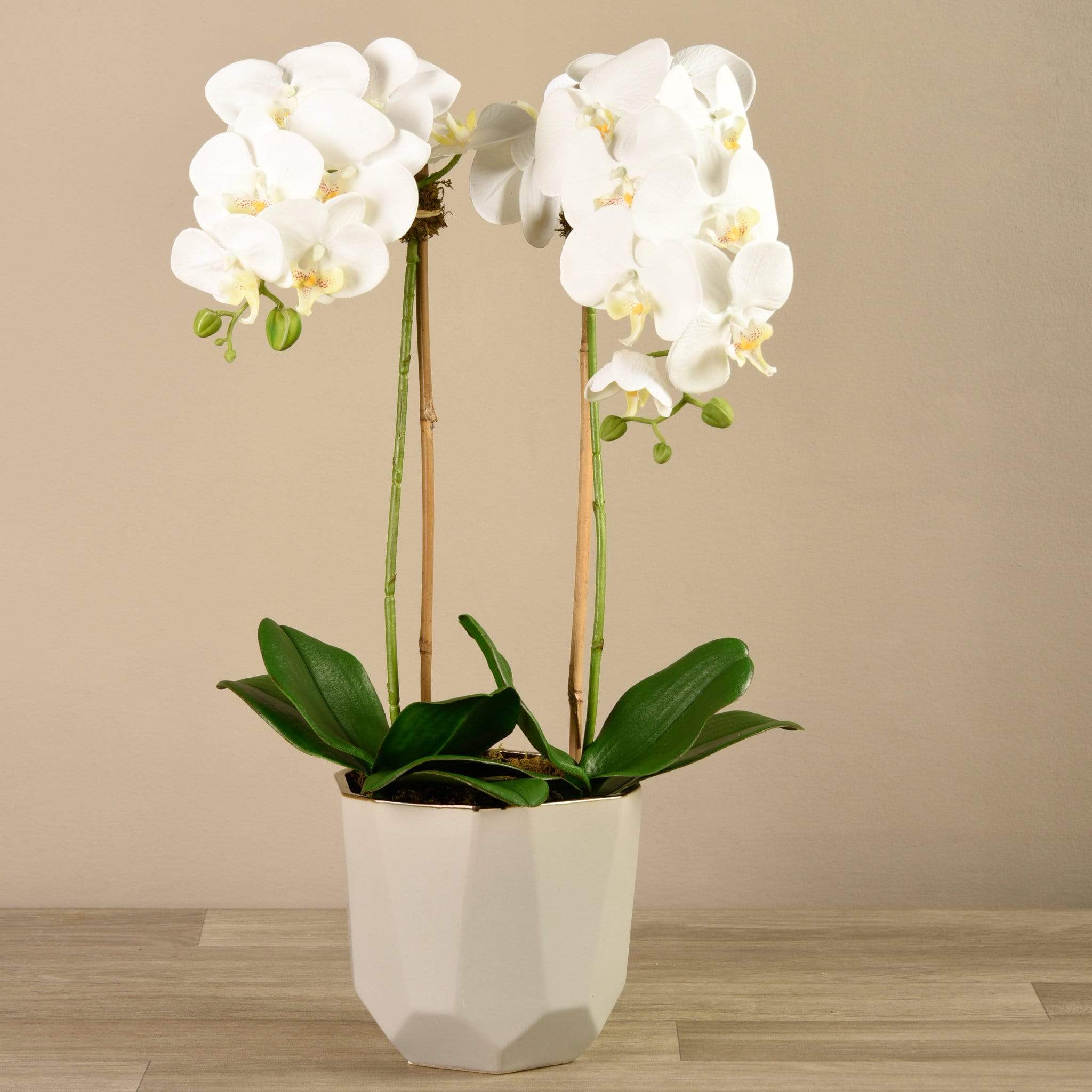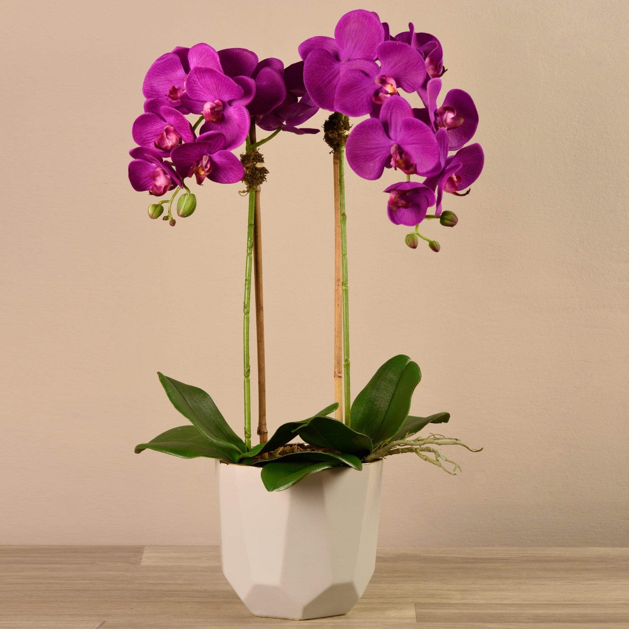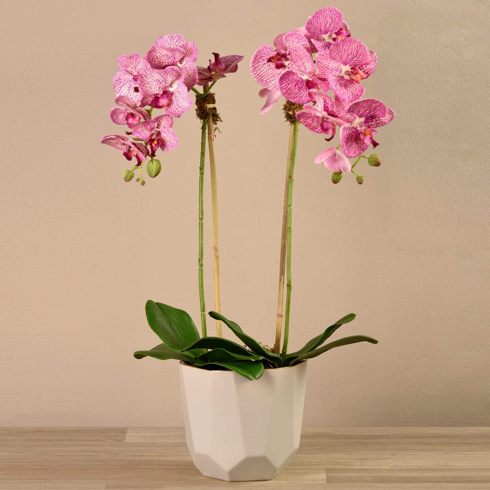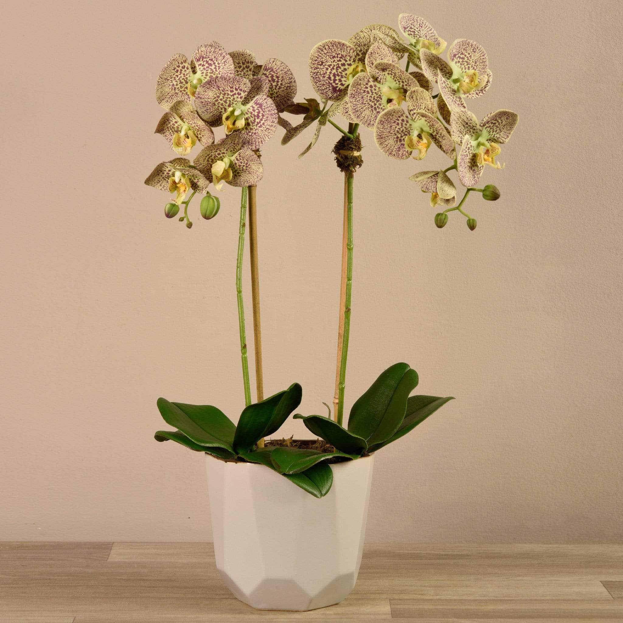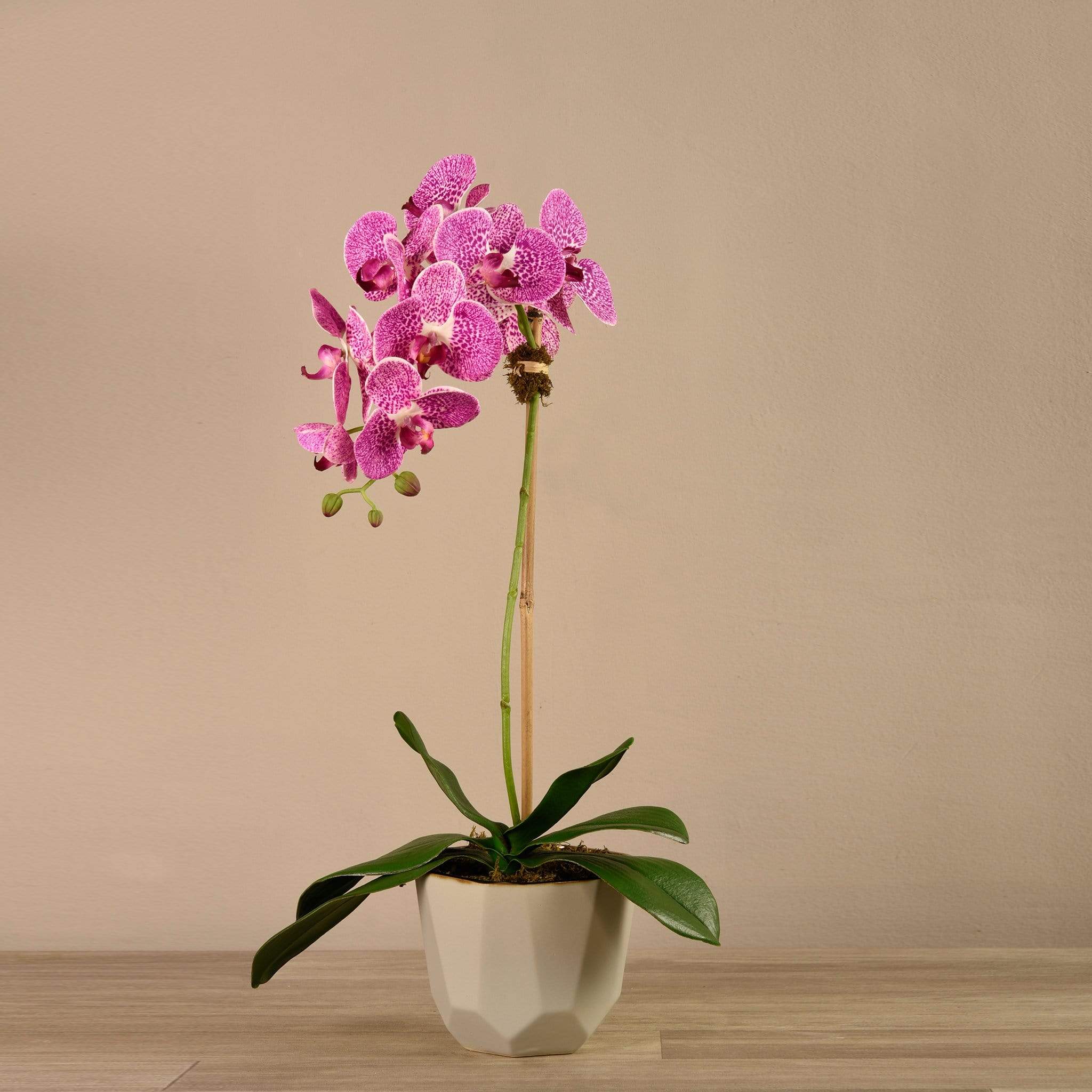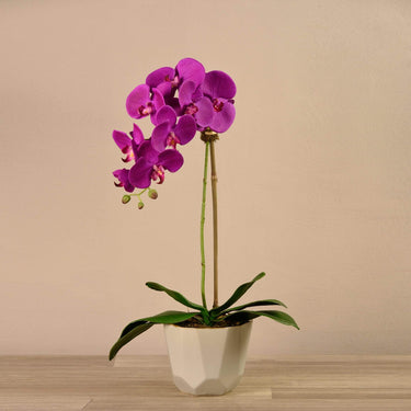 هذا التنسيق من الأوركيد هو تجسيد للأناقة العصرية. تجمع أزهار الأوركيد الحريرية الواقعية المذهلة مع أصيص بيج أنيق بتصميم هندسي، مما يضفي لمسة مميزة على أي غرفة معيشة أو منطقة انتظار.