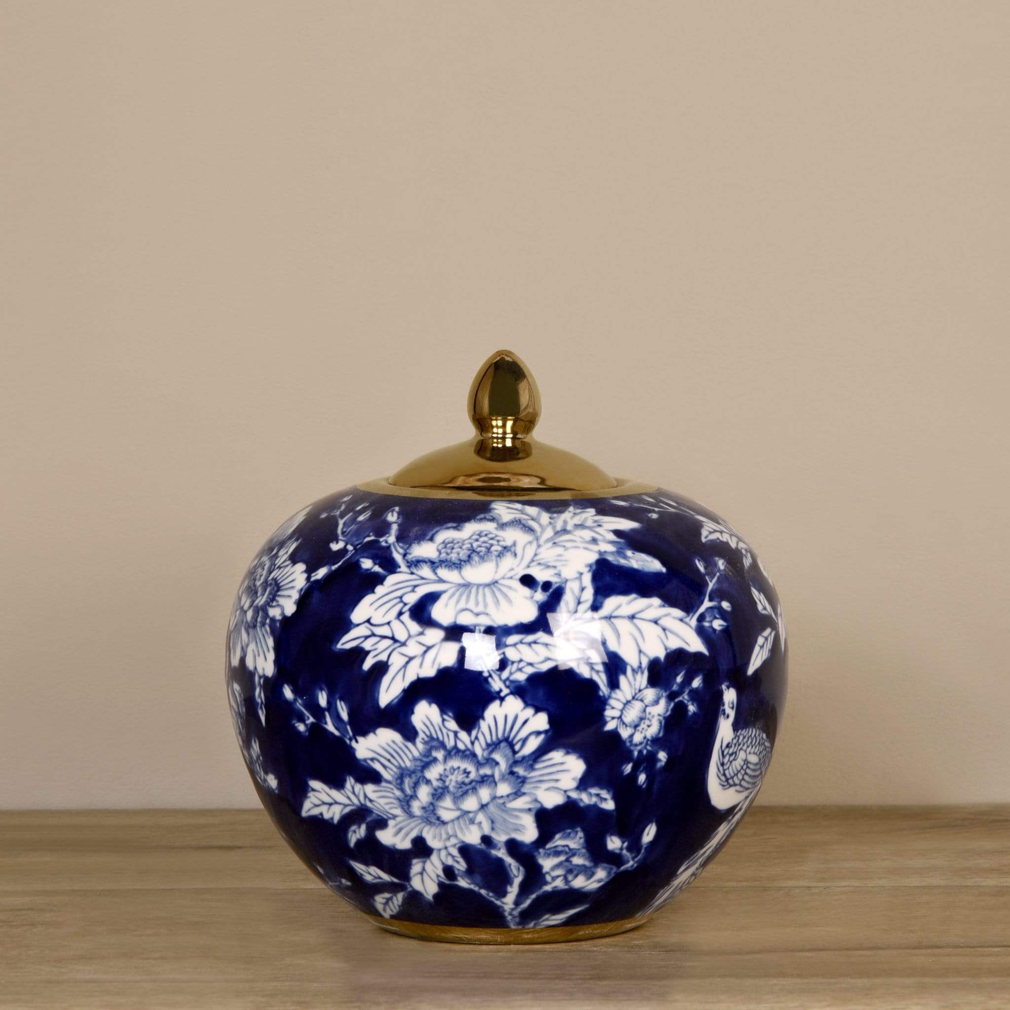 جرة بديعة بتصميم مستوحى من المقتنيات الأثرية. تتميز بزخارفها الأنيقة باللونين الأزرق والأبيض مع غطاء قابل للإزالة بمقبض ذهبي فاخر. إنها الإضافة المثالية لمطبخك أو غرفة معيشتك.