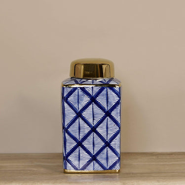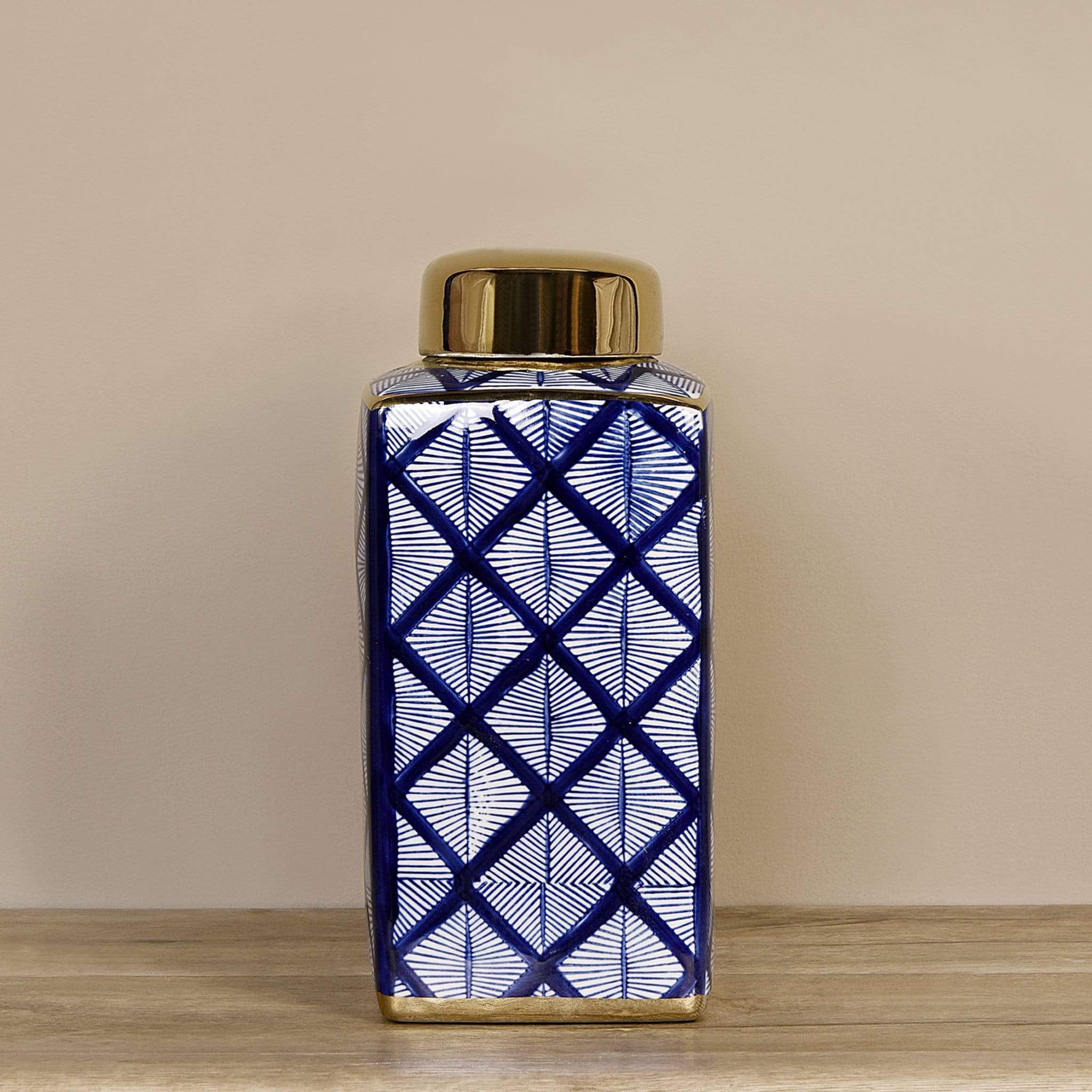 الاختيار المثالي لأصحاب الذوق الرفيع. هذه الجرة المستطيلة تأتي بزخارف على طراز اللوحات الفنية المرسومة بالألوان المائية. تأتيك باللونين الأبيض والأزرق المتدرج مع لمسات باللون الذهبي تضفي عليها رونق فريد، كما تأتي بغطاء قابل للإزالة لتحقيق أقصى قدر من العملية.
