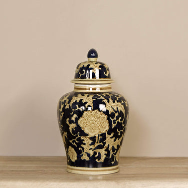 جمال استثنائي يجمع بين السحر التقليدي والأناقة العصرية. هذه الجرة تتميز بمنحنيات ناعمة وزخارف بديعة باللون الأزرق الداكن والبني الفاتح. تأتيك الجرة بغطاء قابل للإزالة يجعلها عملية في التخزين.