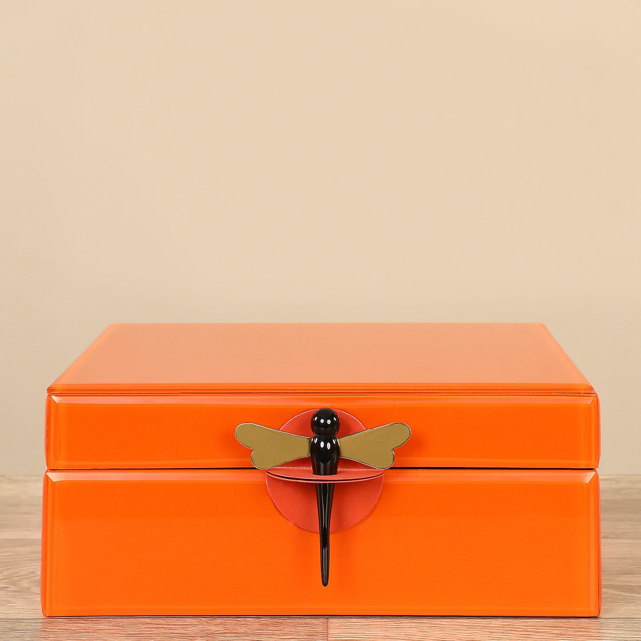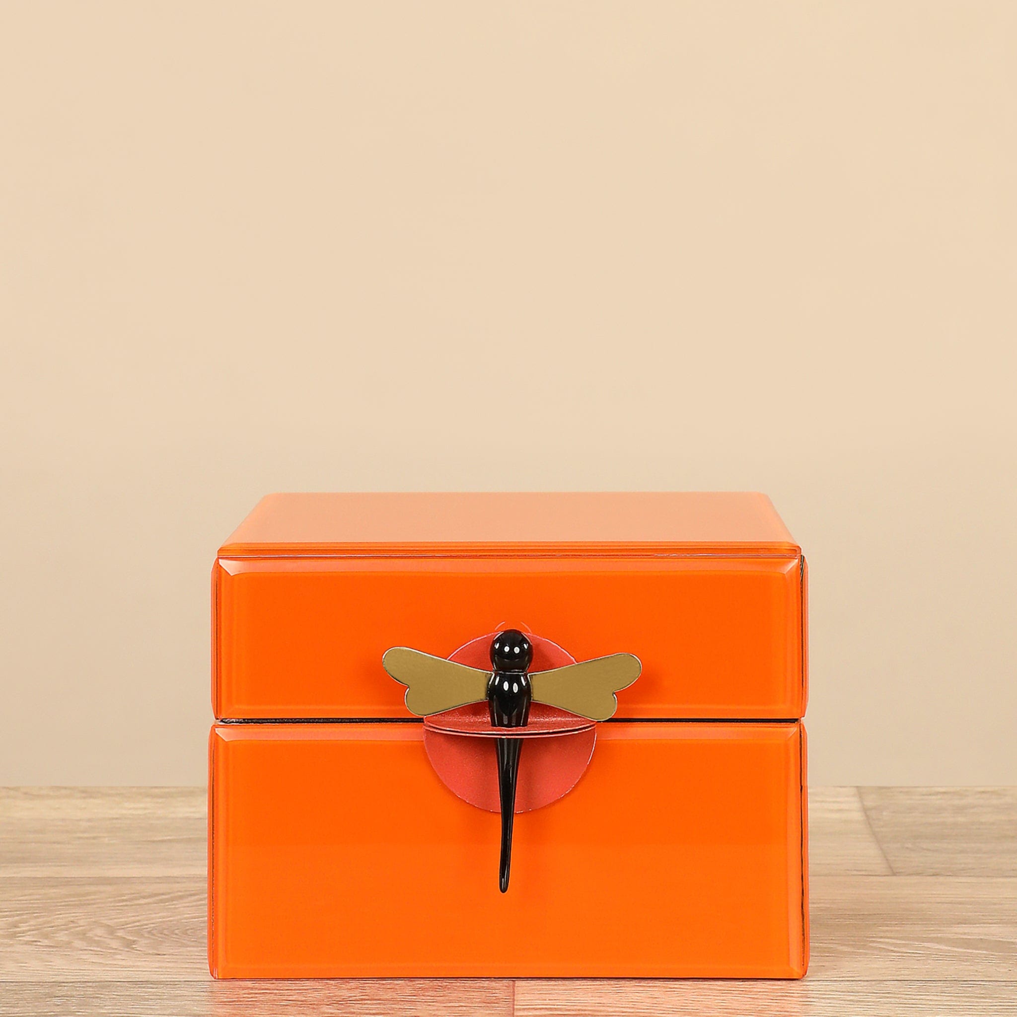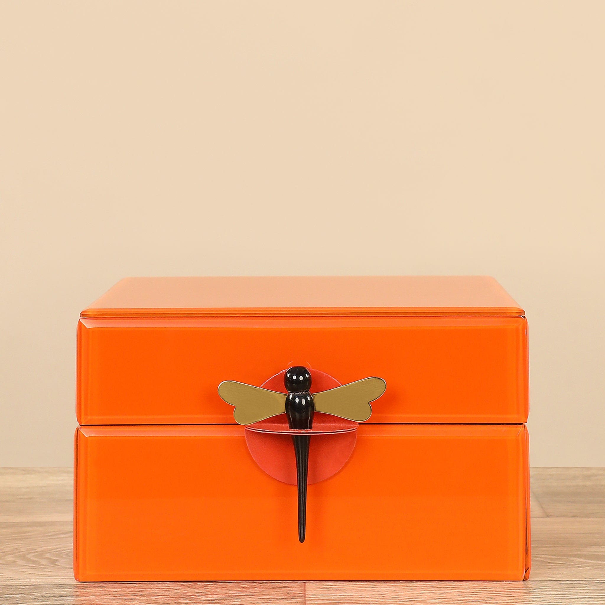 يتميز صندوق المجوهرات الأنيق هذا بلمسة نهائية برتقالية لامعة وحيوية، ويتميز بمشبك يعسوب مميز يجعله مميزًا. بفضل حجمه المثالي لاستيعاب كل شيء من المجوهرات الثمينة إلى التذكارات العزيزة، من المؤكد أن هذا الصندوق الأنيق سيضيف جاذبية إلى أي سطح.