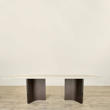 طاولة طعام ليوني ترتكز على قائمتين منحنيتين أنيقتين، مما يضفي عليها لمسة عصرية تناسب أجواء الضيافة الراقية والوجبات العائلية. يتميز سطح الطاولة بحجر الباندورا المصنّع ذو العروق الجميلة، بينما تأتي القواعد مصنوعة من ستانلس ستيل المصقول باللون البني القهوي، مما يضيف لمسة من الطابع الصناعي.