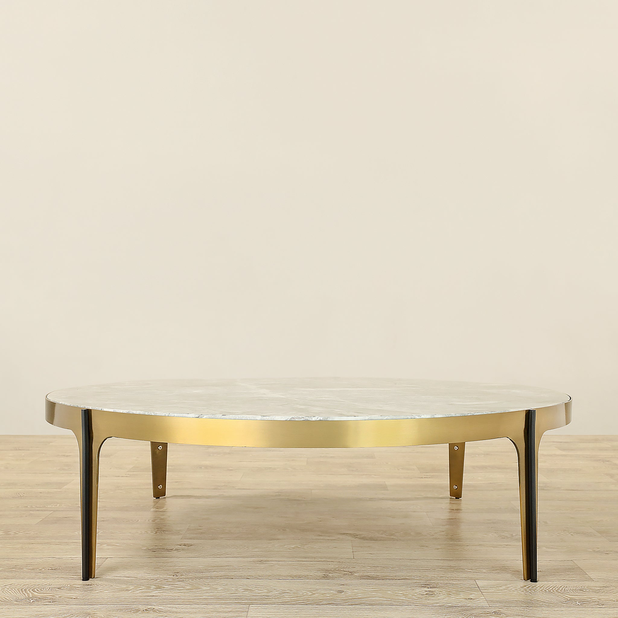 طاولة القهوة مورا، الفاخرة والجميلة، تعد خيارًا مثاليًا لإكمال منطقة الجلوس. تتميز بحجمها الدائري الكبير، وحوافها المعدنية اللامعة، وسطحها المصنوع من الرخام الصناعي، مما يجعلها قطعة متينة ومبهرة تدوم لسنوات.