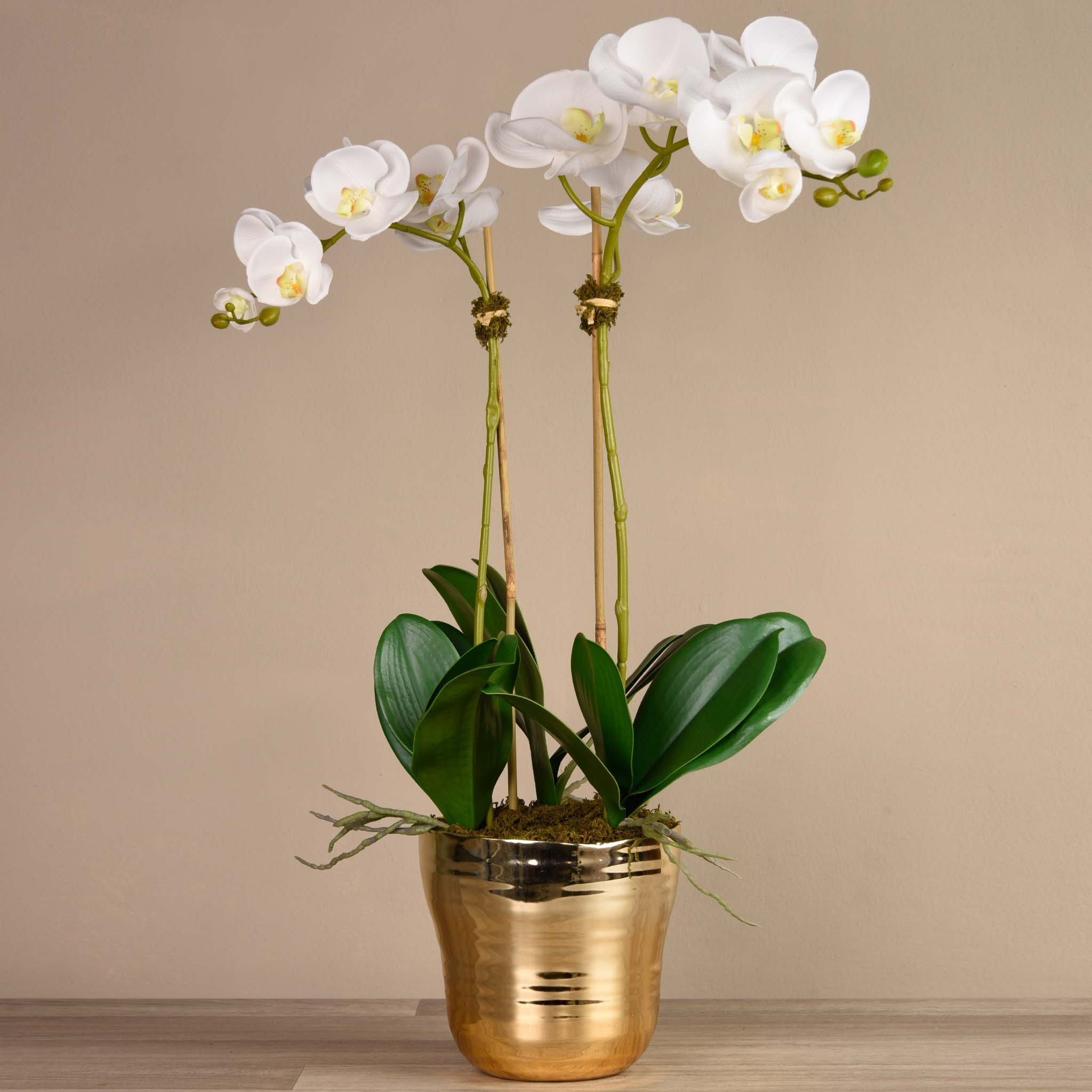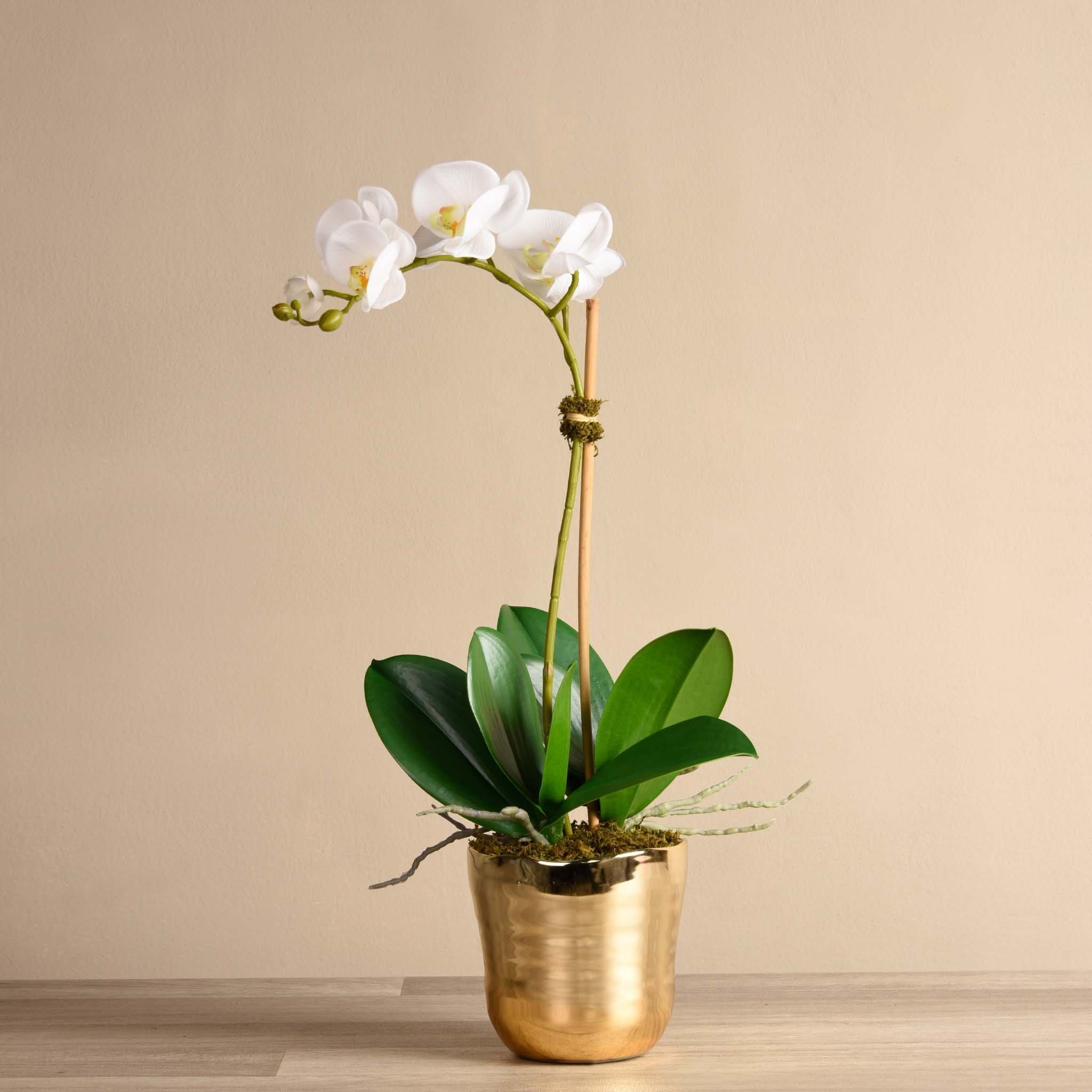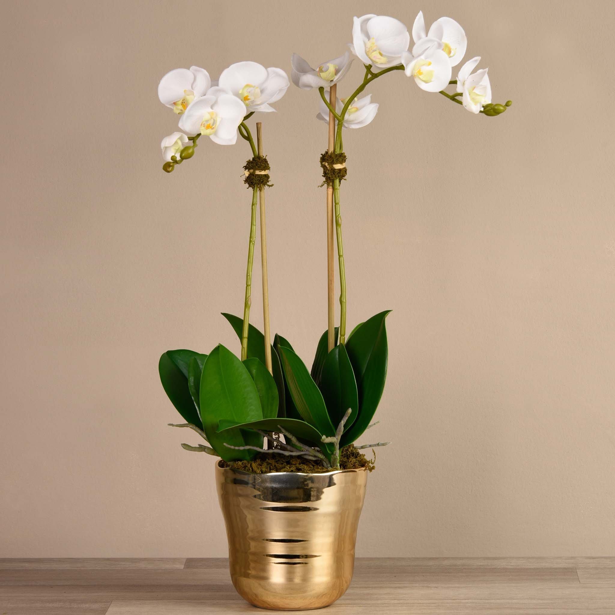 يحوّل تنسيق الأوركيد الصناعي هذا أي مساحة معيشة من عادية إلى فاخرة على الفور. تقف أزهار الأوركيد الحريرية الطويلة والأنيقة في أصص ذهبية عالية، تضفي ارتفاعًا واتساعًا على الغرفة. بفضل تقنية الملمس الواقعي، تبدو هذه الأزهار الصناعية خالية من الصيانة وكأنها طبيعية تمامًا.
