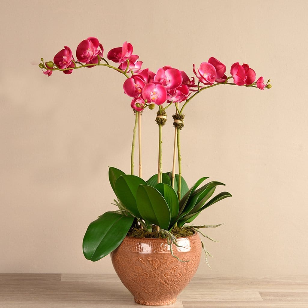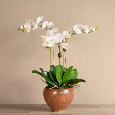 يضيف هذا الأصيص الفخاري المصقول لمسة ترابية تقليدية إلى تنسيقات الأوركيد الصناعية الفاخرة. يتم تنسيق كل زهرة أوركيد حريرية بملمس واقعي حسب الطلب من قِبل خبراء لتبدو بشكل مذهل وكأنها طبيعية.
