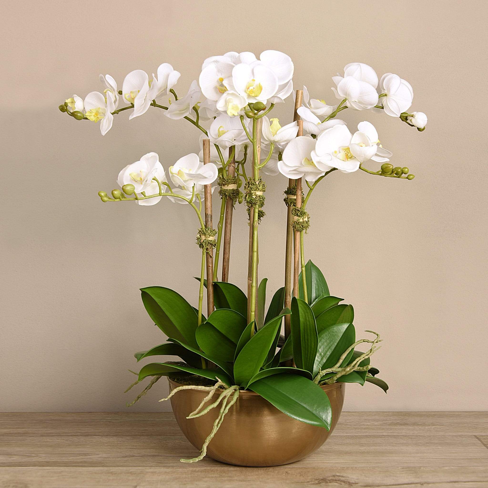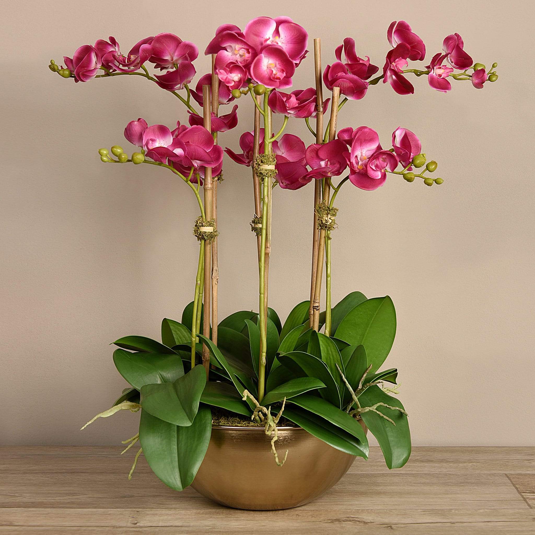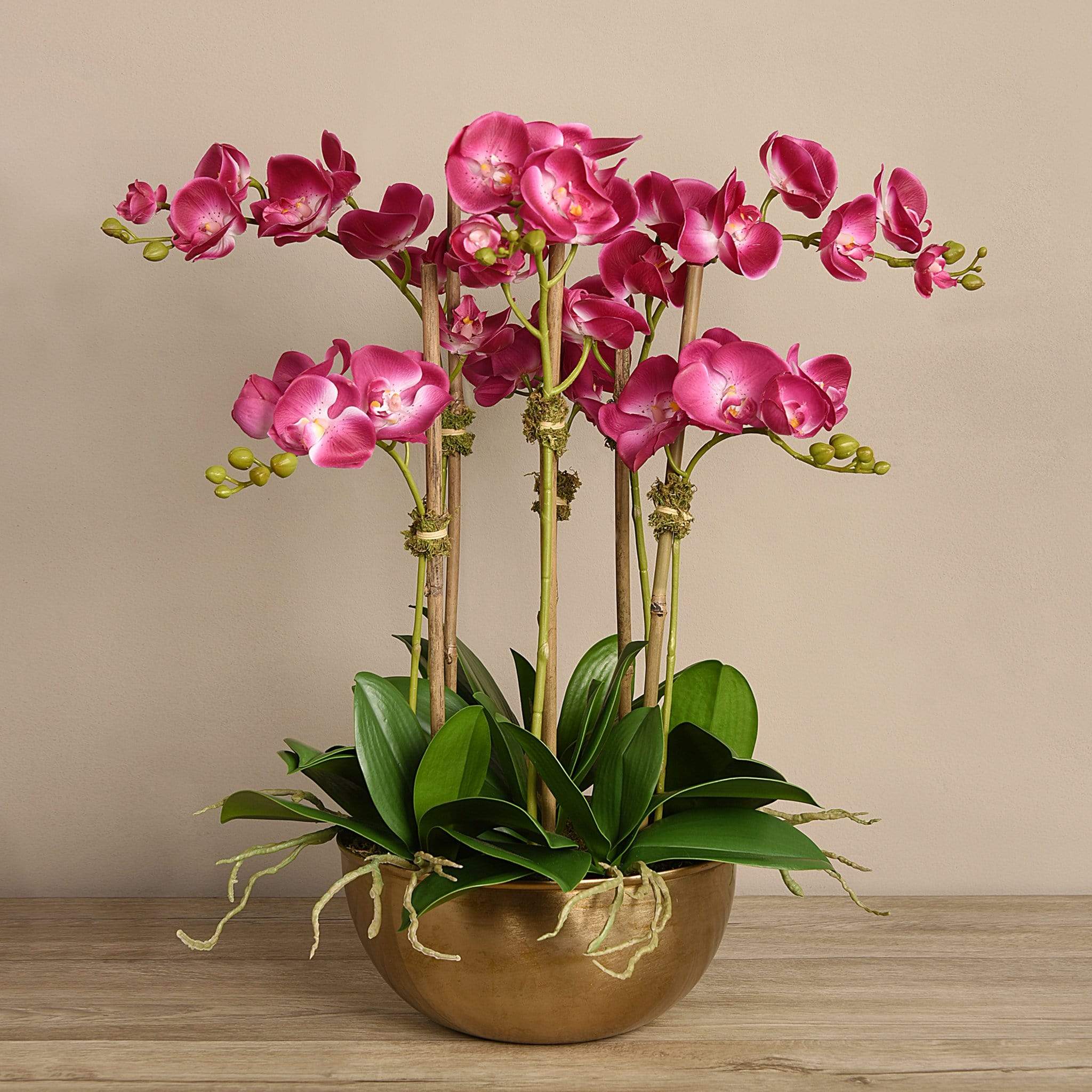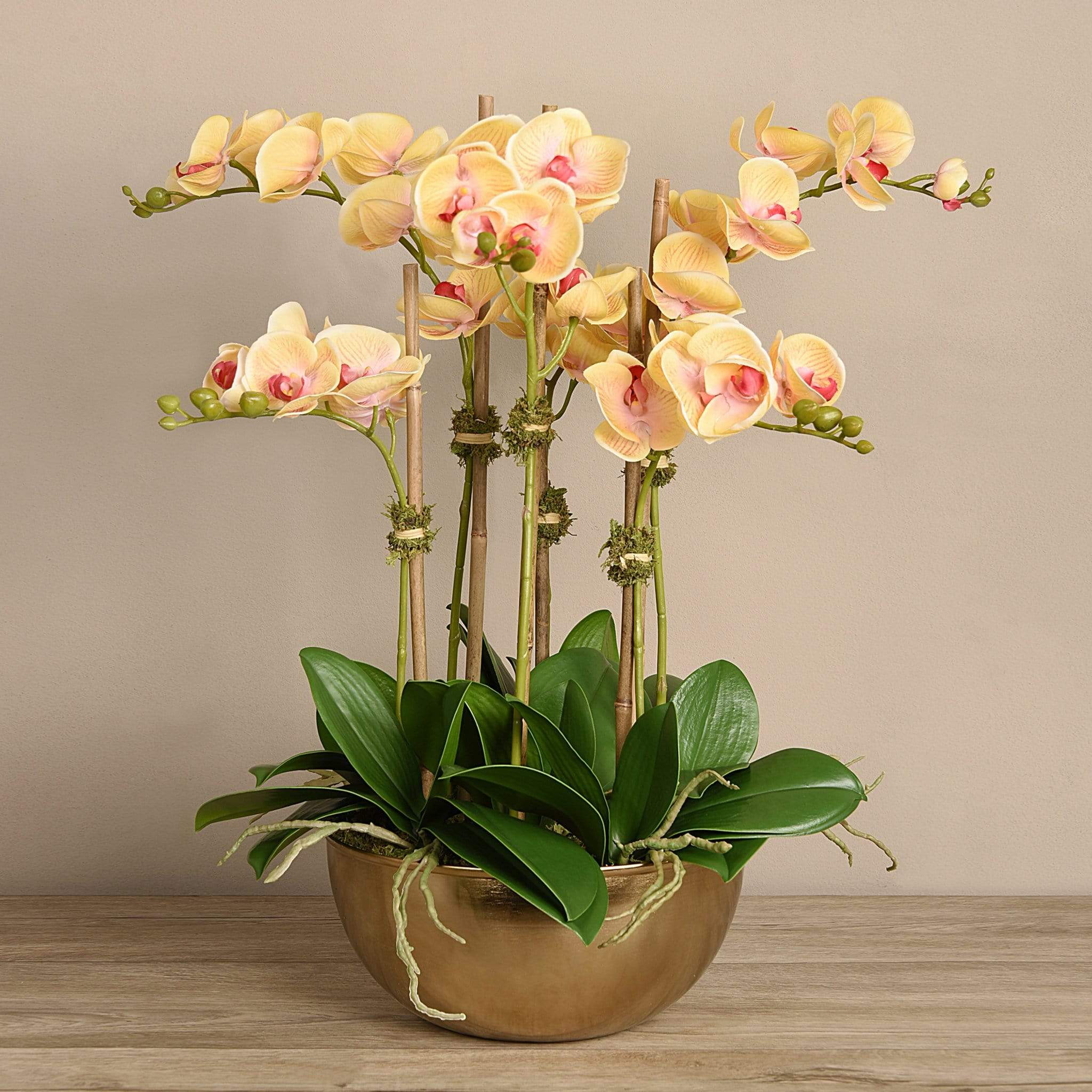 ترفع بساتين الفاكهة الاصطناعية الملكية هذه على الفور أي مساحة للعيش. مصنوعة يدويًا باستخدام تقنية اللمس الحقيقي ، تبدو بتلاتها وسيقانها وأوراقها المورقة حقيقية بشكل ملحوظ. وعاءهم المعدني المصنوع من الذهب يكمل بشكل جميل الأوراق الخضراء.