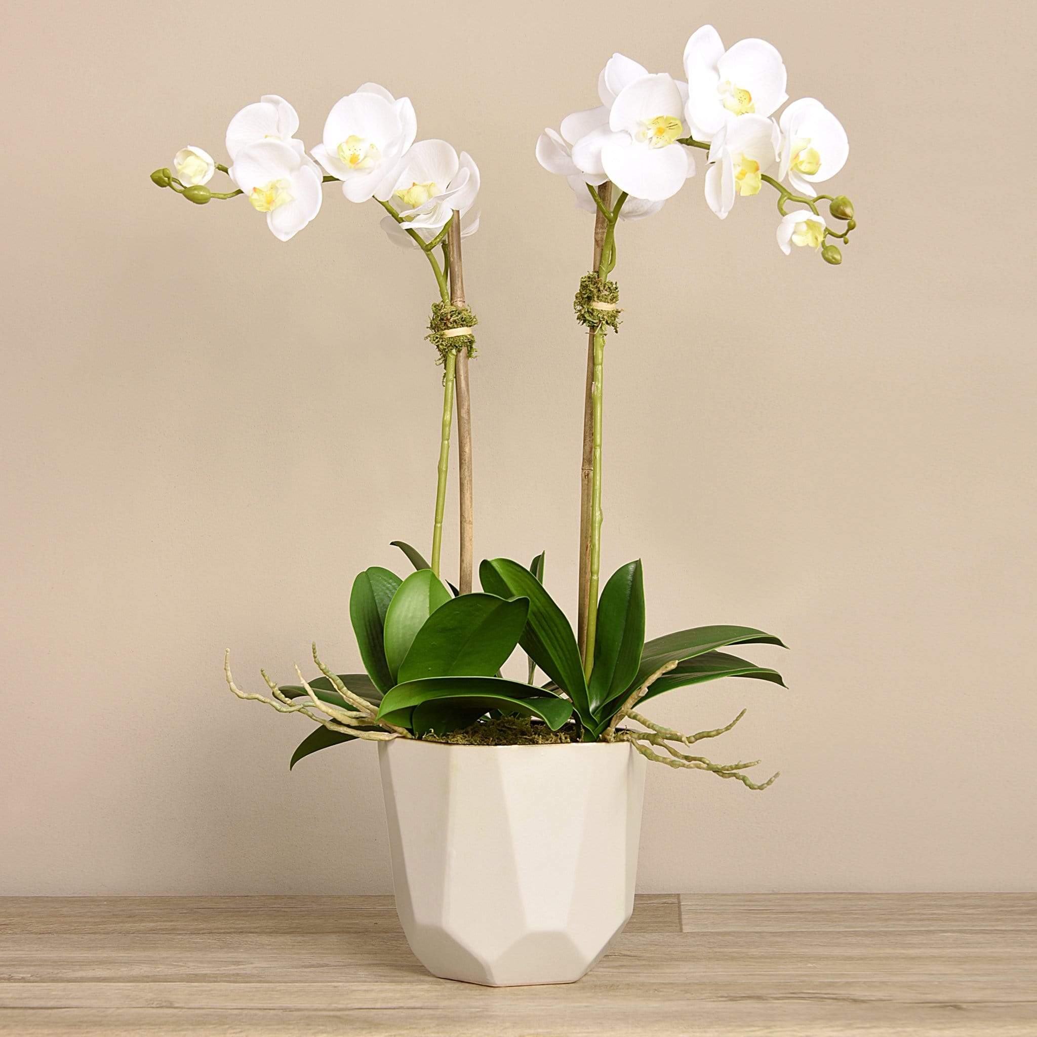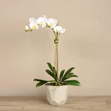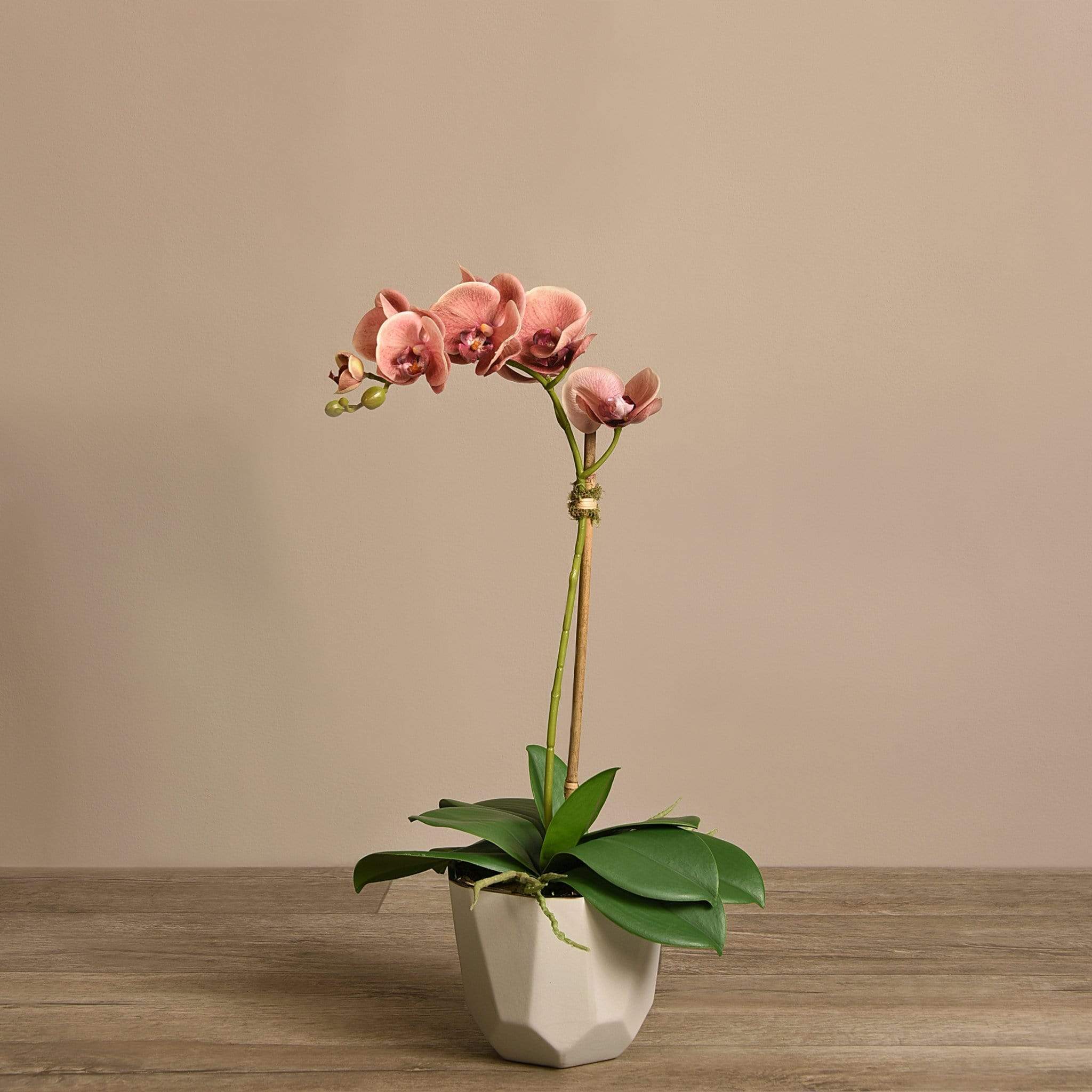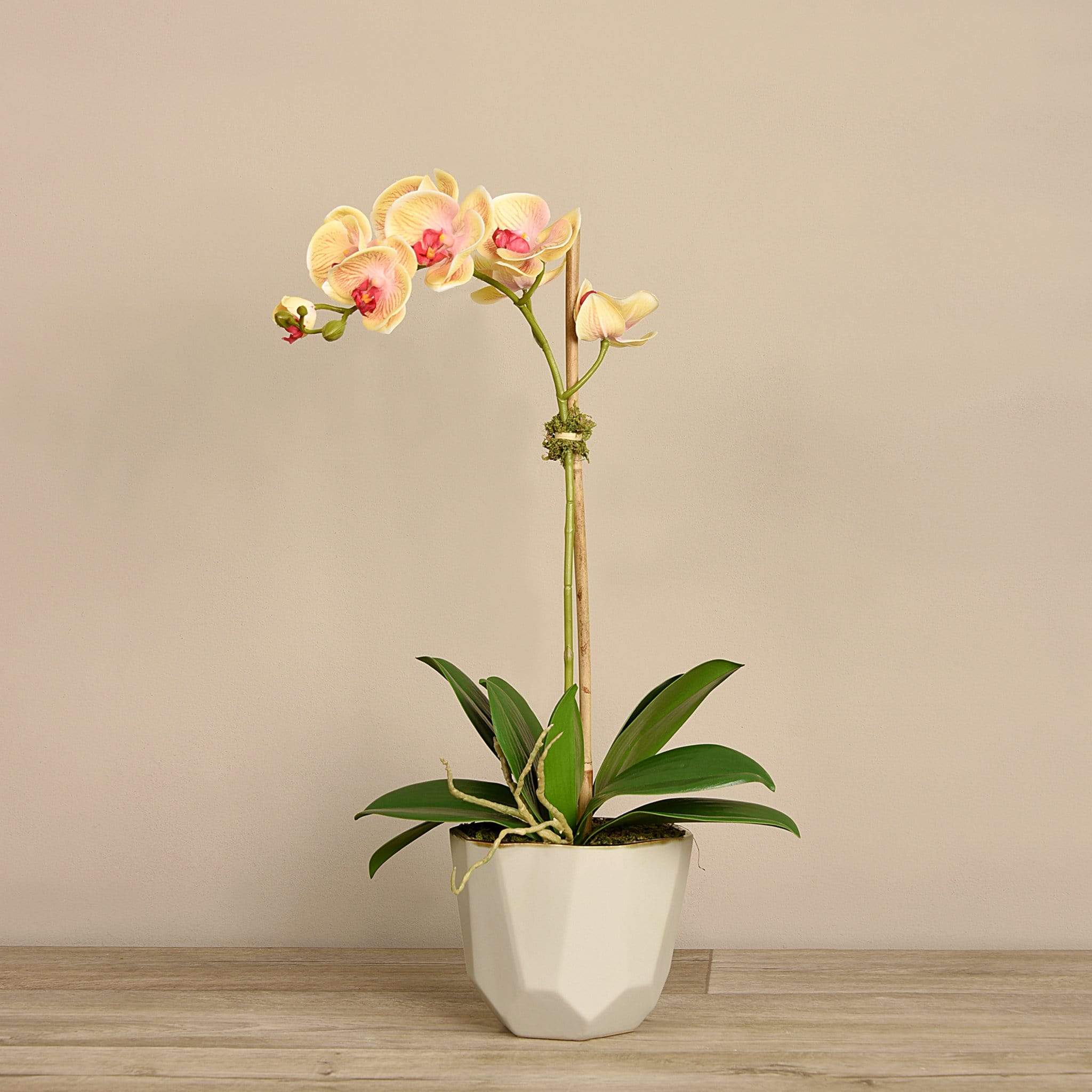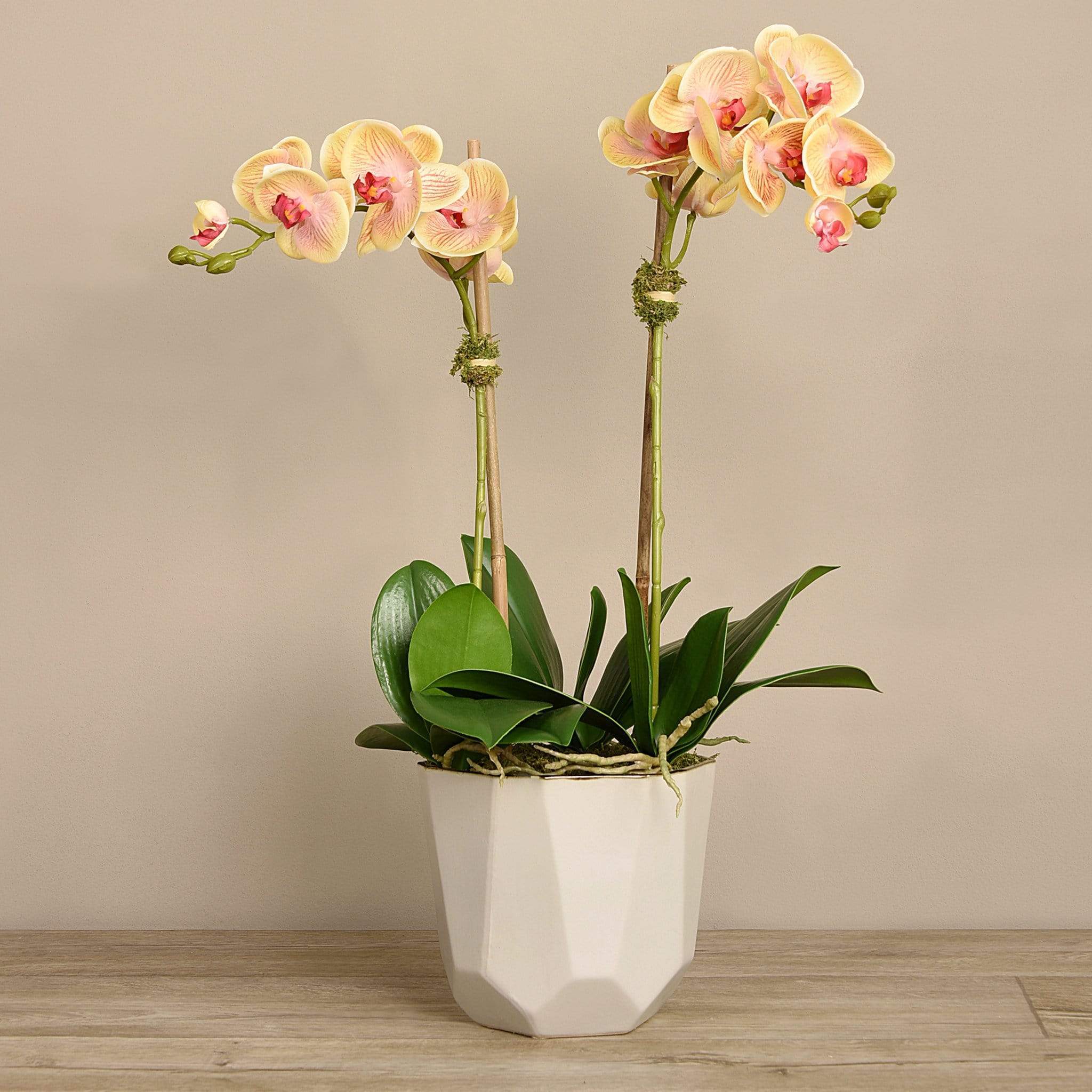 هذا الترتيب الأوركيد هو تعريف الأناقة الحديثة. زهور الأوركيد الحريرية المذهلة والنابضة بالحياة المقترنة بوعاء بيج هندسي أنيق تجعل البيان تمامًا في أي غرفة معيشة أو منطقة انتظار.