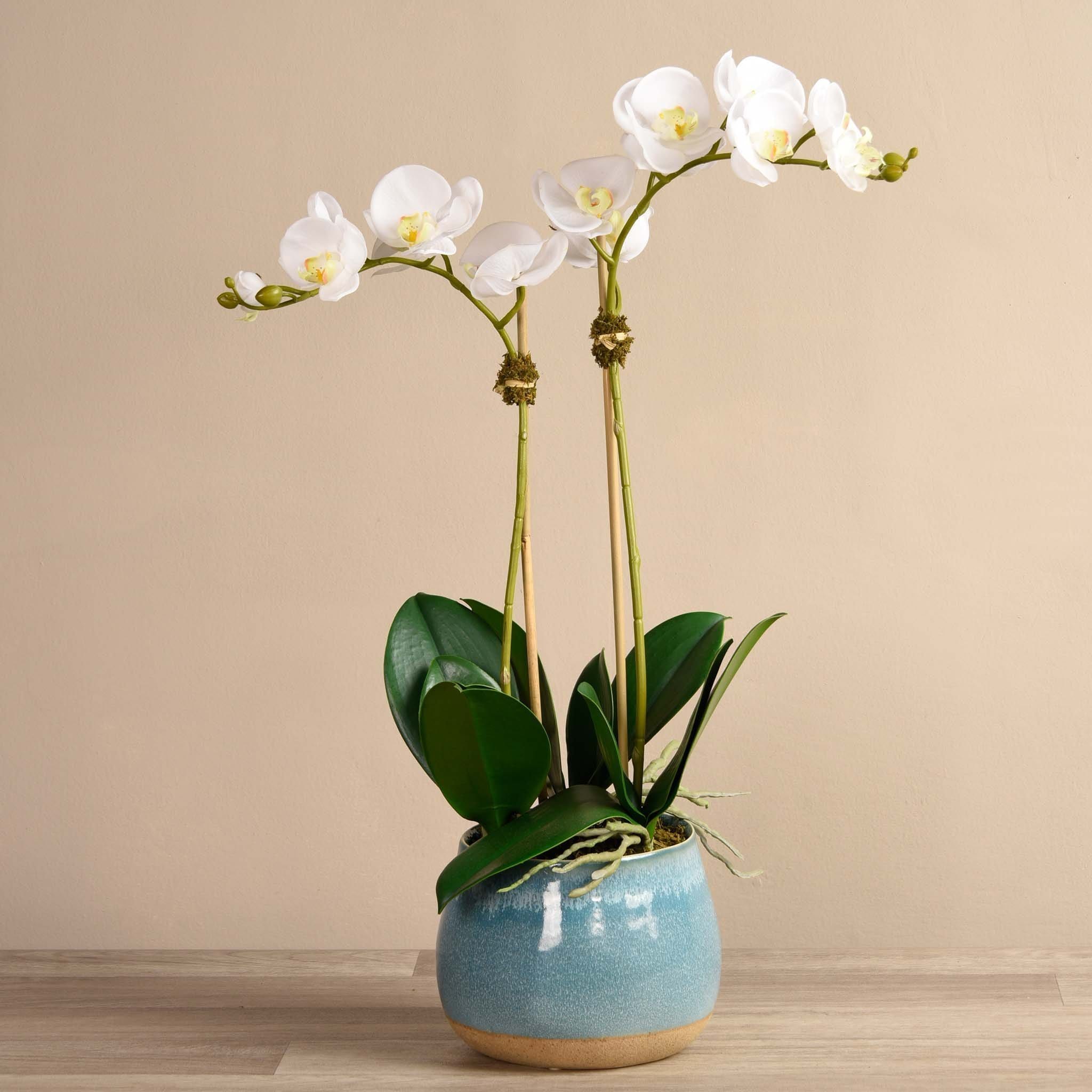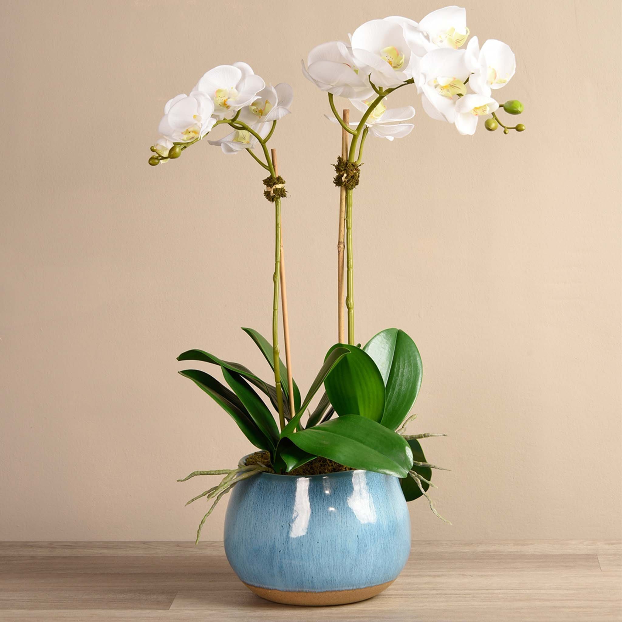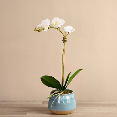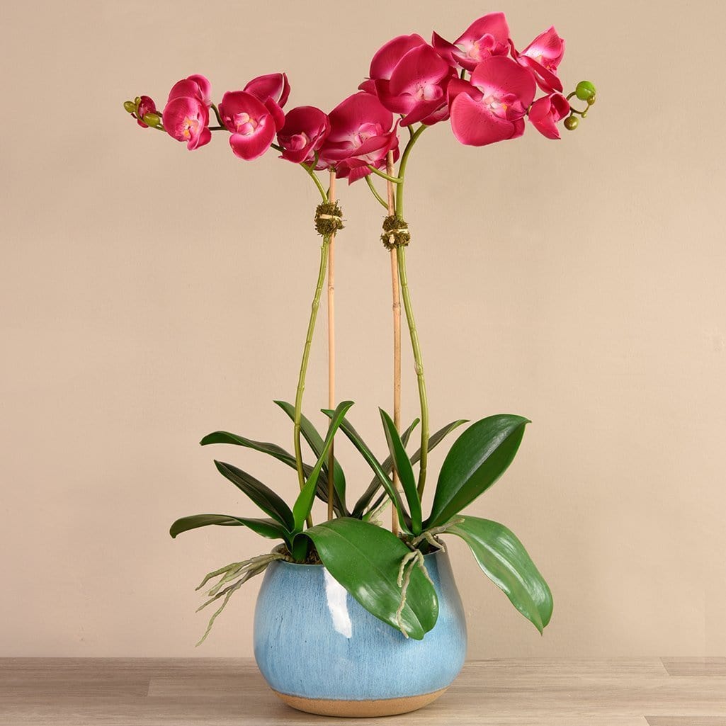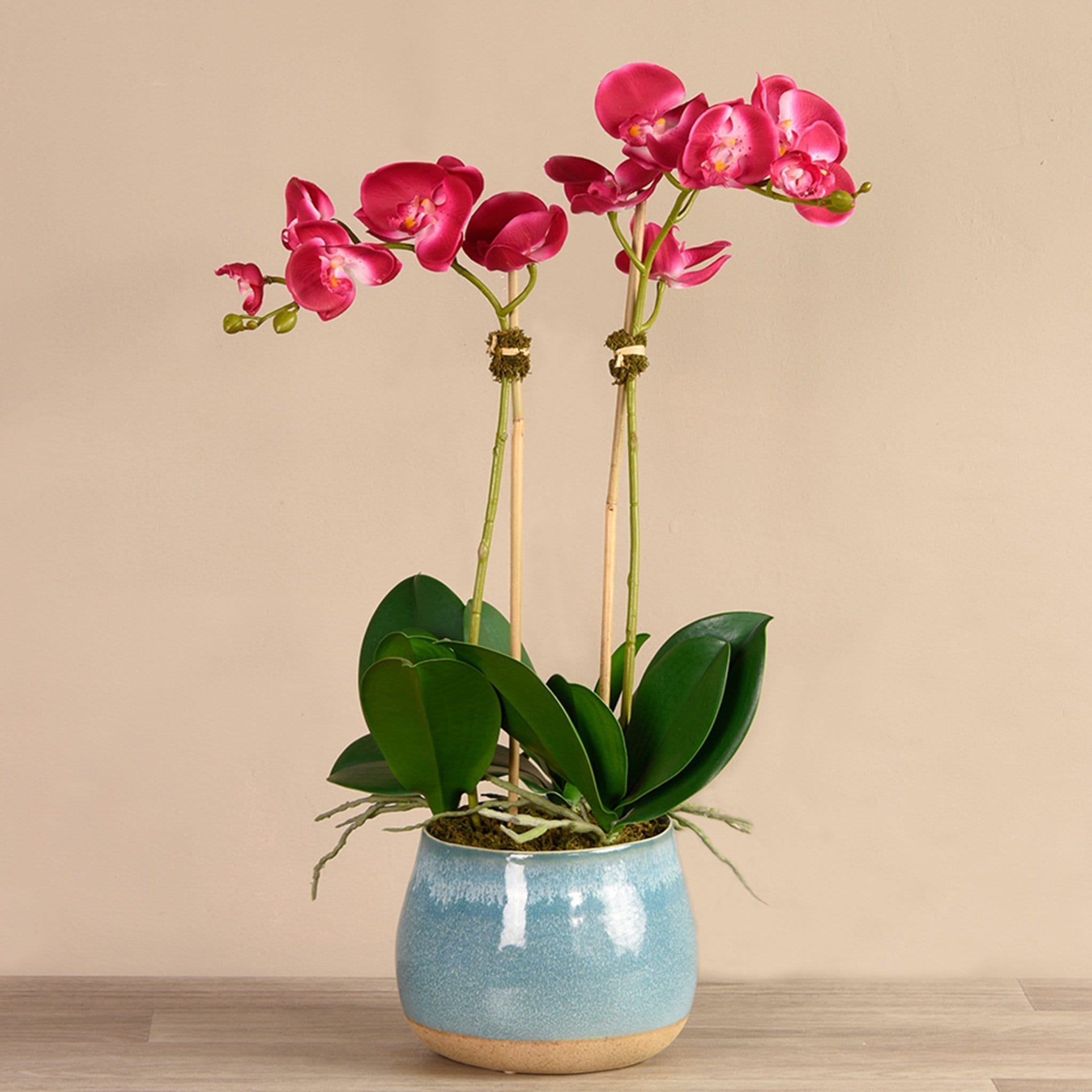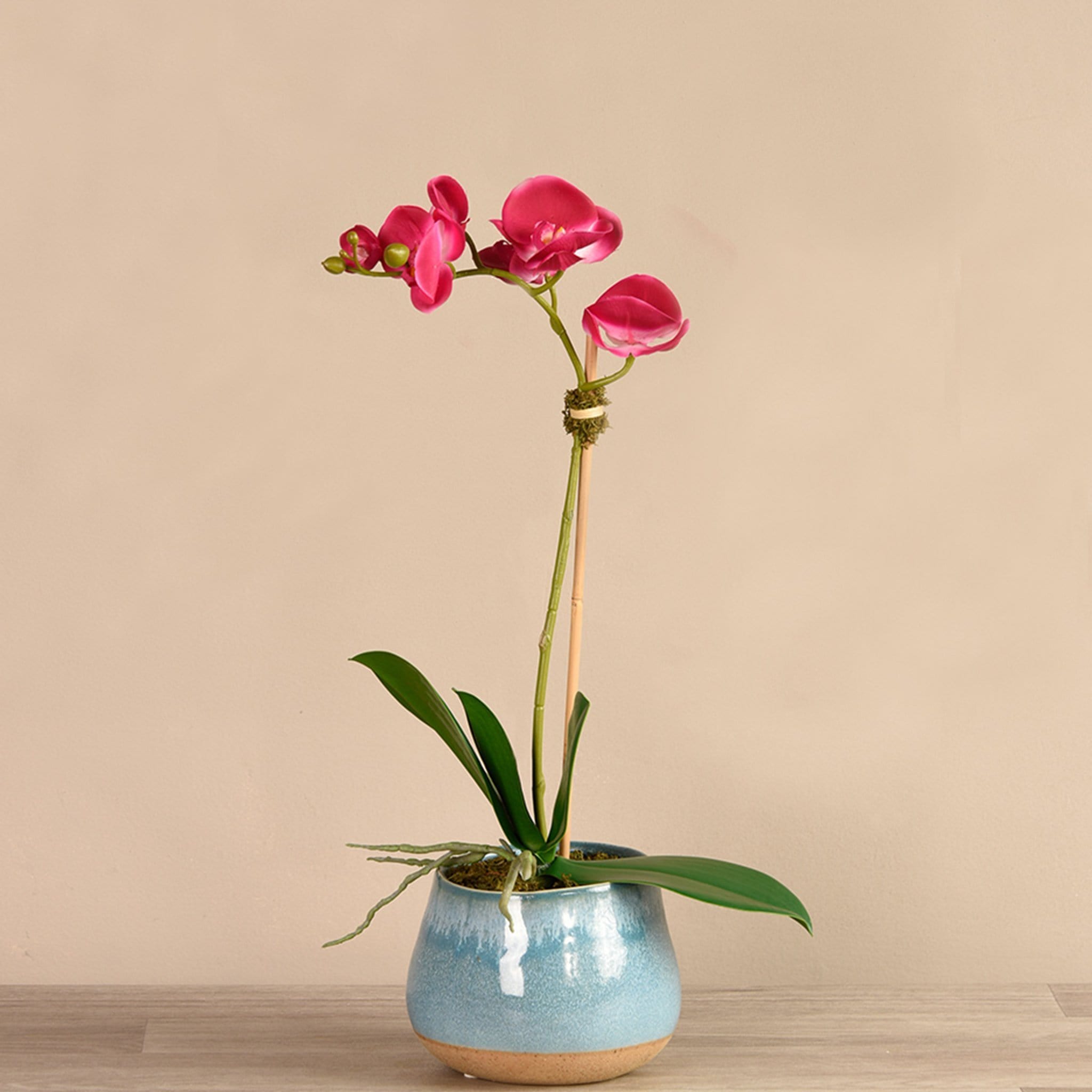 تشكيلة زهور الأوركيد من بلومر بتصميم مستوحى من سحر صحراء نيو مكسيوكو، مع مزهرية سيراميكية بديعة باللون الوردي الترابي. يمكنك وضع هذه التشكيلة على حافة النافذة أو الشرفة لتبعث بالدفء والراحة على منزلك. زهور الأوركيد تصنع من أجود الخامات على أيدي منسقي زهور متخصصين بحسب الطلب، وتتميز بمظهر وملمس مماثلين للزهور الطبيعية.